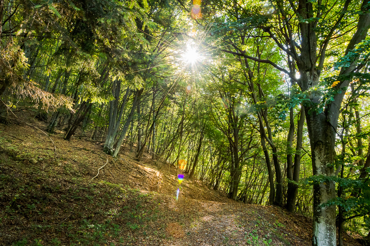 Eine Holzbrücke bringt uns über den Trudner Bach und einige steile Stufen aus dem Bachbett empor. Anschließend wandern wir teilweise über einen alten Saumweg – sichtbar an der Natursteinpflasterung – stetig recht Schweiß treibend, durch Buchenwald empor. Nach einem Bildstock kommen wir bei drei markigen, bereits Herbst bunten Buchen vorbei. Der Wanderweg wird nun etwas gemütlicher.