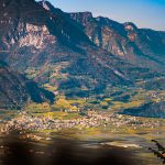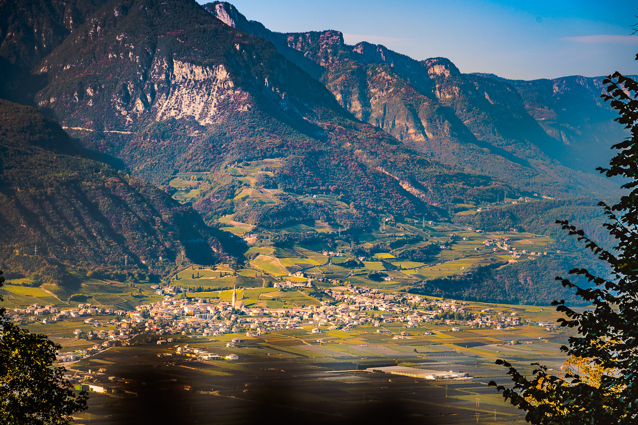Lehnt man sich über den Holzzaun der Straße vor dem Kloster dann reicht der Blick fast über das gesamte Etschtal, von der Salurner Klause über dem Kalterersee nach Bozen. Eingerahmt wird der Talblick von den mächtigen Berge der Ortlergruppe und Brentagruppe. Leider ist der Weitblick heute nicht ganz so klar.