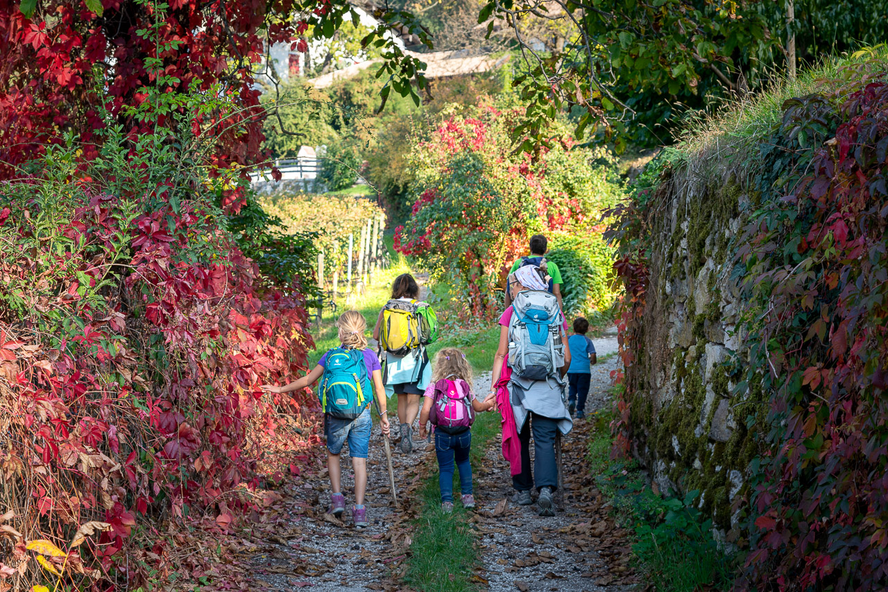 Weinberge, Kastanienbäume, der Ansitz des Weingutes Barthenau-Hofstätter, der Ansitz des Weinguts Gottardi, dann das Mazoner Kirchlein, an das wir eine besondere Erinnerung haben und weiter zum Kuckuckshof – dieses Wanderwegstück ist an Weinberg-Herbststimmung fast nicht zu überbieten. Nach dem Kuckuckshof, unter einem mächtigen Kastanienbaum, schweift der Blick nochmals hinauf auf die Kanzel bevor wir weniger aussichtsreich, teilweise mit Geländer versichert, zum Trudner Bach hinein mrschieren.