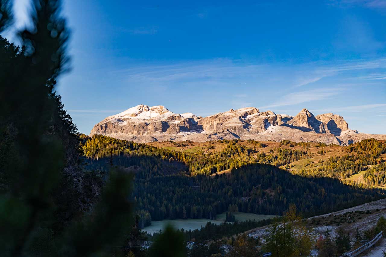 Nun bleibt uns nichts anderes übrig, als entlang der Armentarola-Piste weiter abzusteigen – vorbei an uralten Zirbelkiefern, mit Blick auf die sich immer stärker aufschaukelnde Enrosadira (ladinisch für das Dolomitenglühen). Nur langsam kommen wir voran. Warum? Eh klar, oder?