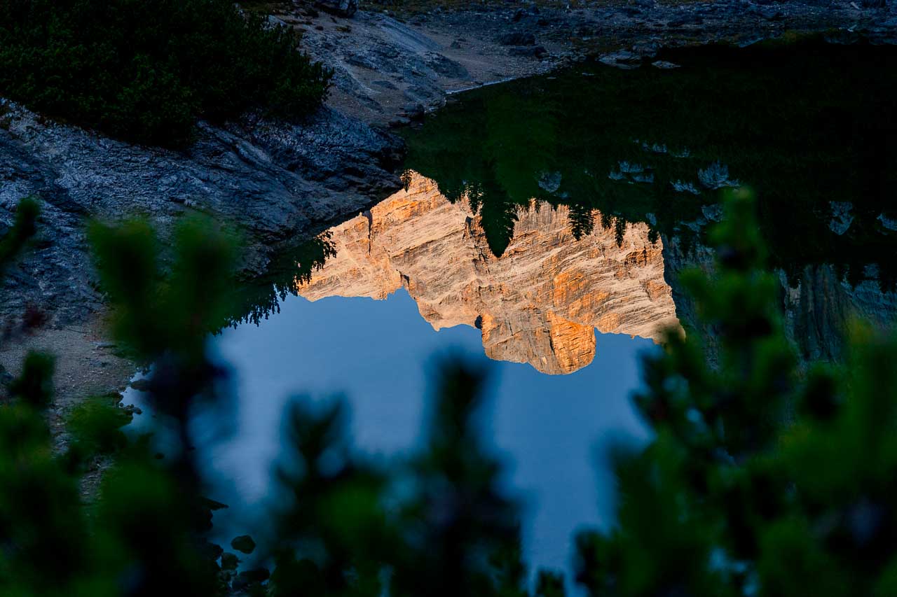 Die Spiegelung im heute fast windstillen See ist nahezu perfekt. Natürlich halten wir uns etwas länger auf. Ein Bergsee dieses ästhetischen Kalibers bedarf Zeit! Eine gute Stunde dauert es, bis wir den See von allen Seiten erkundet haben. Wahrscheinlich ist hier im Sommer die Hölle los. Zeitzeugen in Form unzähliger Tempo-Taschentücher hinter einem großen Felsblock belegen das leider deutlich. Blöderweise sind diese Dinger erstaunlich resistent und zersetzen sich nur sehr langsam – selbst im Freien. Normales Toilettenpapier, würde denselben Zweck erfüllen und wäre für die Umwelt um ein Vielfaches besser. Schade, dass nicht jeder Wanderer daran denkt.