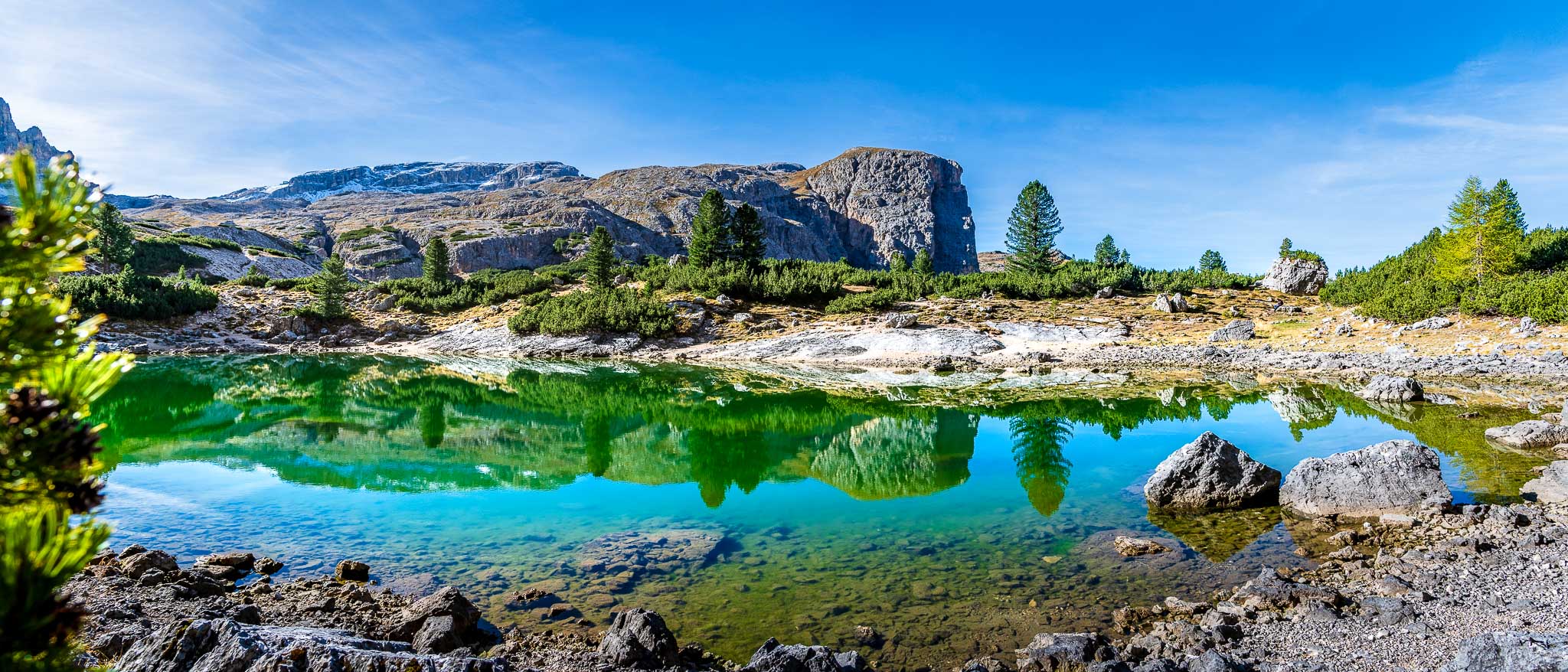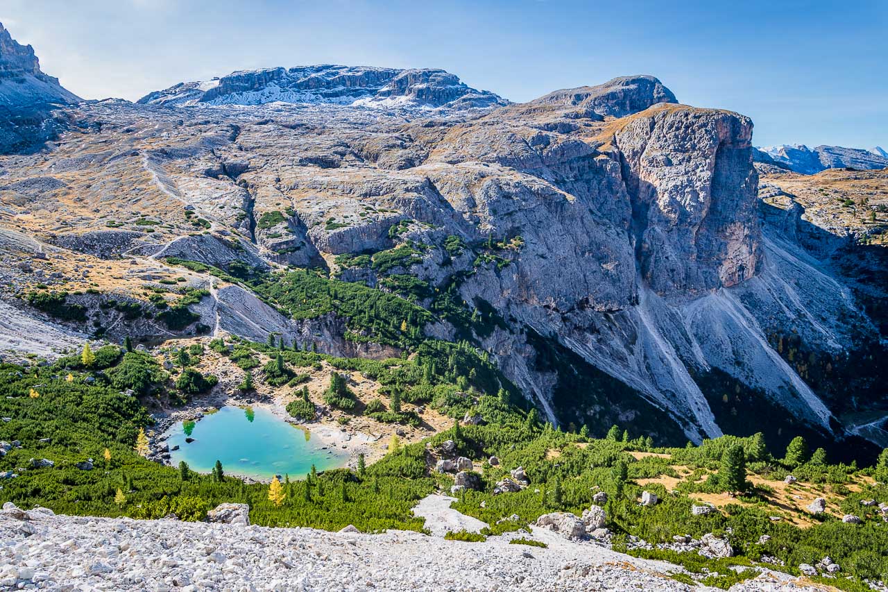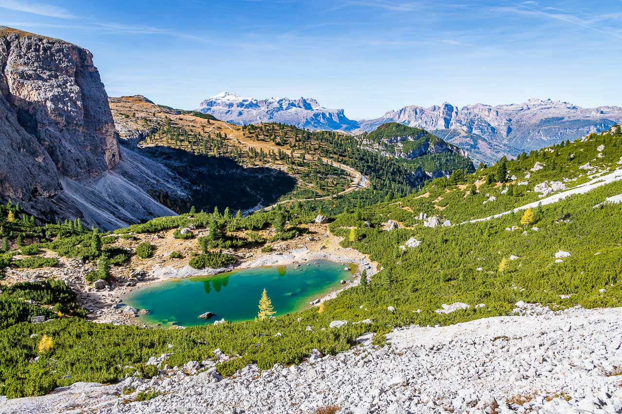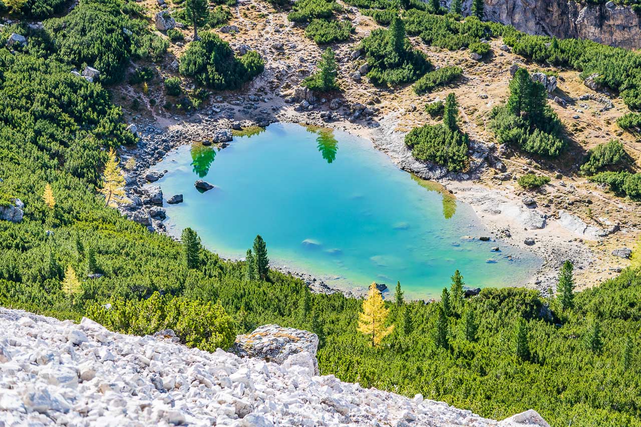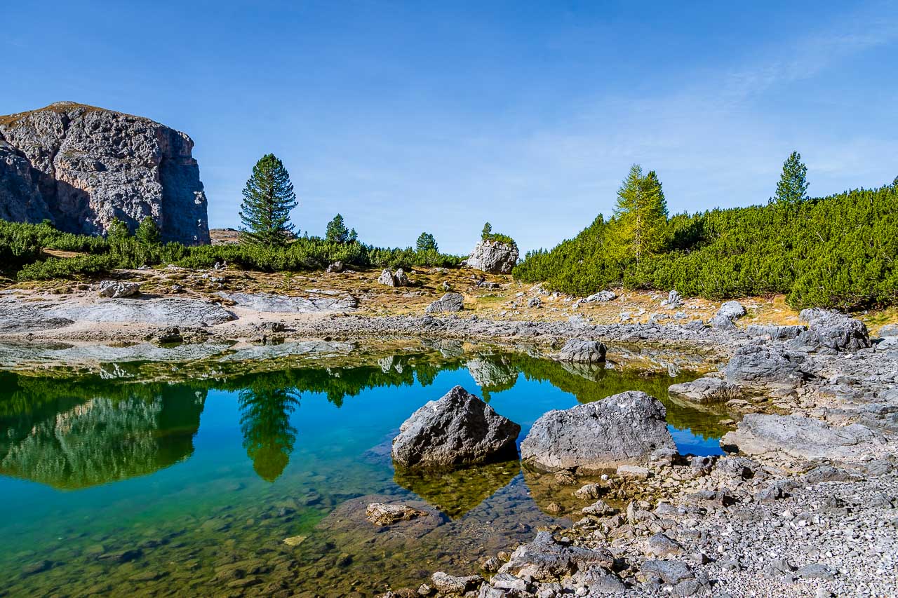 Der Lagazuoi-See besticht nicht nur durch sein smaragdgrün leuchtendes Wasser, sondern auch durch seine grüne Umgebung, die von Latschen, Kiefern und einzelnen Lärchen geprägt ist. Das ist insofern etwas Besonderes, als wir uns hier mitten im felsigen Dolomitengelände befinden – und nur die Terrasse, auf der der Lech de Lagaciò liegt, eine kleine Insel des Grünen bildet. Darüber türmt sich der weiße Schutthang der Pize Fanes, darunter fällt die Felswand steil zur Scortoni Hütte ab.