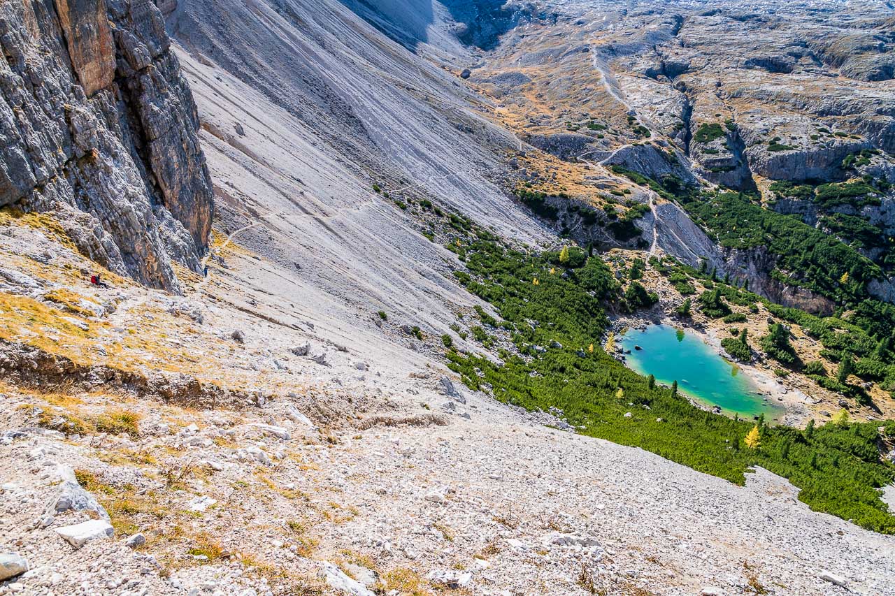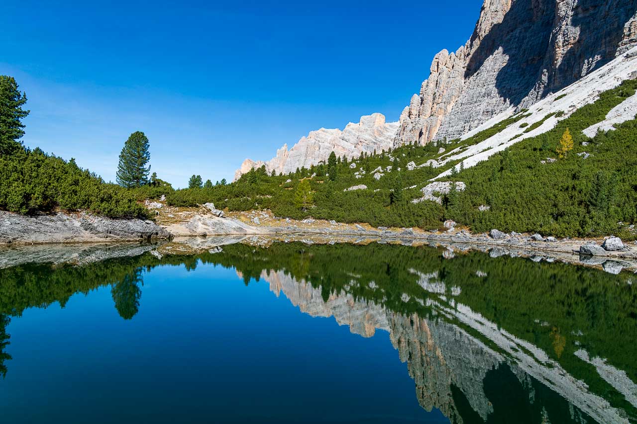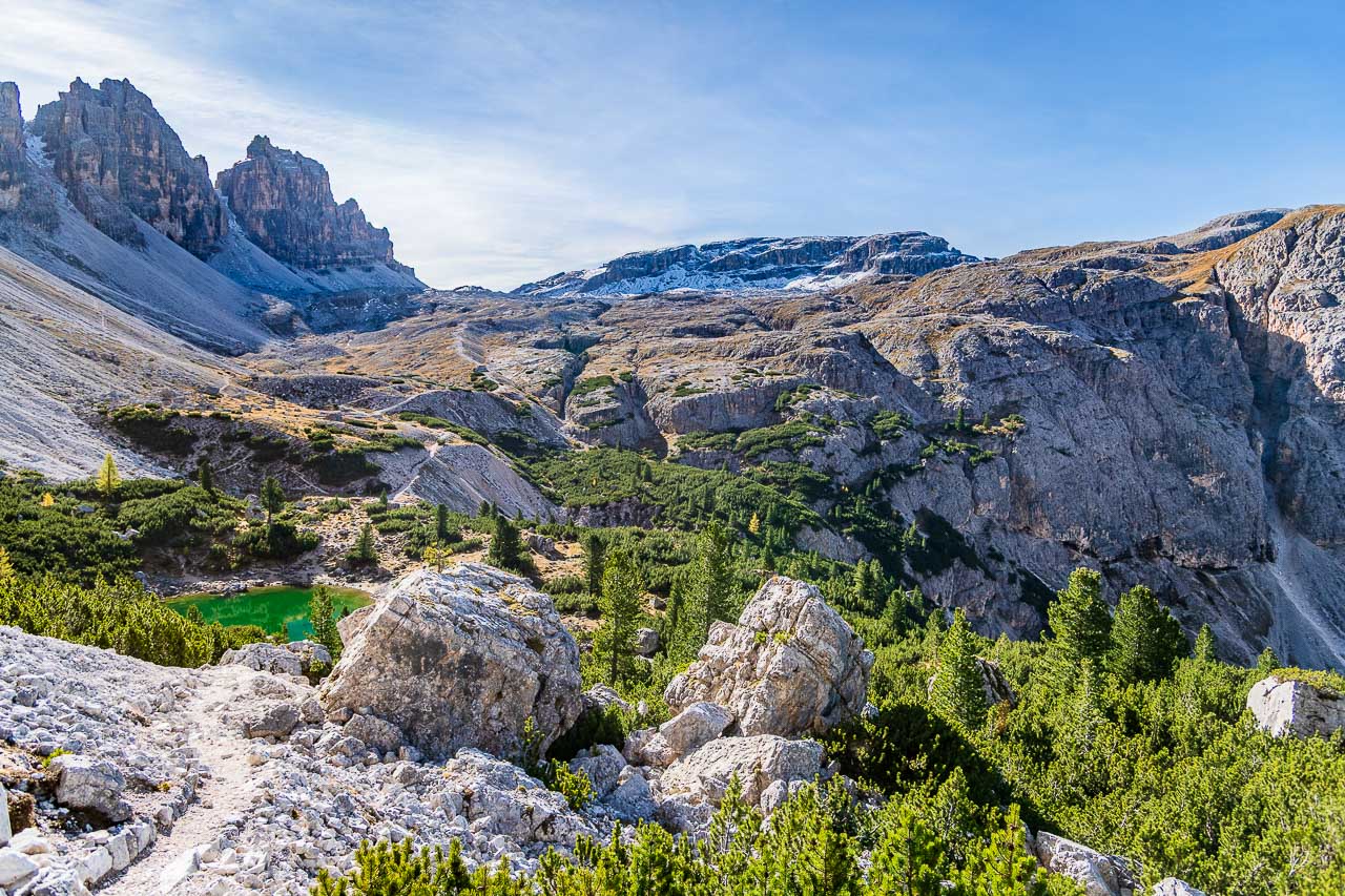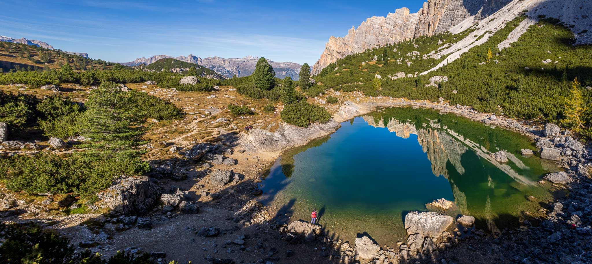 Der Lagazuoi-See besticht nicht nur durch sein smaragdgrün leuchtendes Wasser, sondern auch durch seine grüne Umgebung, die von Latschen, Kiefern und einzelnen Lärchen geprägt ist. Das ist insofern etwas Besonderes, als wir uns hier mitten im felsigen Dolomitengelände befinden – und nur die Terrasse, auf der der Lech de Lagaciò liegt, eine kleine Insel des Grünen bildet. Darüber türmt sich der weiße Schutthang der Pize Fanes, darunter fällt die Felswand steil zur Scortoni Hütte ab.