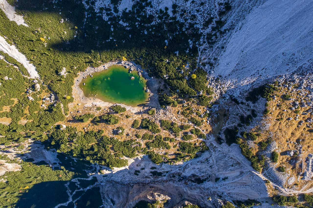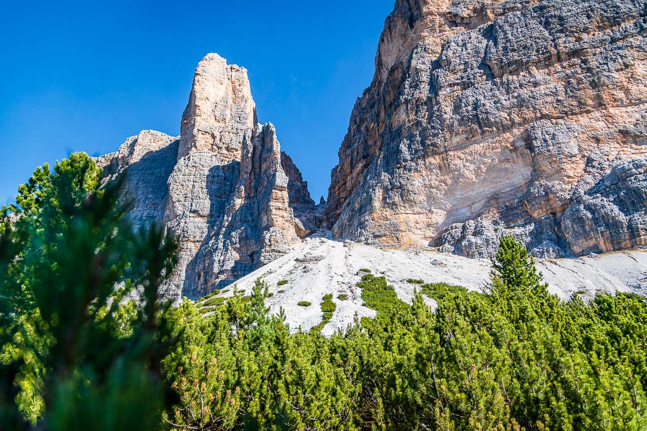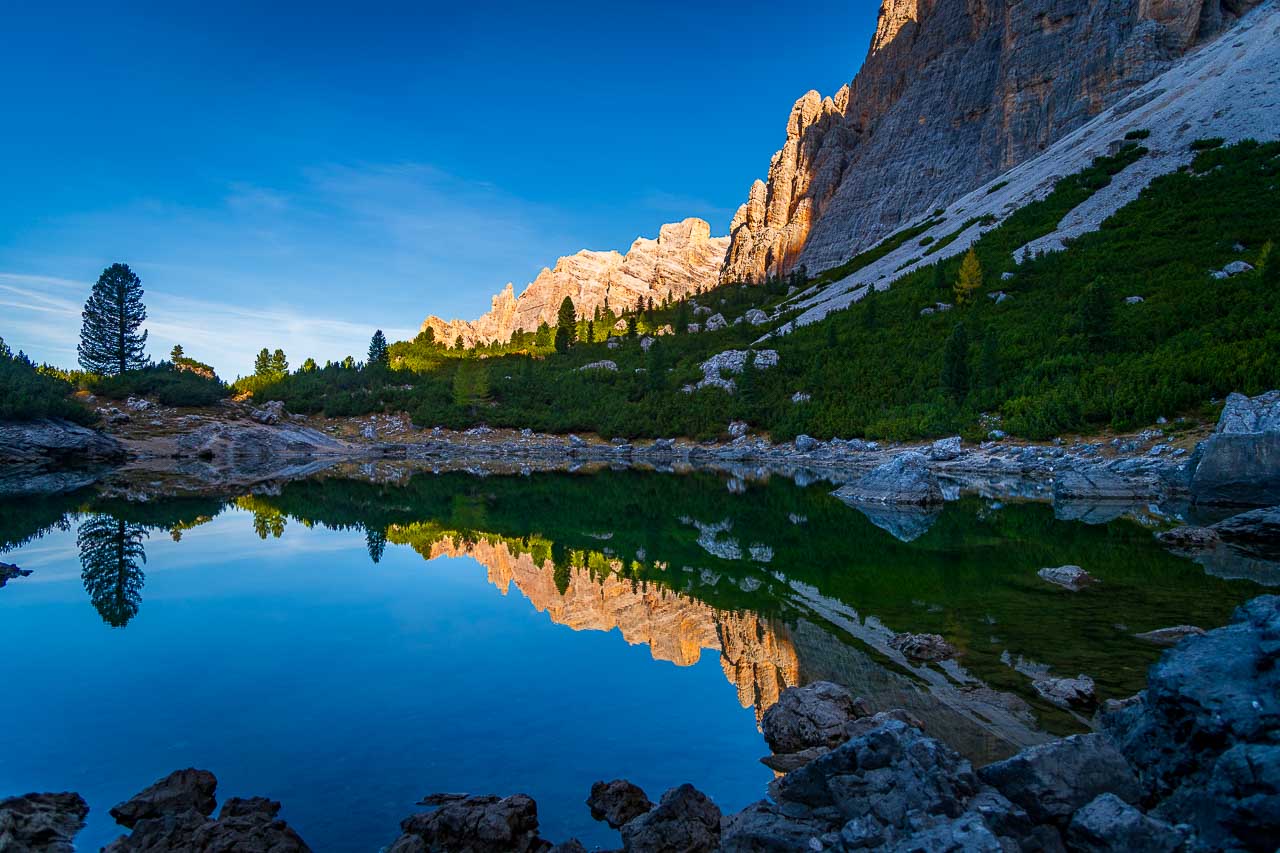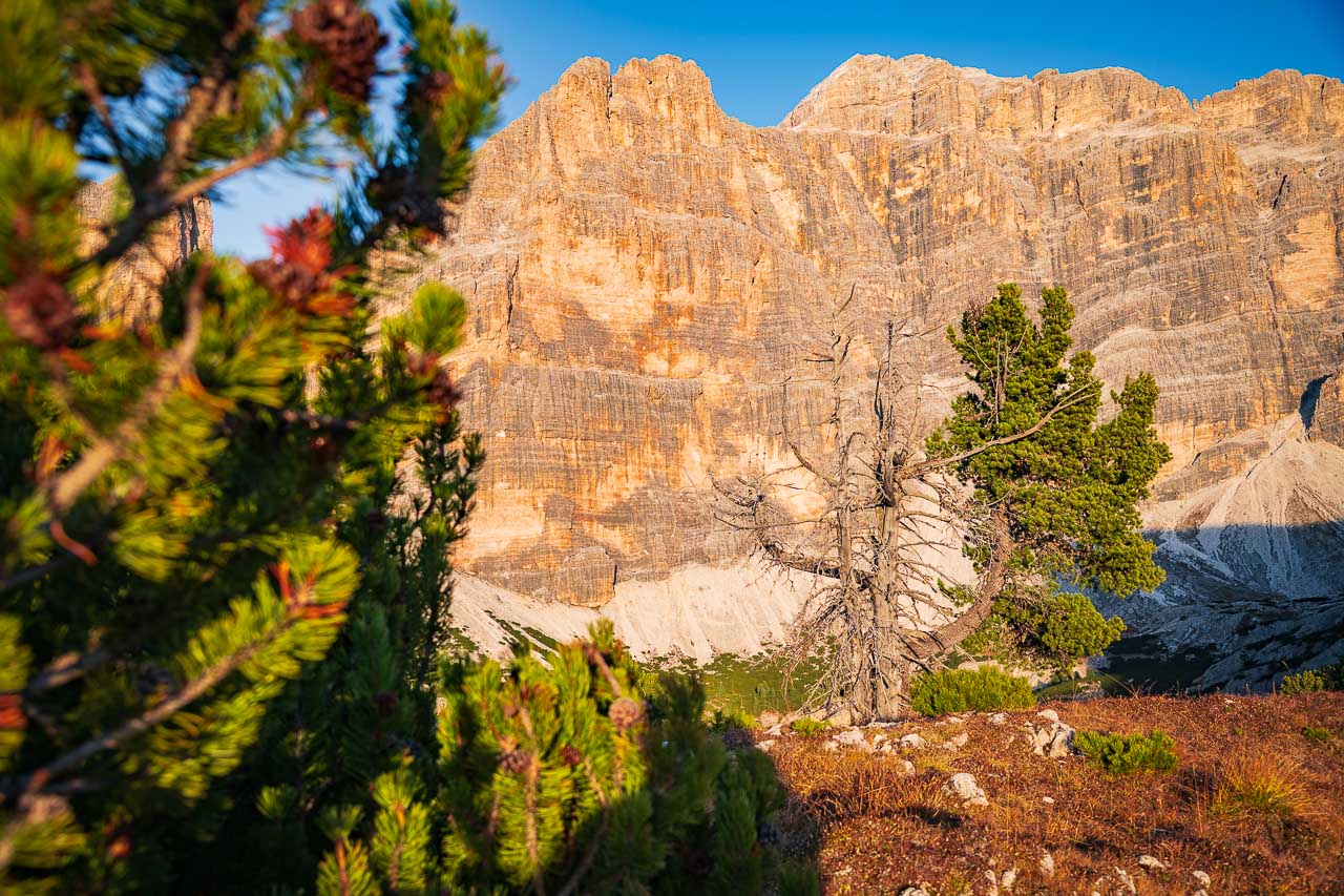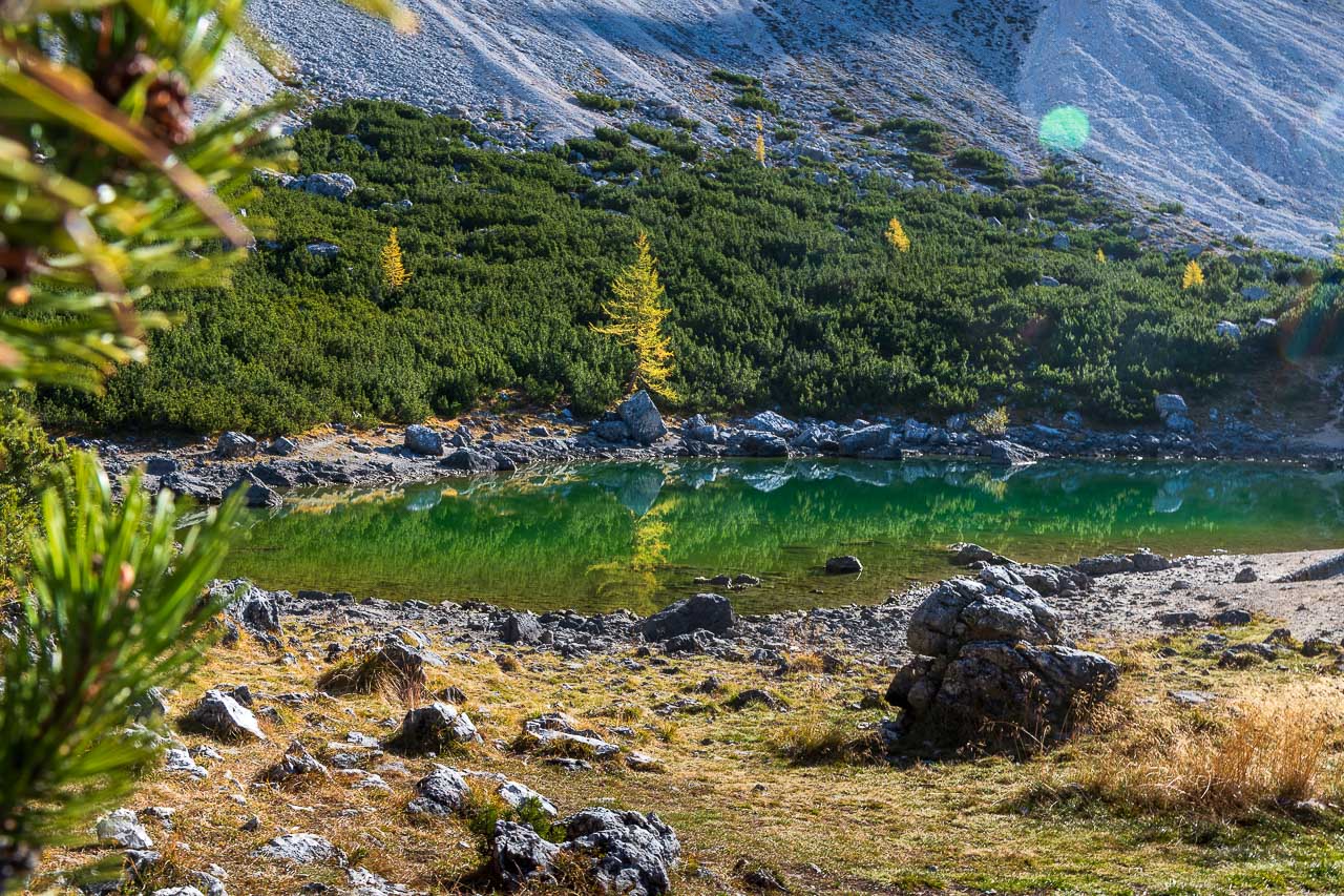 Der Lagazuoi-See besticht nicht nur durch sein smaragdgrün leuchtendes Wasser, sondern auch durch seine grüne Umgebung, die von Latschen, Kiefern und einzelnen Lärchen geprägt ist. Das ist insofern etwas Besonderes, als wir uns hier mitten im felsigen Dolomitengelände befinden – und nur die Terrasse, auf der der Lech de Lagaciò liegt, eine kleine Insel des Grünen bildet. Darüber türmt sich der weiße Schutthang der Pize Fanes, darunter fällt die Felswand steil zur Scortoni Hütte ab.