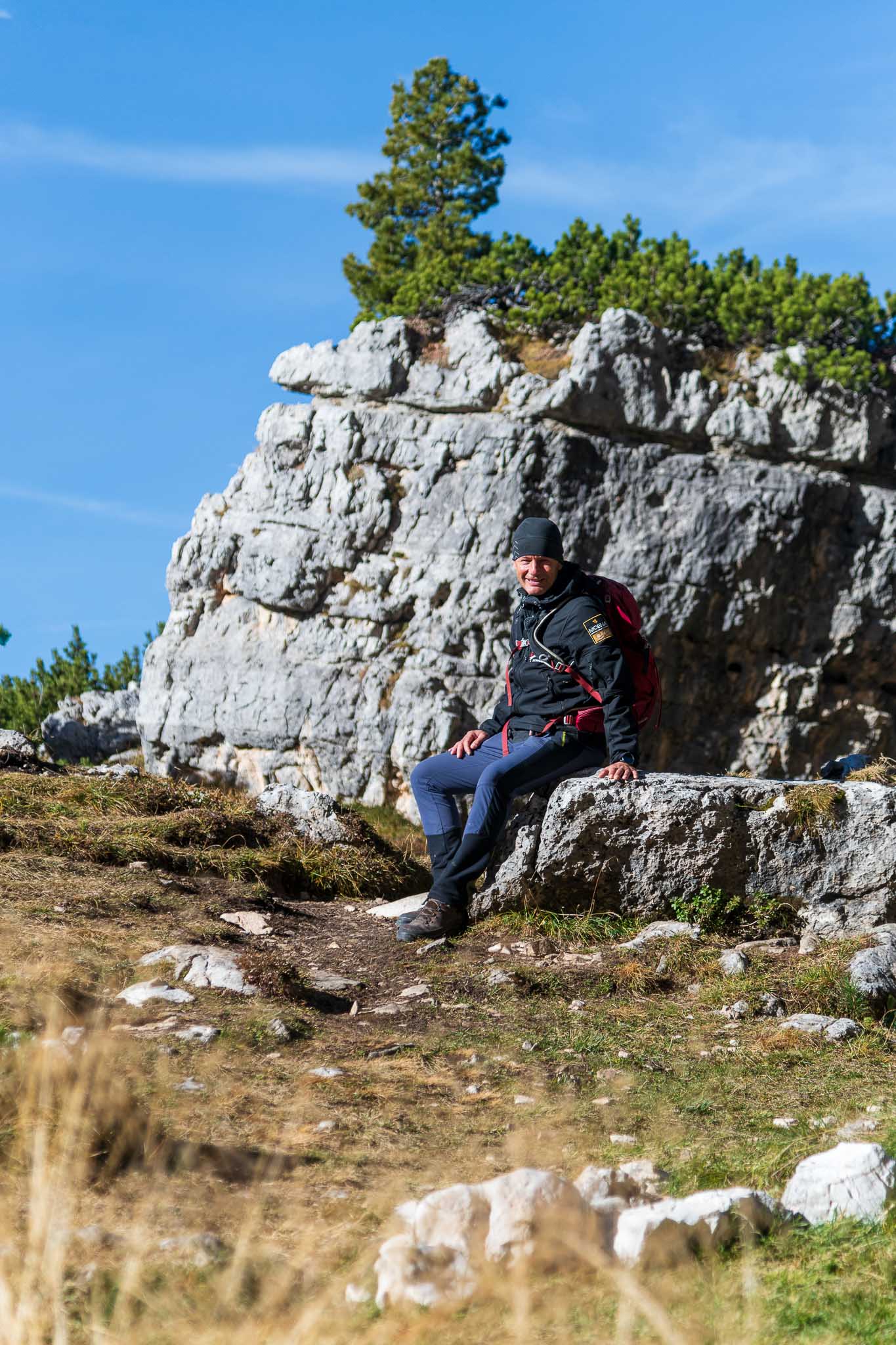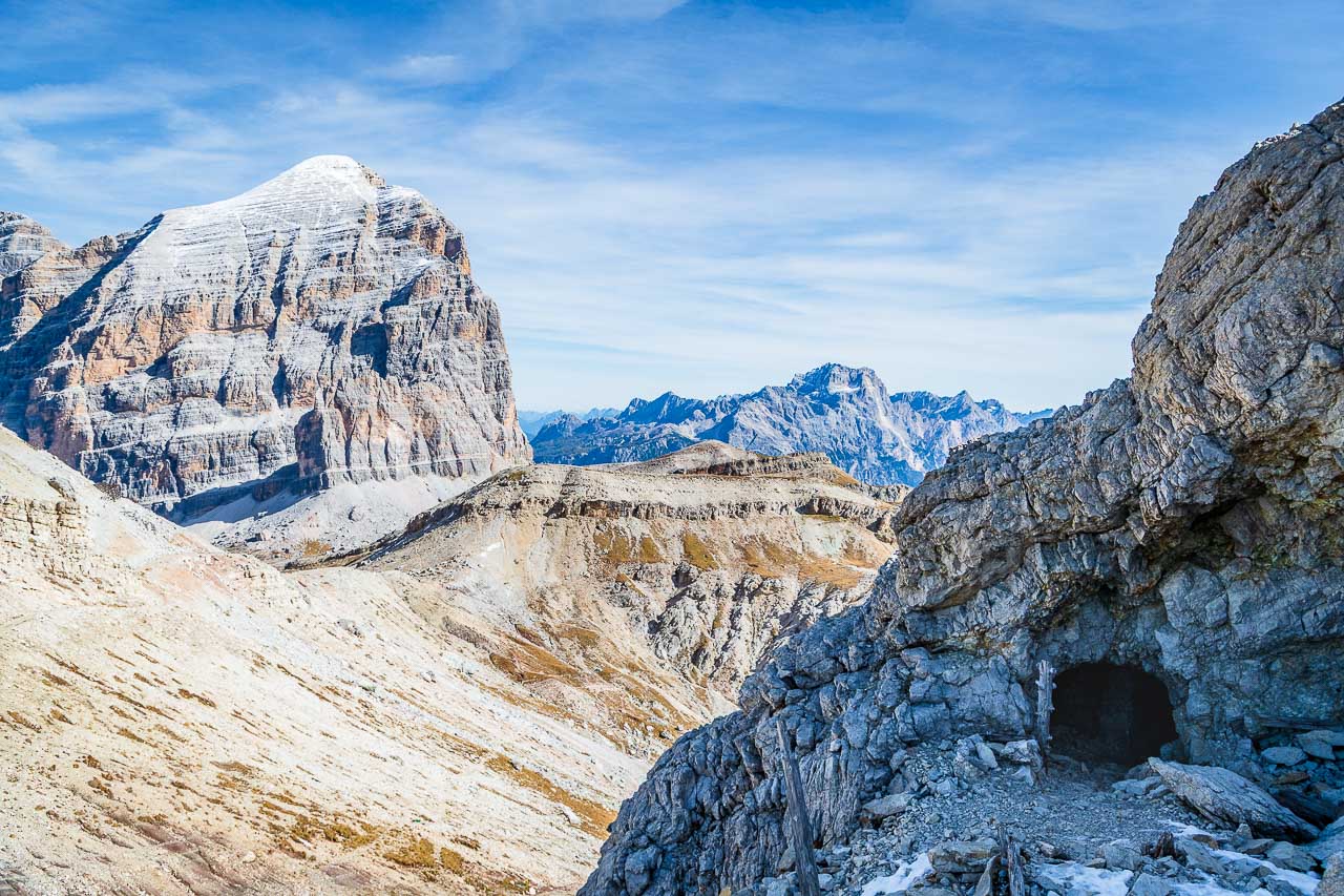 Zum Schluss wird es wieder steil, doch in angenehmen Serpentinen. Wir müssen etwas aufpassen, denn der Steig ist stellenweise vereist. Links davon ein Freilichtmuseum der besonderen Art – eines, das vom Ersten Weltkrieg zeugt. Der Berg wurde hier regelrecht wie ein Schweizer Käse durchlöchert, um Stollen für Stellungen und Sprengkammern anzulegen.