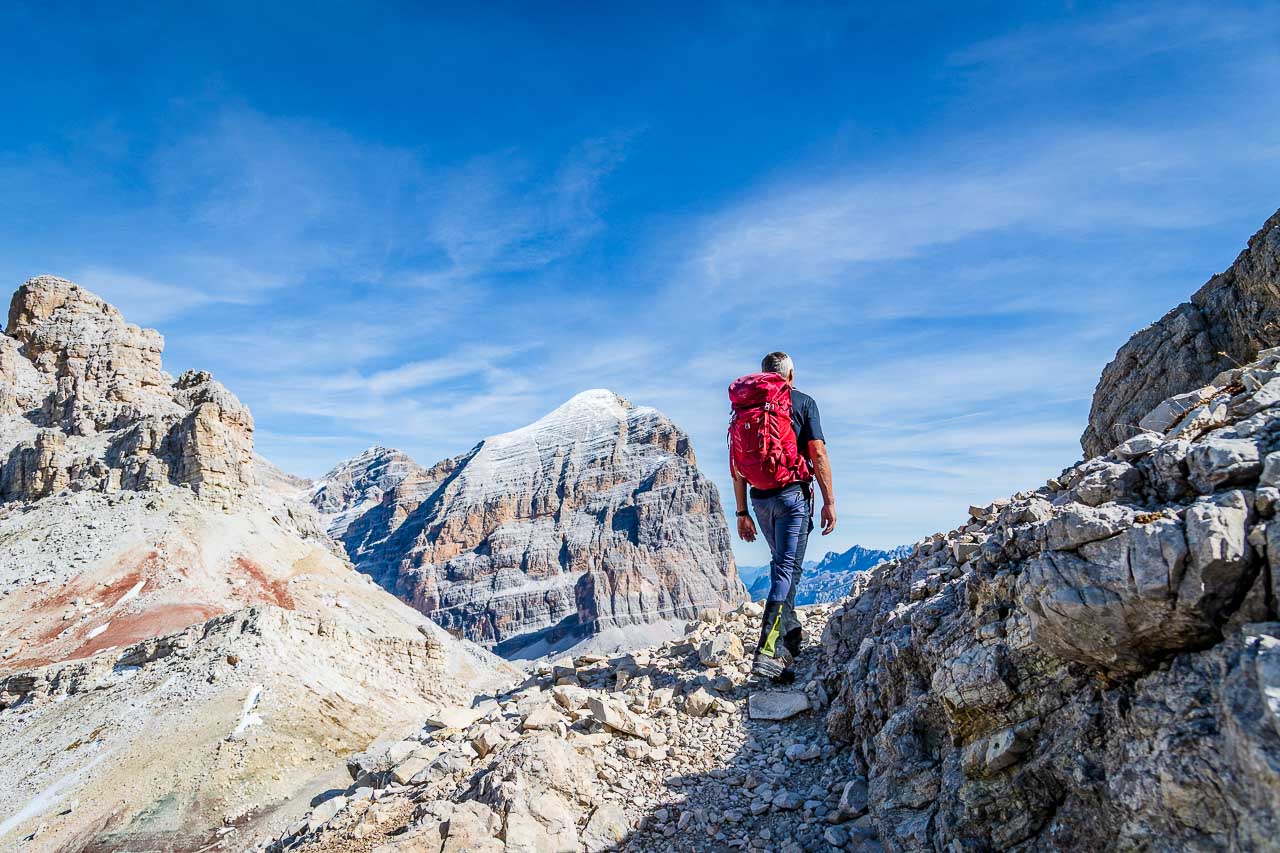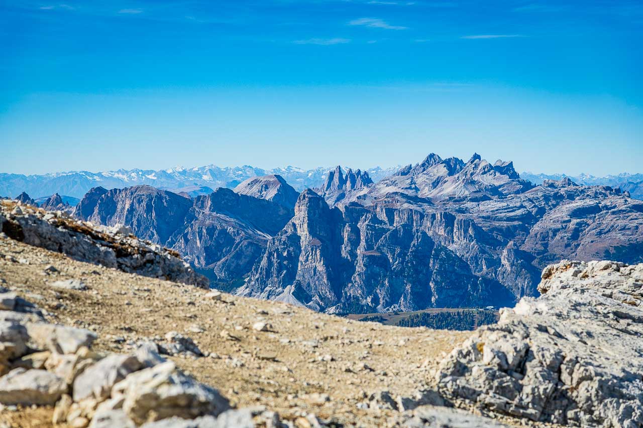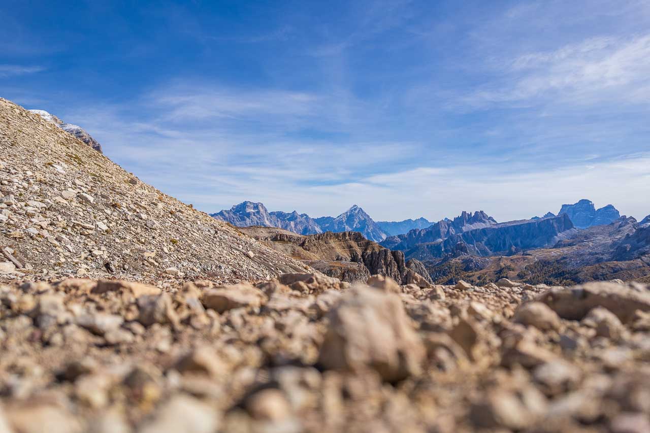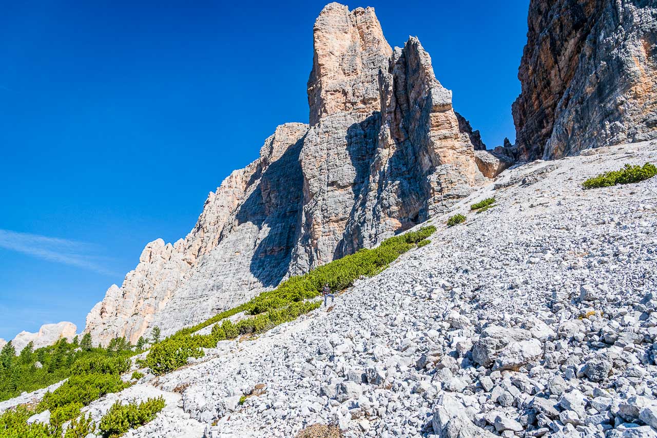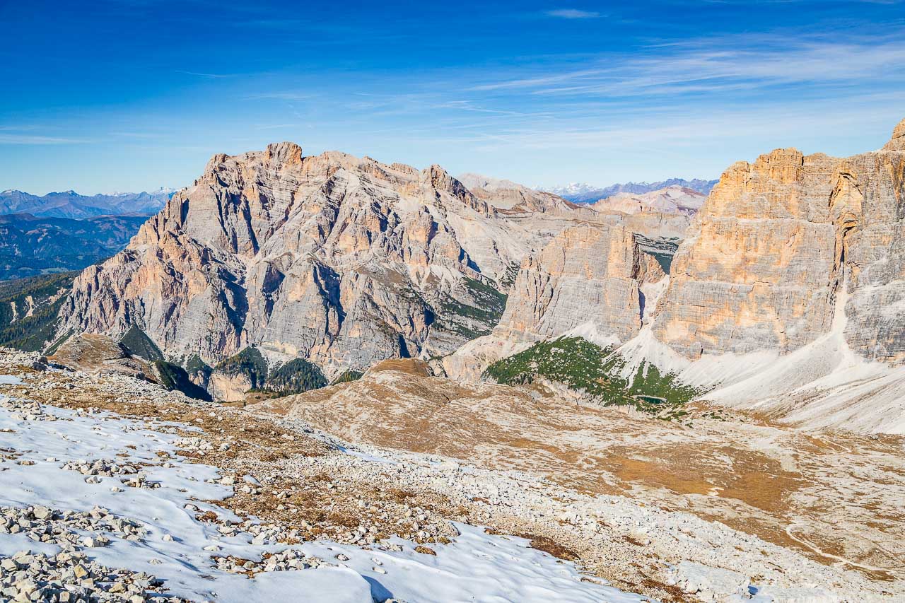 Wow – was für ein Anblick! Wie zu erwarten, begeistert der Blick über die Scharte hinweg auf die Ampezzaner Dolomiten: Tofane, Sorapis, Nuvolaugruppe, dazu Antelao, Pelmo und Civetta – was will der Bergmensch mehr?