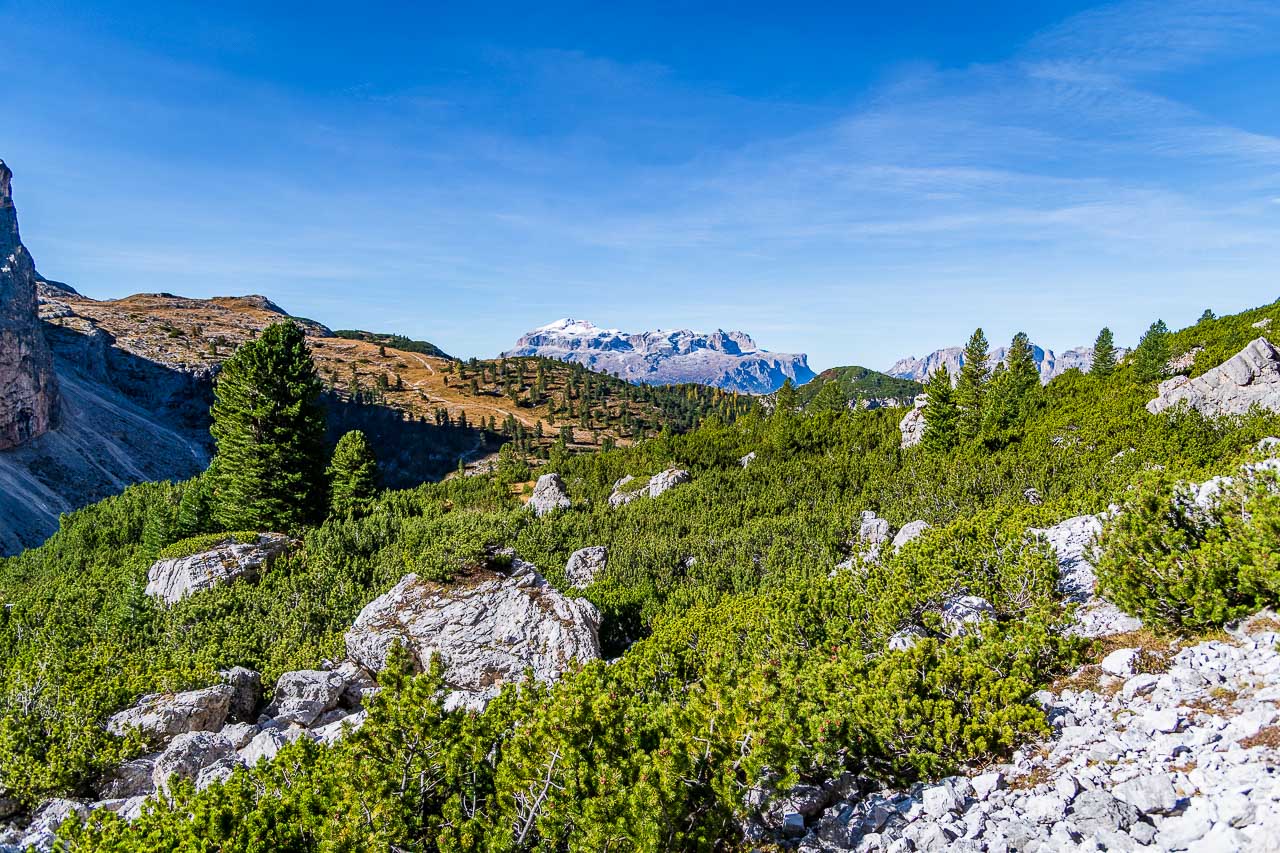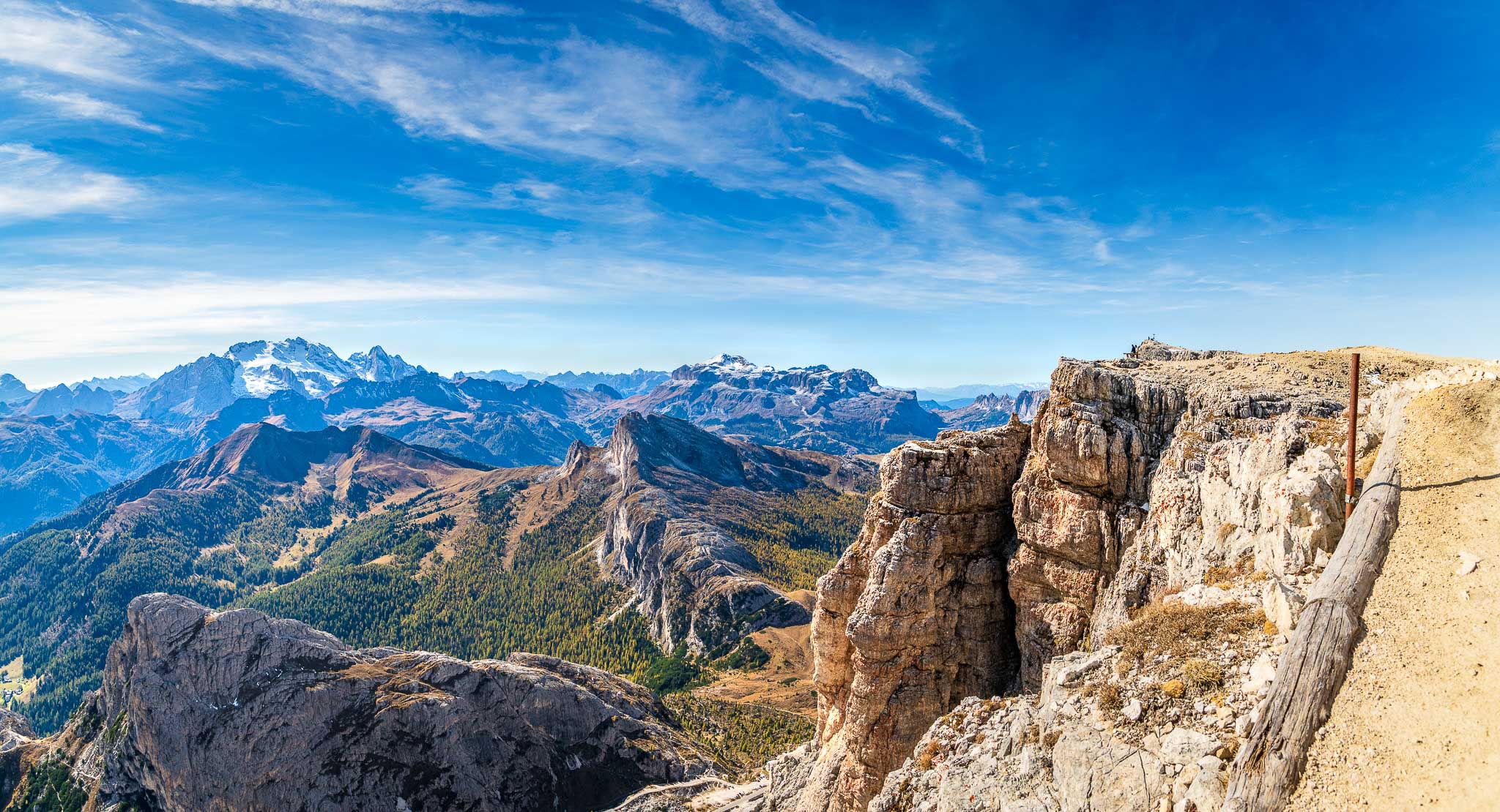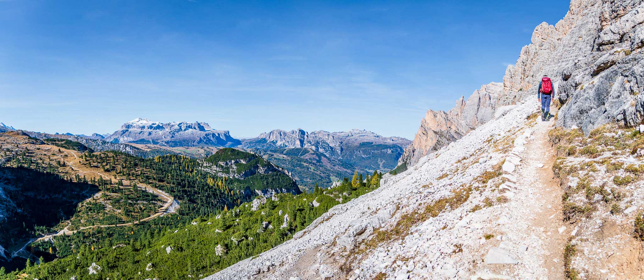 Steil zieht sich der neue Bergsteig in engen Kehren vom See ausgehend empor. Mit jedem Höhenmeter wird die Aussicht großartiger, und das nicht nur auf den Naturpark Fanes-Sennes-Prags. Auch der Blick quer über das Gadertal hinüber zur Sellagruppe und zur Puezgruppe ist beeindruckend.