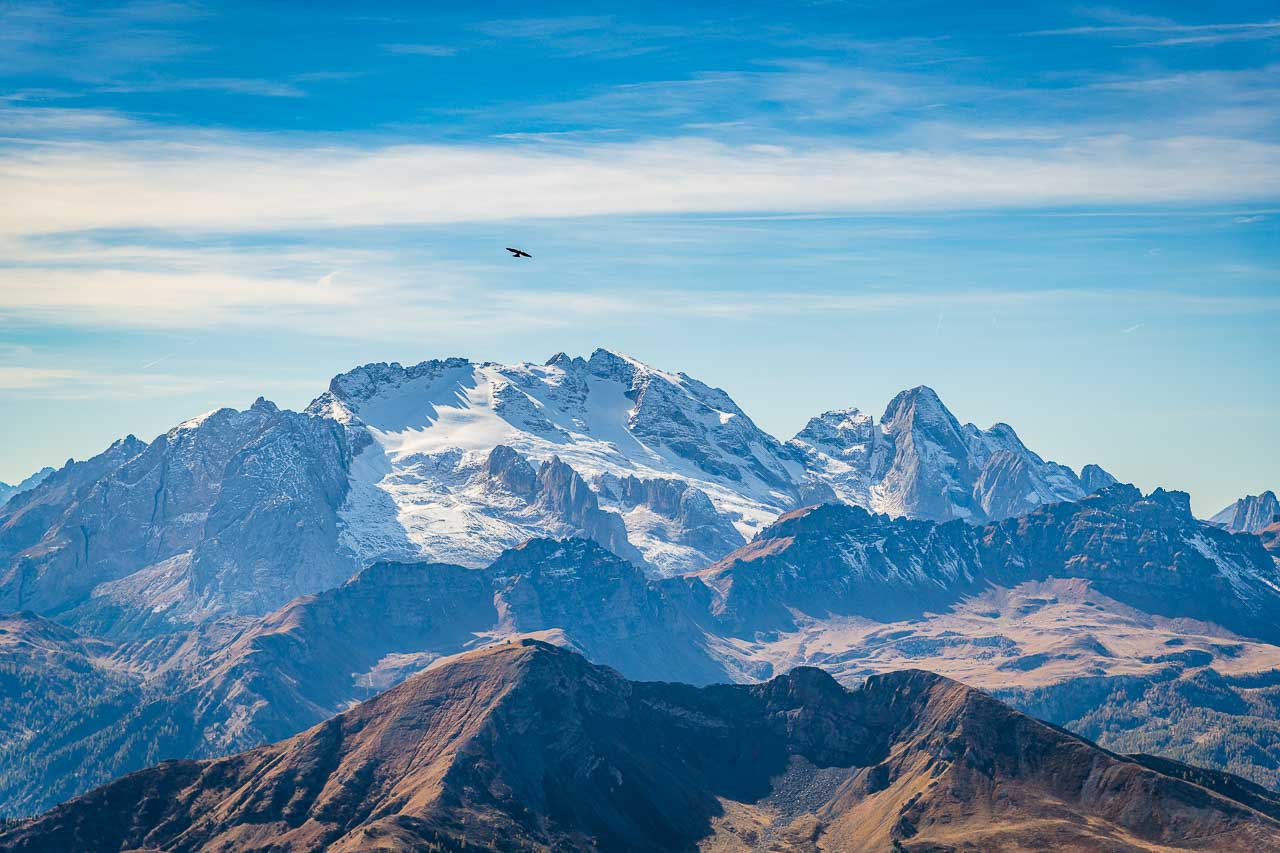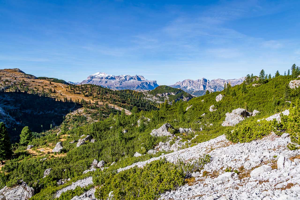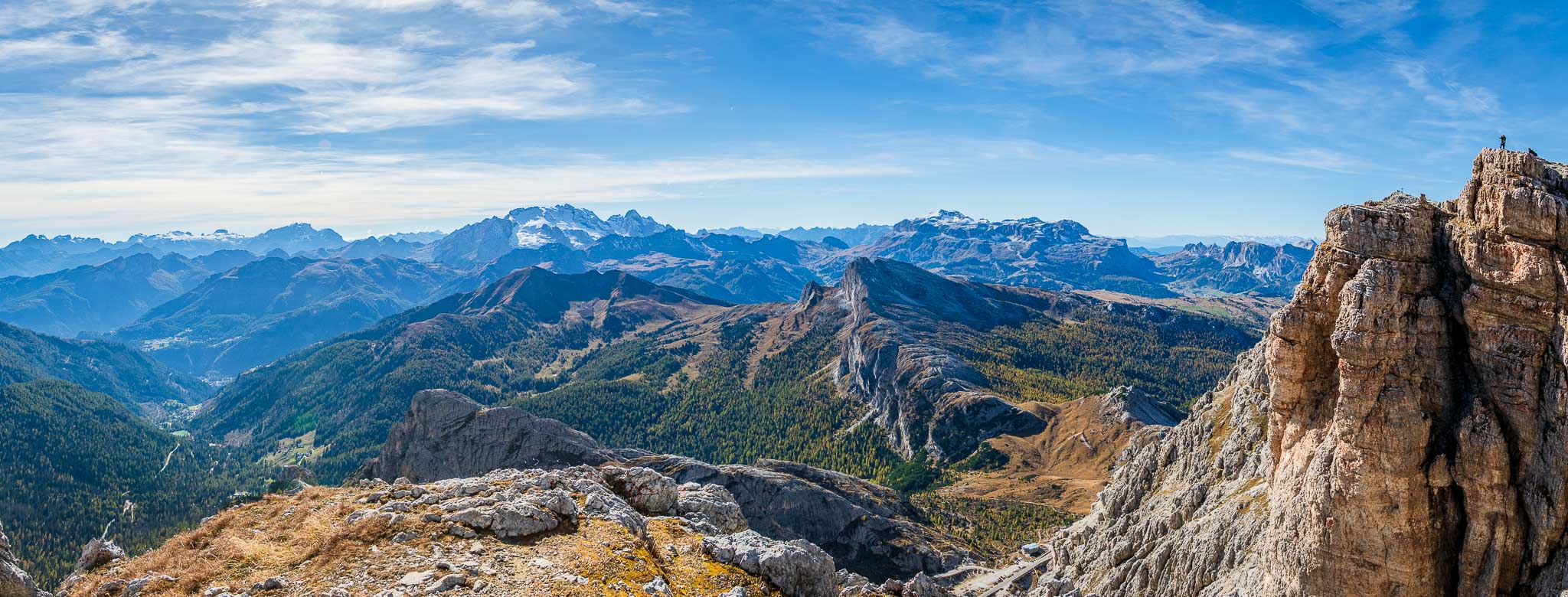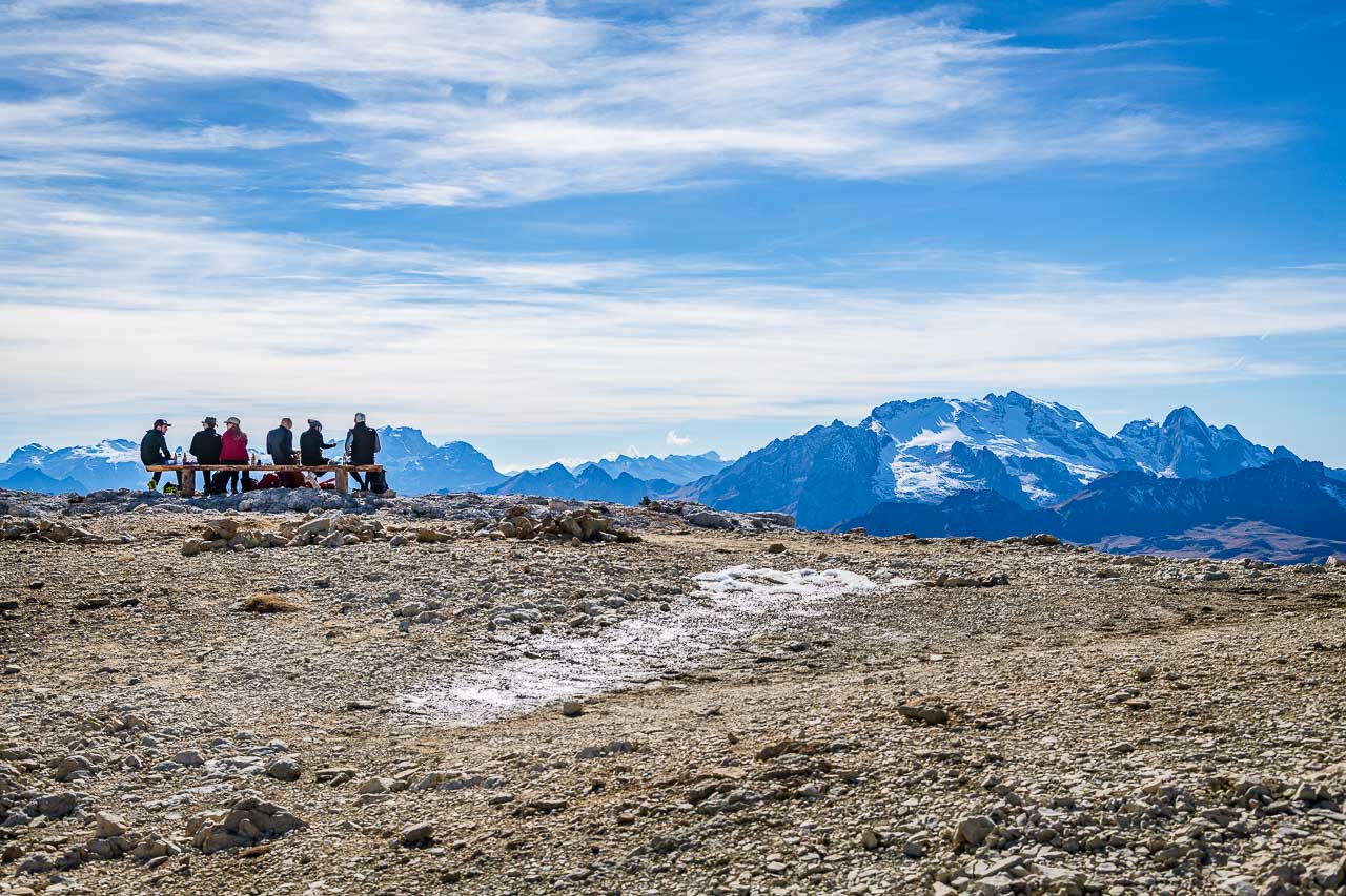 Wie schon vor 6 Jahren als wir über den Kaiserjägersteig aufgestiegen sind, genießen wir das Dolomitenpanorama. Geradeaus, hinter dem Blutberg Col di Lana, thront die weiße Königin der Marmolata– die Marmolata. Im Uhrzeigersinn drehend, im Vordergrund der Settsass, auf dem wir erst vor drei Wochen waren; dahinter der Sellastock mit dem Biz Boè, die Puezgruppe, die Geislerspitzen und das Gadertal mit dem Peitlerkofel in der Ferne. Direkt vor unserer Nase der Große Lagazuoi, daneben die Tofana di Rozes, weiter hinten die Sorapis-Gruppe und der Monte Antelao – der König der Dolomiten. Etwas näher rücken die markanten Cinque Torri und der Averau ins Bild, dahinter der Monte Pelmo, weiter rechts die Civetta, im Vordergrund der Hexenstein, dahinter die Pale di San Martino mit der Fradusta – und schon schließt sich der Kreis wieder bei der Marmolata.