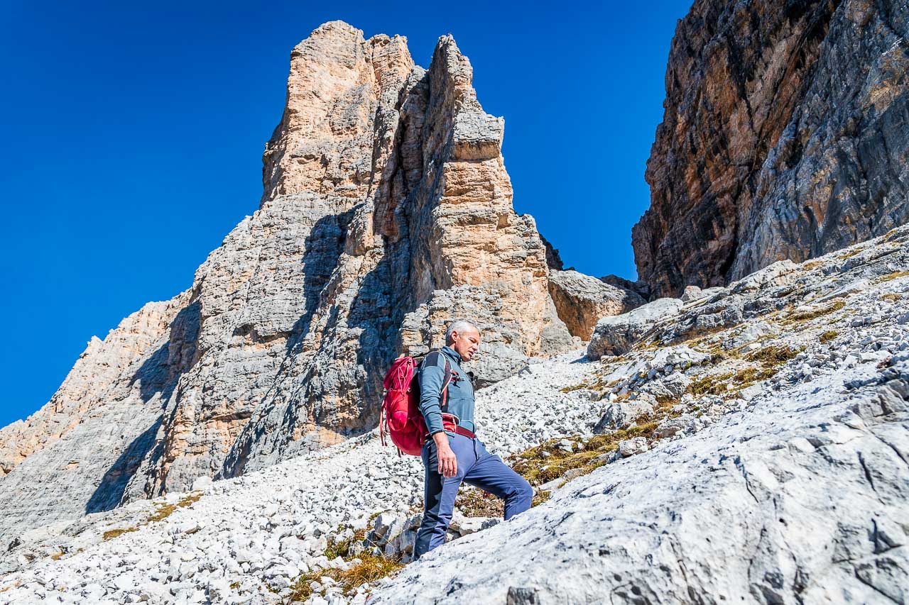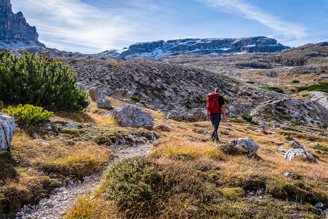 Und jetzt wird’s spannend: Wir müssen entscheiden, ob wir die ab hier beginnende Runde gegen oder mit dem Uhrzeigersinn gehen. Ich bin unschlüssig, denn ich weiß nicht, ab welcher Uhrzeit der Lagazuoi-See Sonne erhaschen wird. Andreas weist auf die zahlreichen Stufen im linken Steig hin: