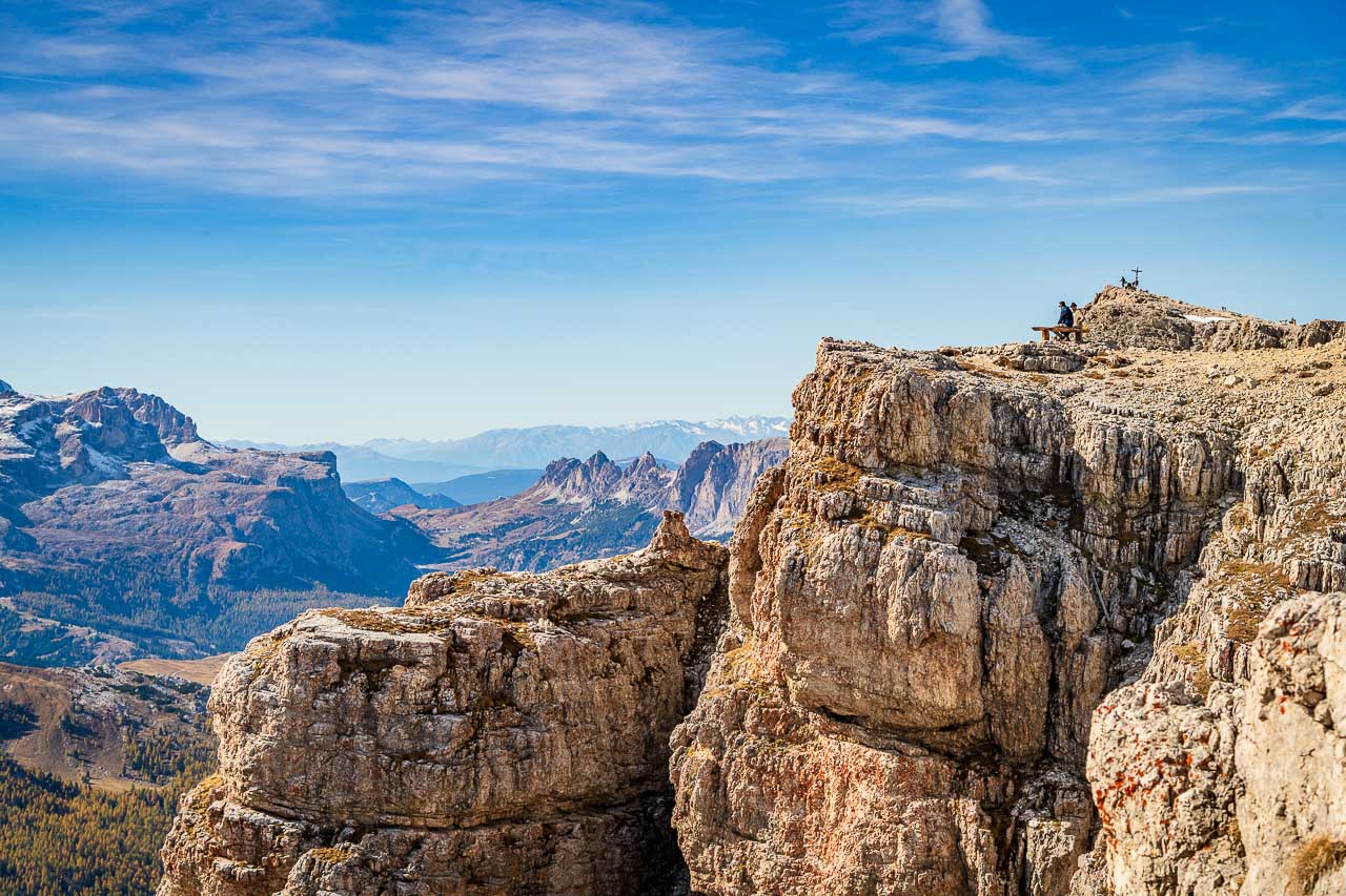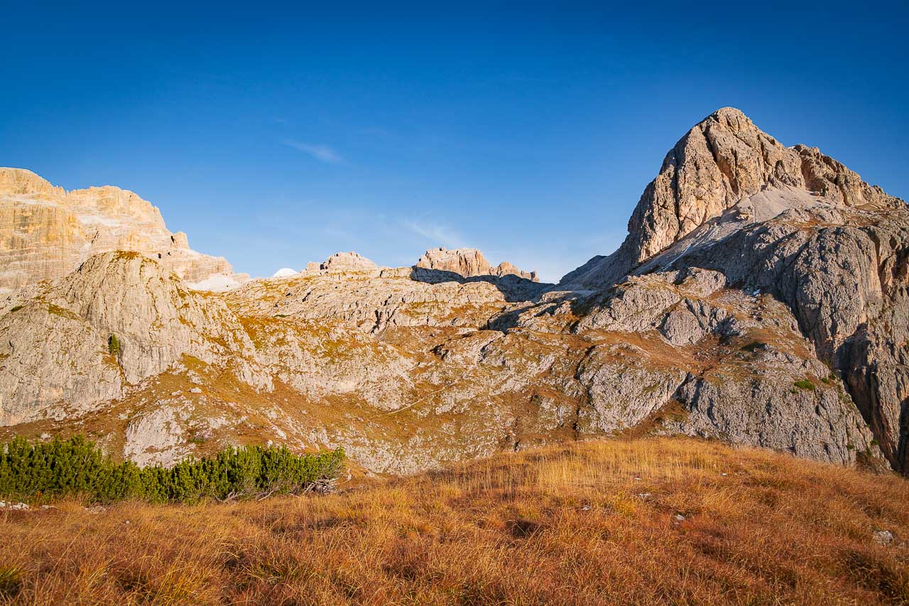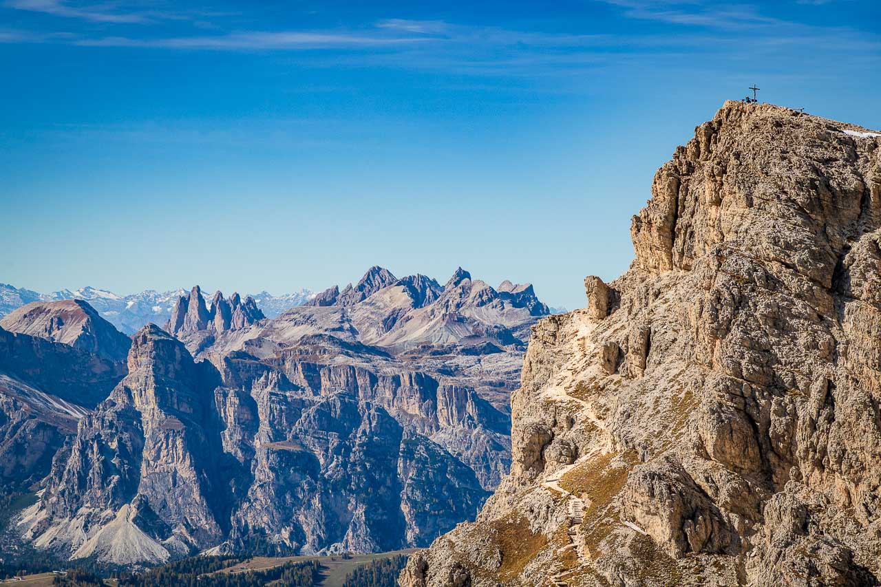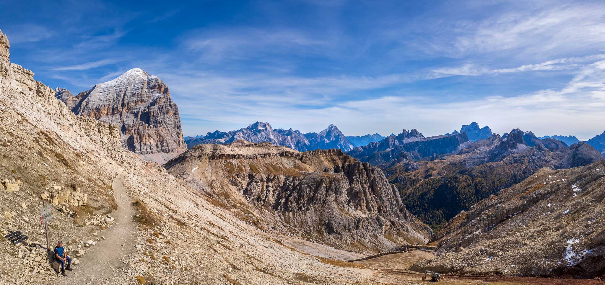 Über dem Valparola-Pass schimmern die Gipfel im letzten Nachmittagslicht. Nach rechts schweift der Blick über den Setsas und den Sellastock hinüber zum Grödner Joch, weiter über die Gipfel der Puezgruppe mit dem davor aufragenden Sassongher und hinauf in den nördlichen Teil des Gadertals bis zur Nordgrenze der Dolomiten, die vom Peitlerkofel markiert wird. In der Drehung weiter folgen die zerklüfteten Conturines-Spitzen, dann der Piza dl Lech, der Piza Scotoni, der Piza de Medo, die Südliche Fanisspitze, der Lagazuoi Nord, der Lagazuoi Süd und der Kleine Lagazuoi – und schließlich der Spinarac-Grat, den wir von hier als eindrucksvollen Turm sehen. Und schon bleibt der Blick wieder am Valparola-Pass hängen.