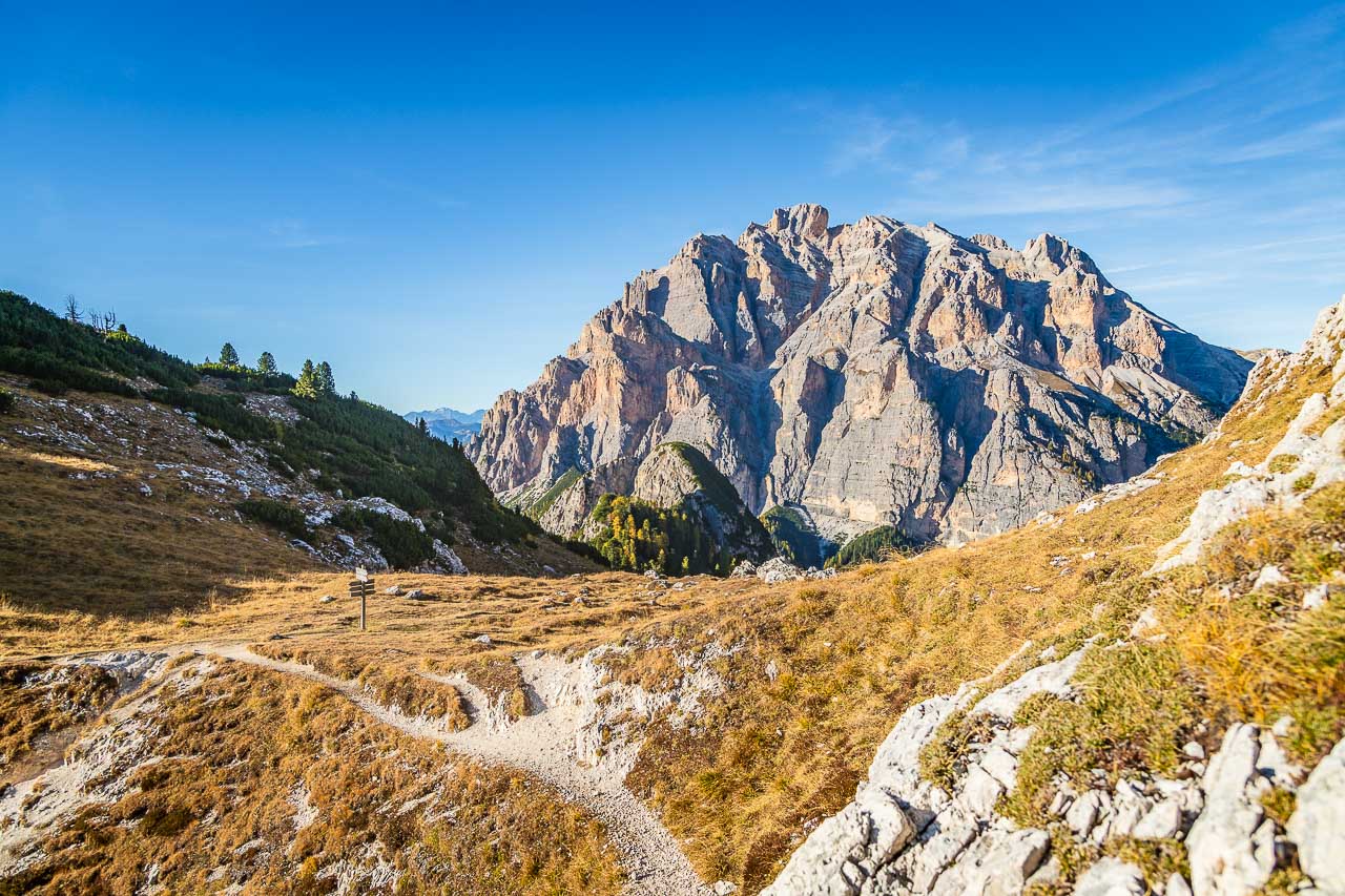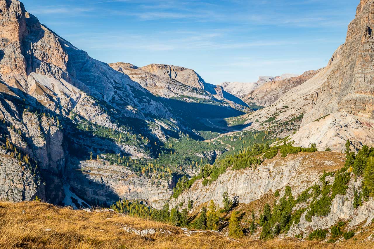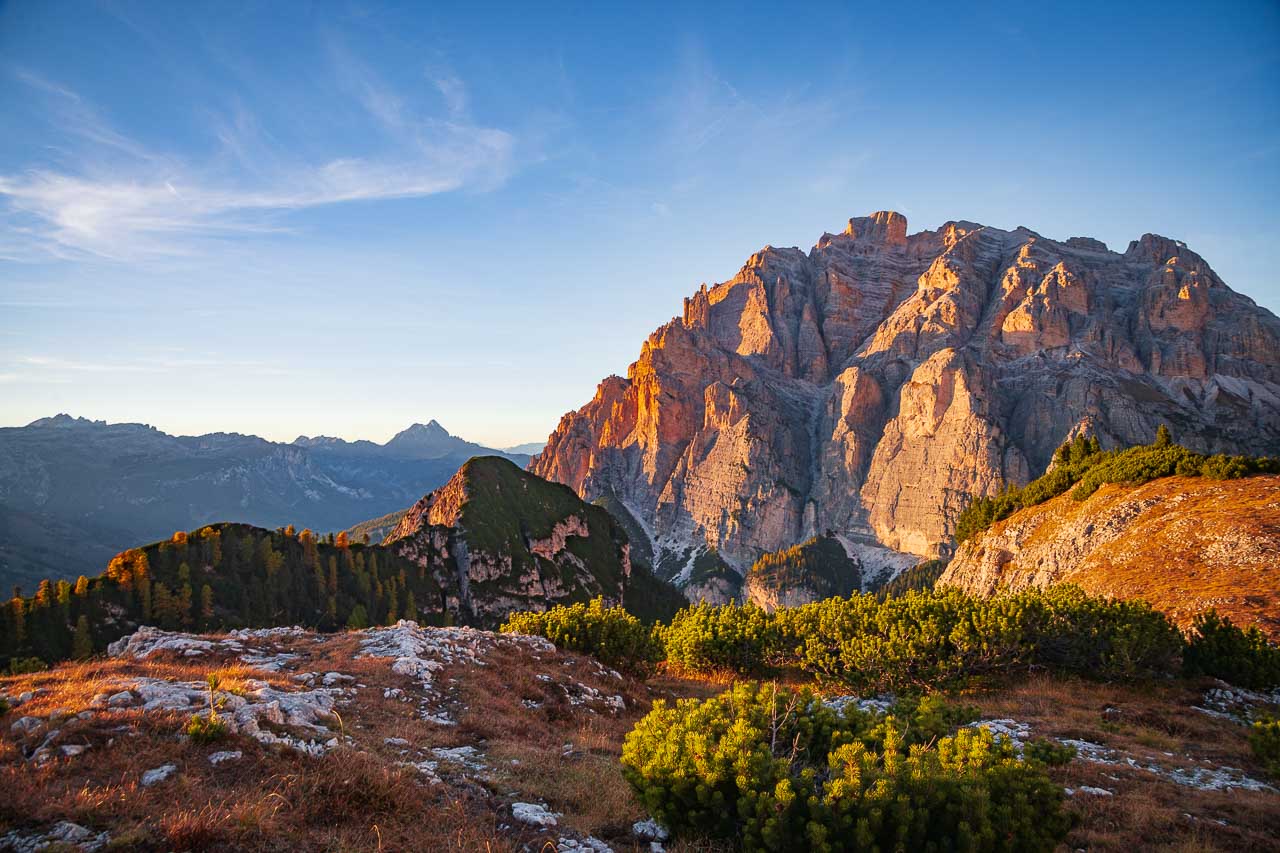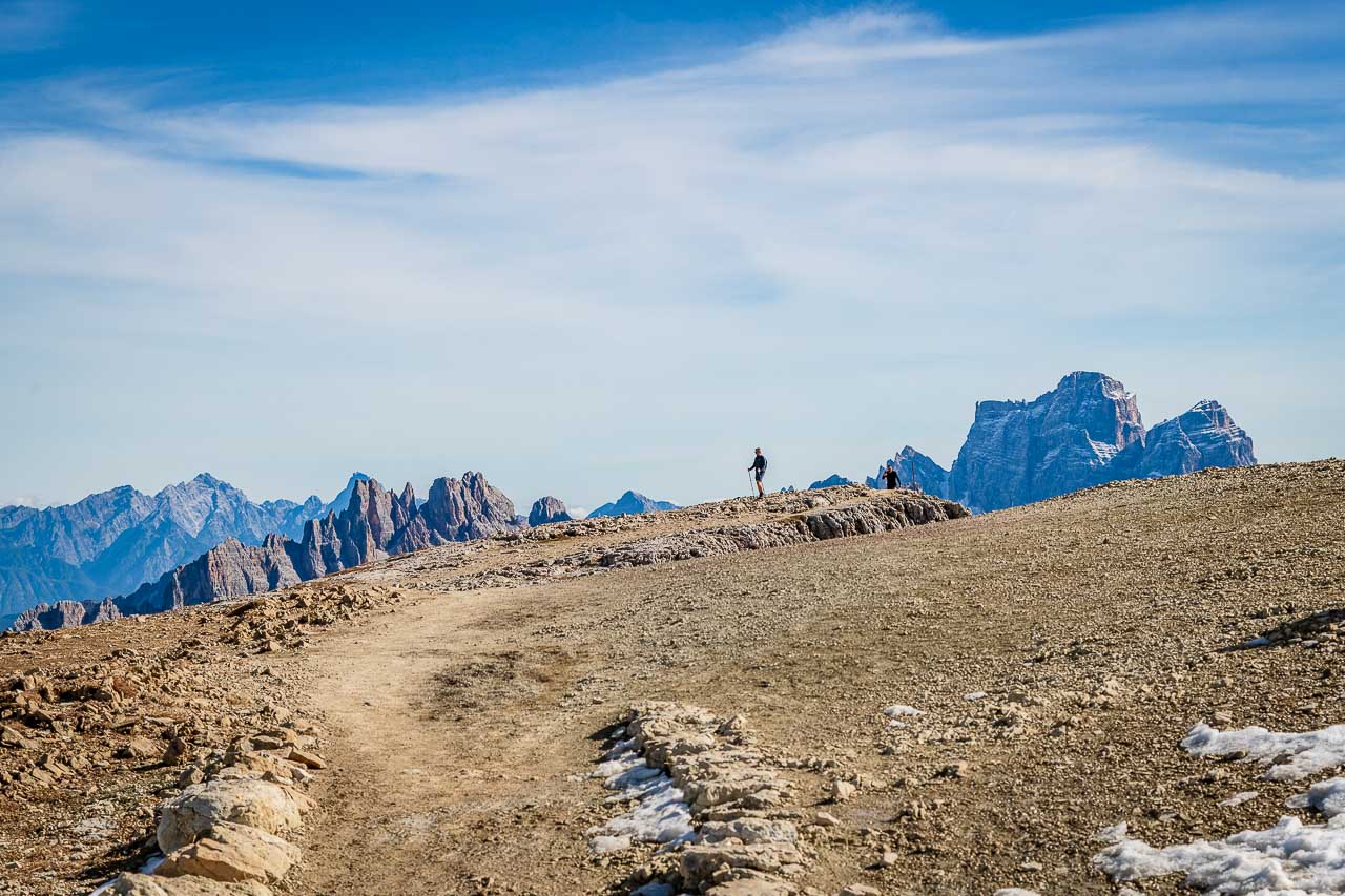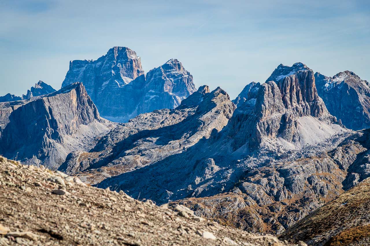 Über dem Valparola-Pass schimmern die Gipfel im letzten Nachmittagslicht. Nach rechts schweift der Blick über den Setsas und den Sellastock hinüber zum Grödner Joch, weiter über die Gipfel der Puezgruppe mit dem davor aufragenden Sassongher und hinauf in den nördlichen Teil des Gadertals bis zur Nordgrenze der Dolomiten, die vom Peitlerkofel markiert wird. In der Drehung weiter folgen die zerklüfteten Conturines-Spitzen, dann der Piza dl Lech, der Piza Scotoni, der Piza de Medo, die Südliche Fanisspitze, der Lagazuoi Nord, der Lagazuoi Süd und der Kleine Lagazuoi – und schließlich der Spinarac-Grat, den wir von hier als eindrucksvollen Turm sehen. Und schon bleibt der Blick wieder am Valparola-Pass hängen.