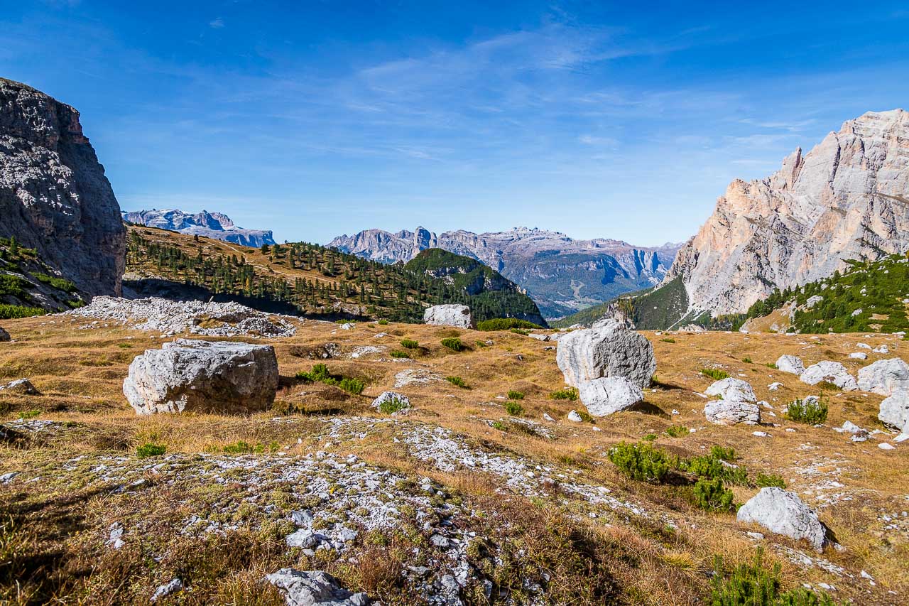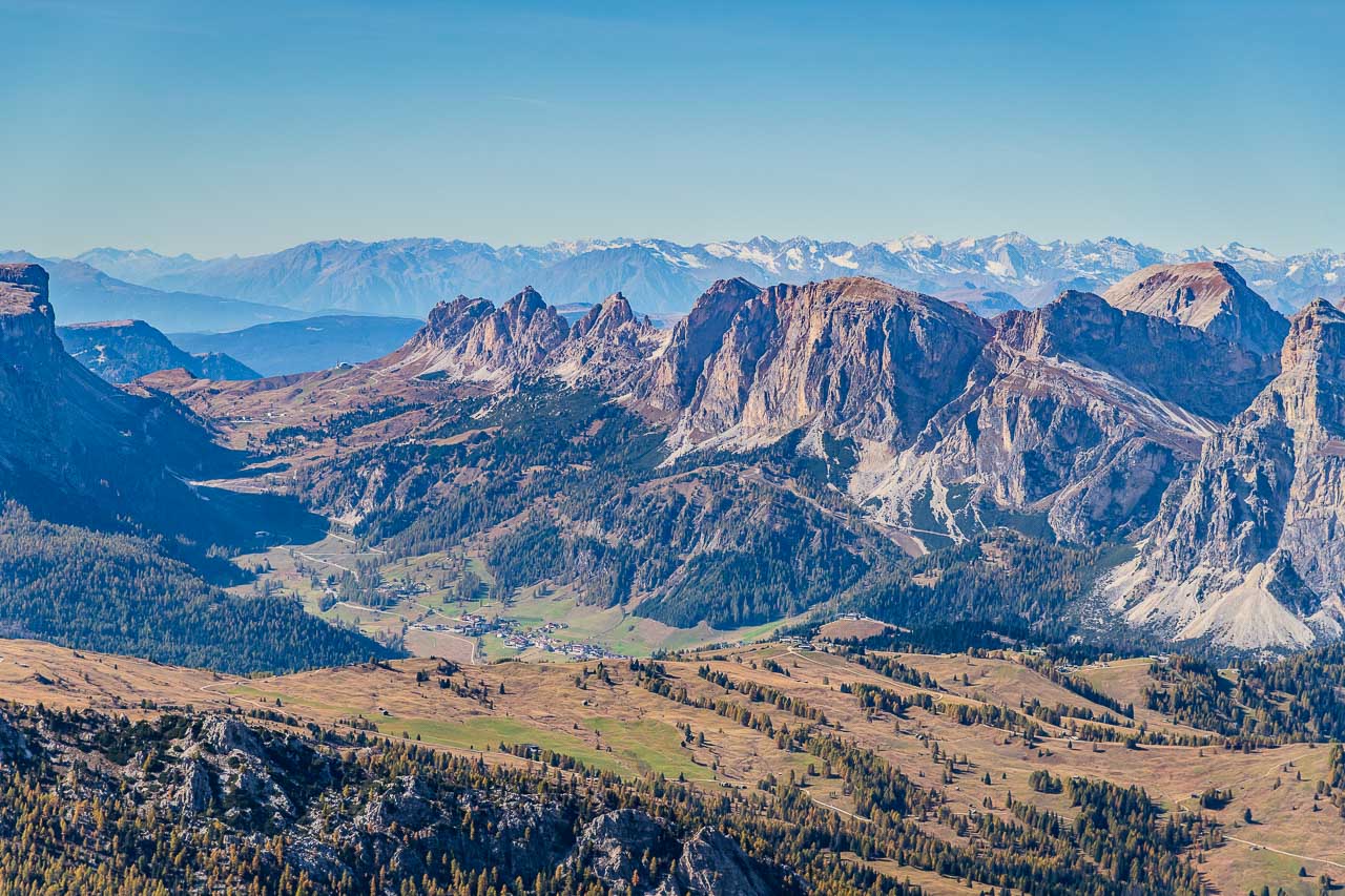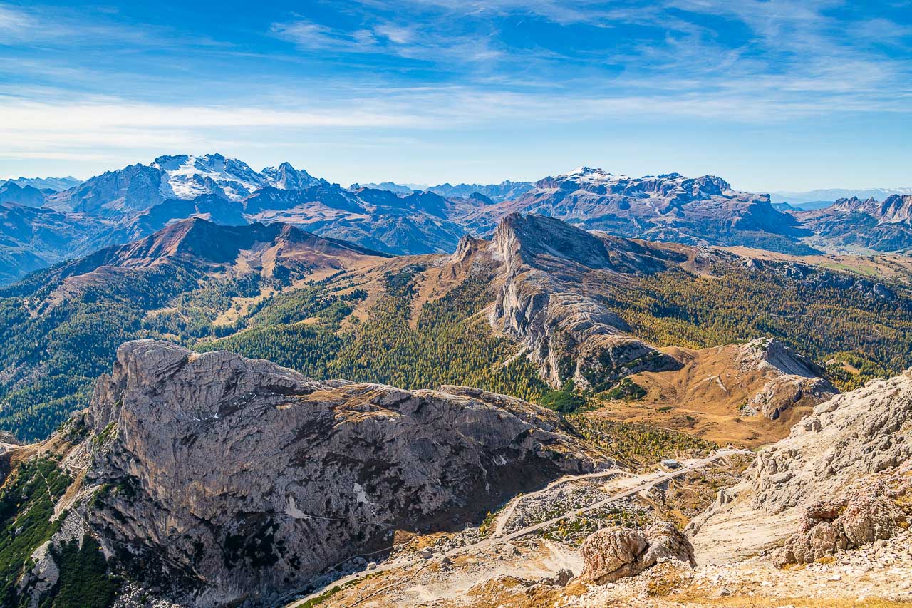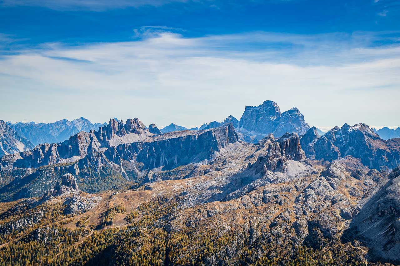 Über dem Valparola-Pass schimmern die Gipfel im letzten Nachmittagslicht. Nach rechts schweift der Blick über den Setsas und den Sellastock hinüber zum Grödner Joch, weiter über die Gipfel der Puezgruppe mit dem davor aufragenden Sassongher und hinauf in den nördlichen Teil des Gadertals bis zur Nordgrenze der Dolomiten, die vom Peitlerkofel markiert wird. In der Drehung weiter folgen die zerklüfteten Conturines-Spitzen, dann der Piza dl Lech, der Piza Scotoni, der Piza de Medo, die Südliche Fanisspitze, der Lagazuoi Nord, der Lagazuoi Süd und der Kleine Lagazuoi – und schließlich der Spinarac-Grat, den wir von hier als eindrucksvollen Turm sehen. Und schon bleibt der Blick wieder am Valparola-Pass hängen.