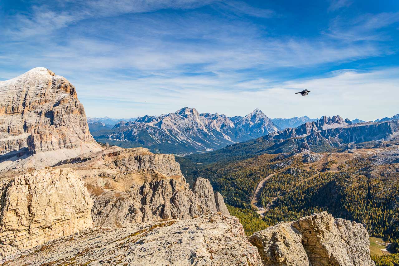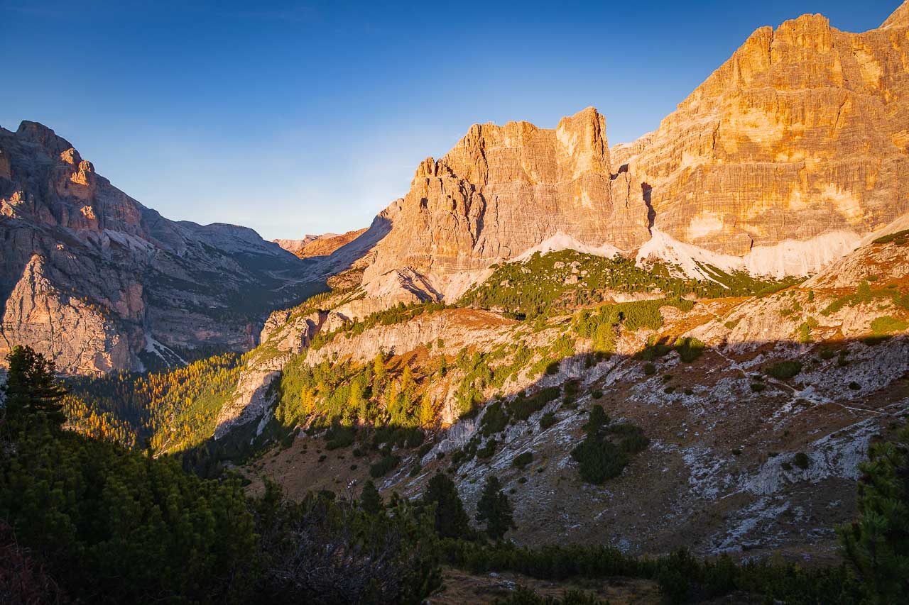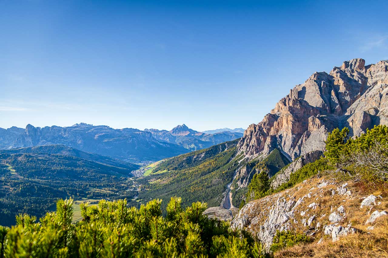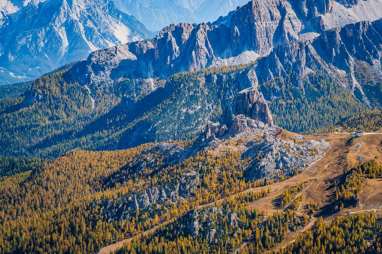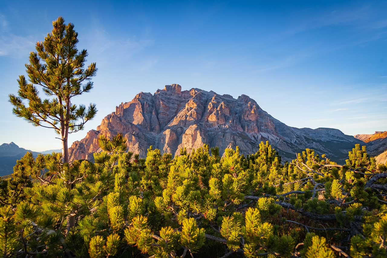 Über dem Valparola-Pass schimmern die Gipfel im letzten Nachmittagslicht. Nach rechts schweift der Blick über den Setsas und den Sellastock hinüber zum Grödner Joch, weiter über die Gipfel der Puezgruppe mit dem davor aufragenden Sassongher und hinauf in den nördlichen Teil des Gadertals bis zur Nordgrenze der Dolomiten, die vom Peitlerkofel markiert wird. In der Drehung weiter folgen die zerklüfteten Conturines-Spitzen, dann der Piza dl Lech, der Piza Scotoni, der Piza de Medo, die Südliche Fanisspitze, der Lagazuoi Nord, der Lagazuoi Süd und der Kleine Lagazuoi – und schließlich der Spinarac-Grat, den wir von hier als eindrucksvollen Turm sehen. Und schon bleibt der Blick wieder am Valparola-Pass hängen.