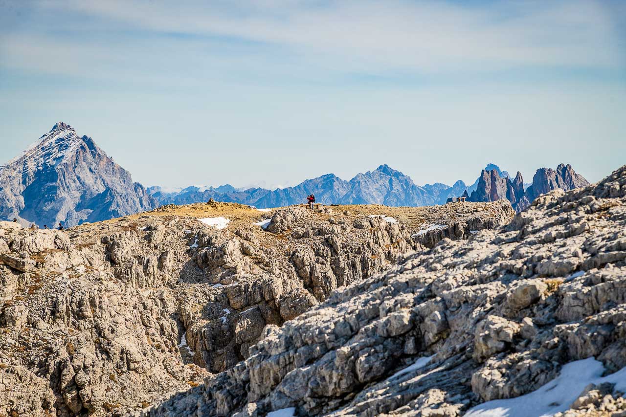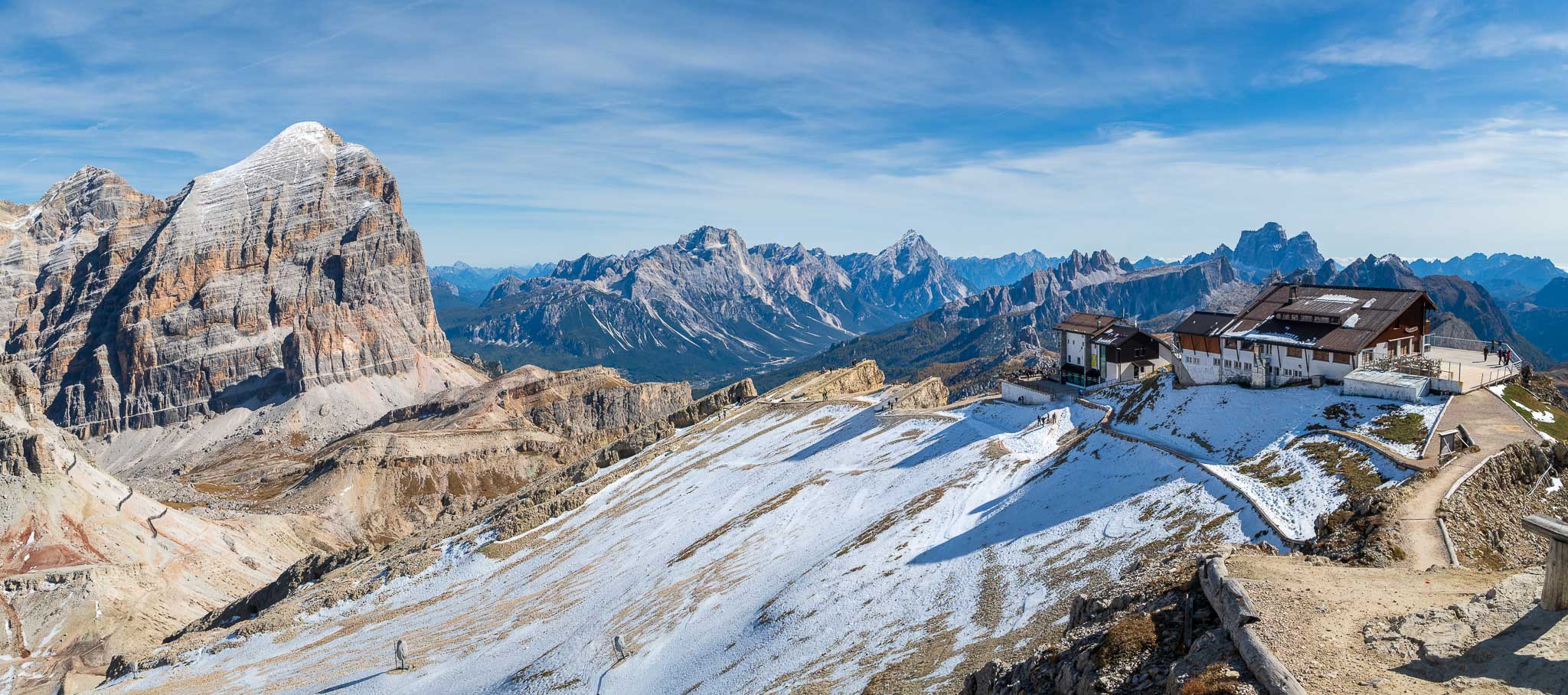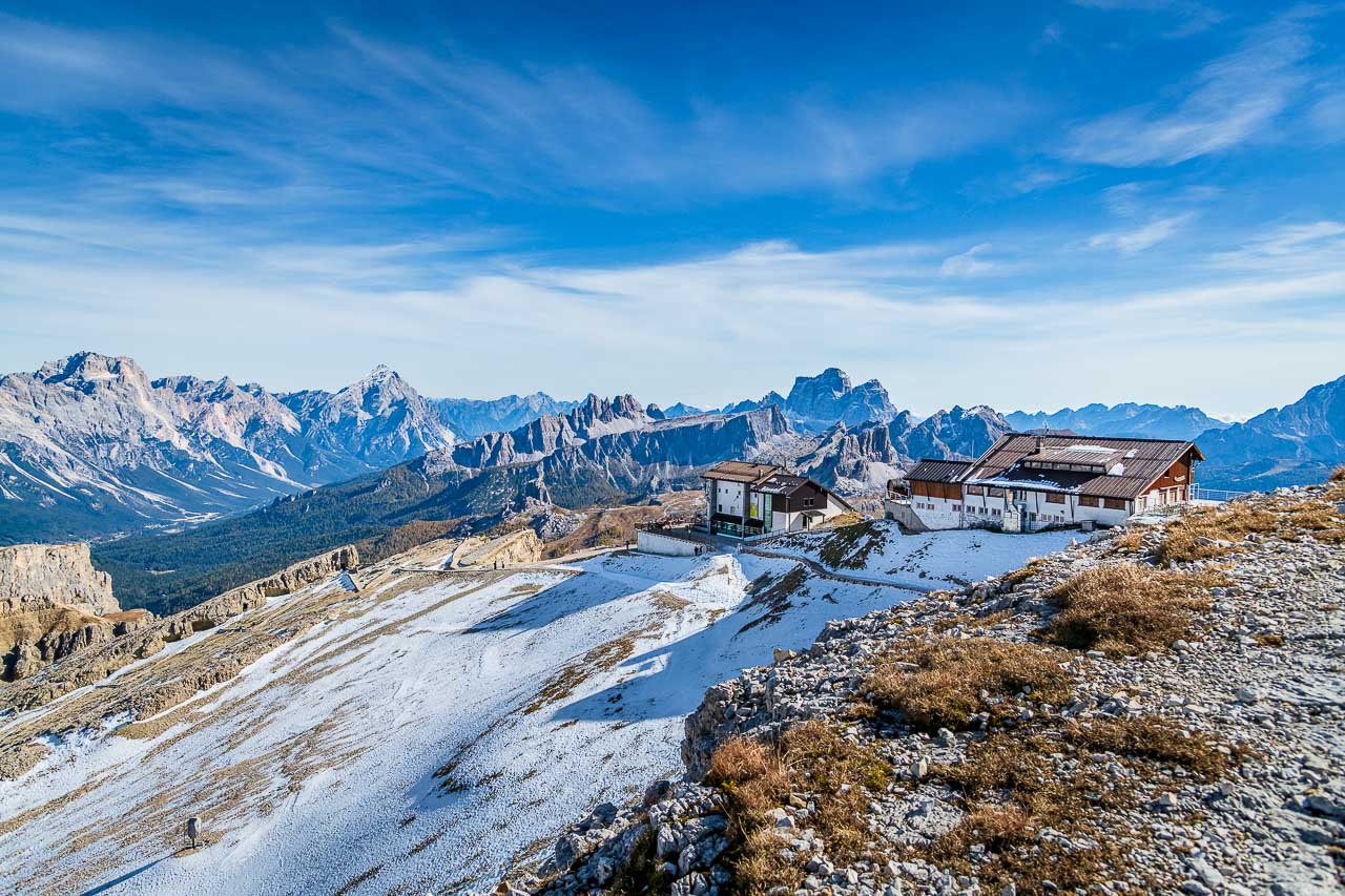 Schließlich erreichen wir die Bergstation der Lagazuoi-Seilbahn. Das Kiosk bei der Bergstation hat auch Mitte Oktober noch geöffnet. Wir schreiten jedoch die wenigen Meter zur Schutzhütte Rifugio Lagazuoi weiter. Mit 2.752 m ü. d. M. ist sie die höchstgelegene und zugleich größte Hütte von Cortina d’Ampezzo. Heute ist sie geschlossen, was sich jedoch als Vorteil erweist, da wir die traumhafte Panorama-Terrasse ganz für uns allein haben. Wir teilen uns die riesige Terrasse nur mit zwei oder drei asiatischen Fotografen.