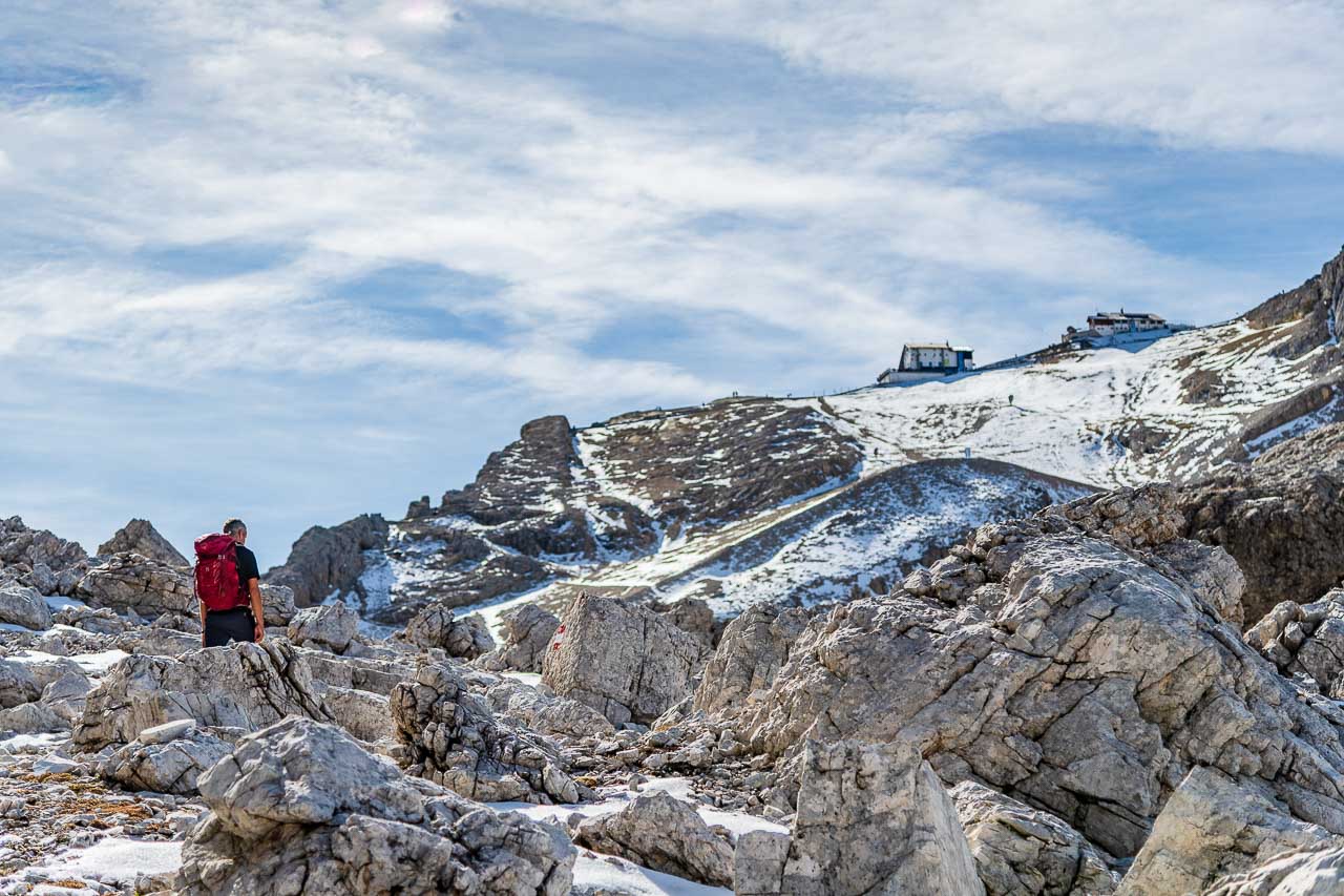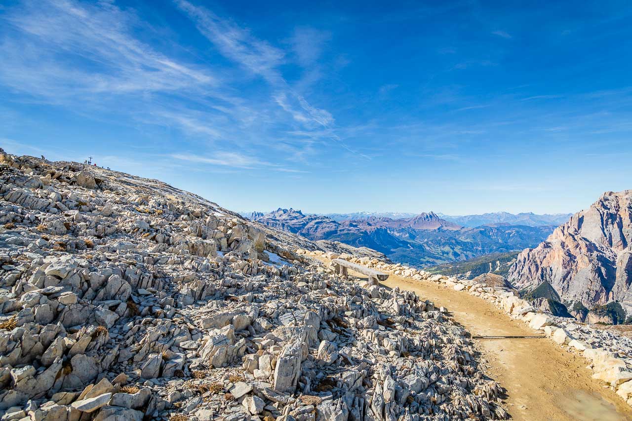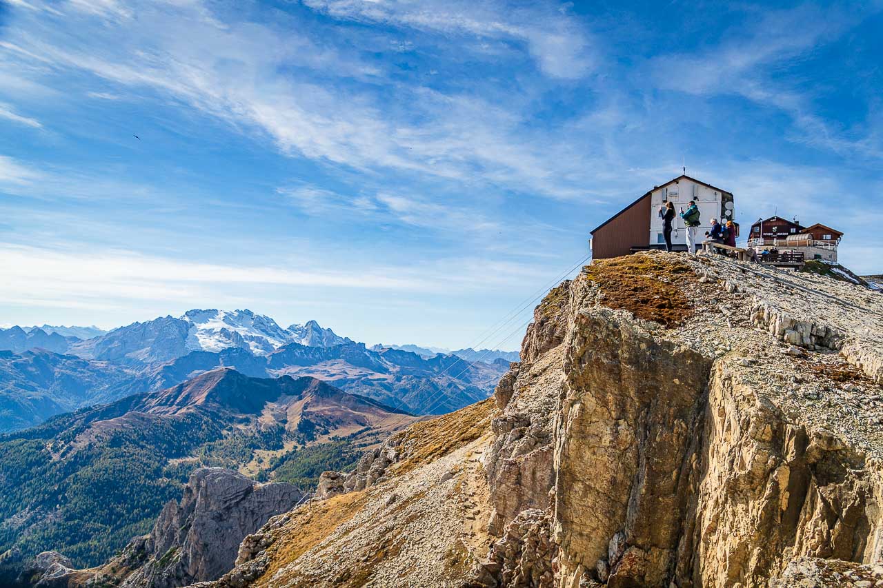 Schließlich erreichen wir die Bergstation der Lagazuoi-Seilbahn. Das Kiosk bei der Bergstation hat auch Mitte Oktober noch geöffnet. Wir schreiten jedoch die wenigen Meter zur Schutzhütte Rifugio Lagazuoi weiter. Mit 2.752 m ü. d. M. ist sie die höchstgelegene und zugleich größte Hütte von Cortina d’Ampezzo. Heute ist sie geschlossen, was sich jedoch als Vorteil erweist, da wir die traumhafte Panorama-Terrasse ganz für uns allein haben. Wir teilen uns die riesige Terrasse nur mit zwei oder drei asiatischen Fotografen.