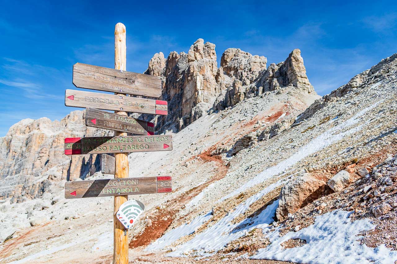 Den Abstieg bis zur Lagazuoi Scharte absolvieren wir auf demselben Weg, halten uns dann jedoch links und folgen den Markierungen entlang der Armentarola-Piste (Nr. 20 A).