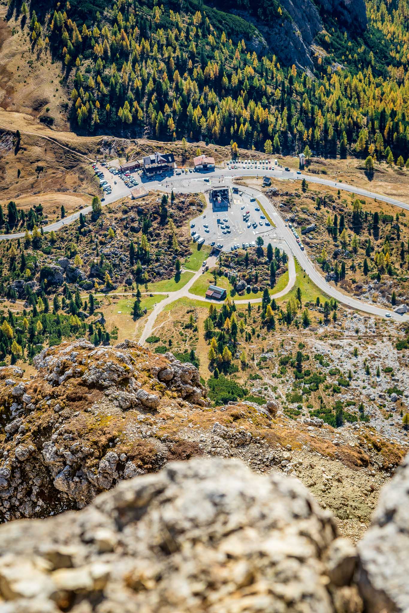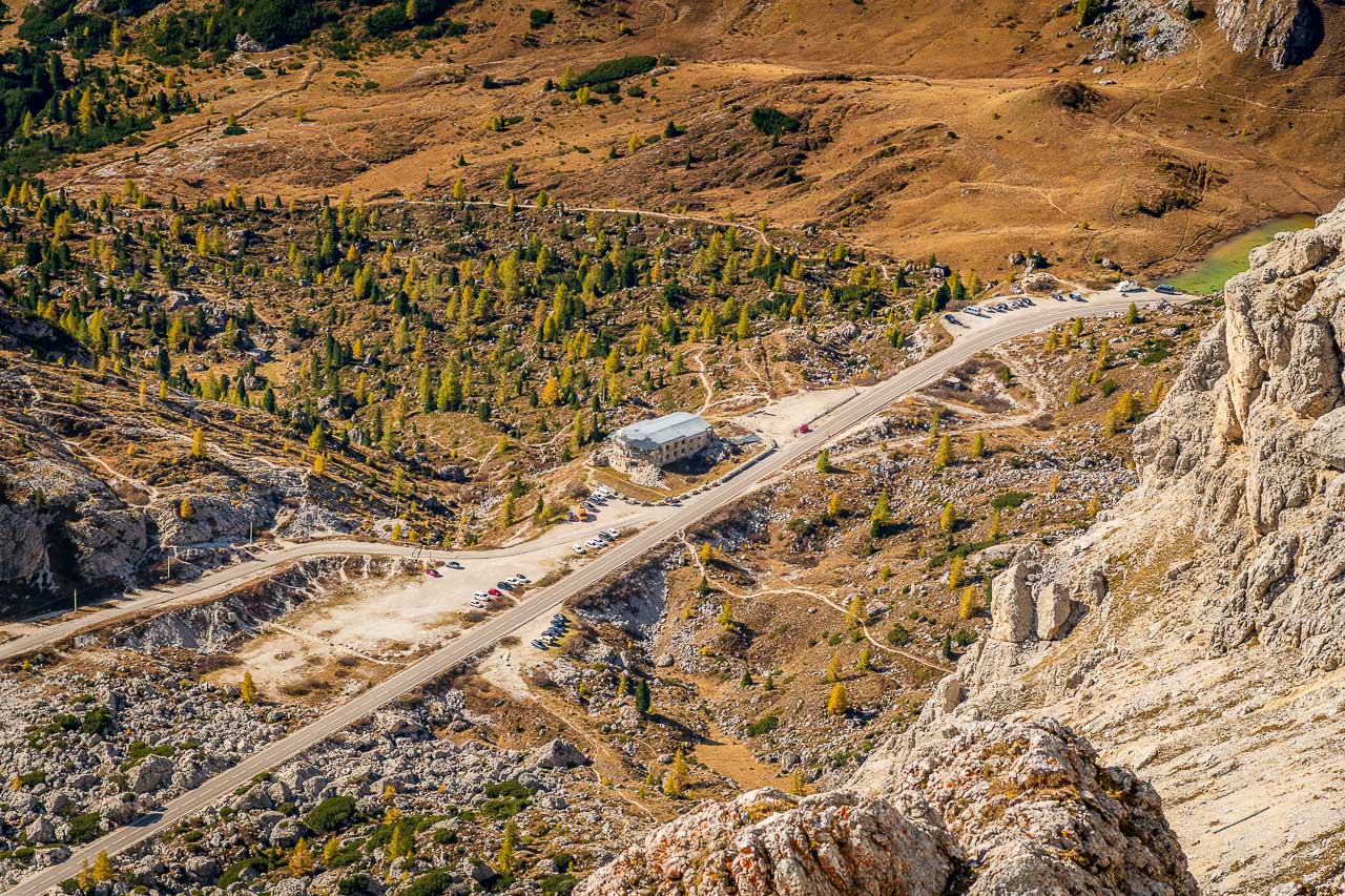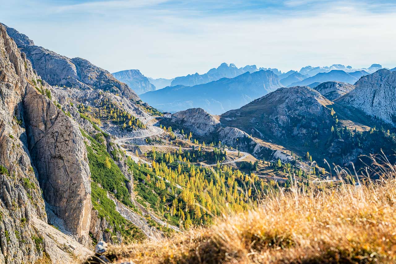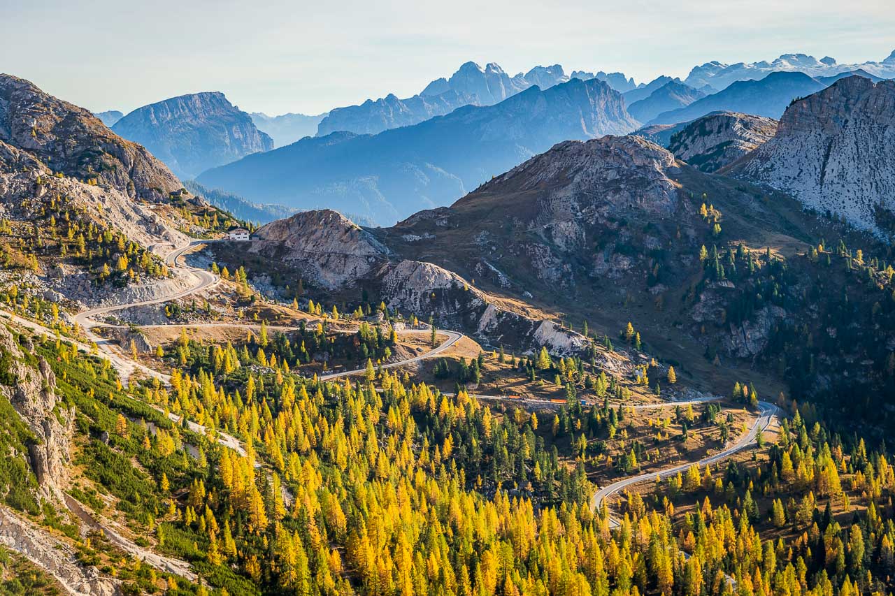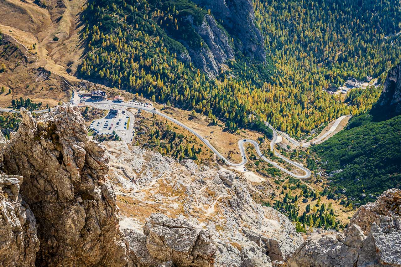 Auf der Valparola-Straße, gesäumt von Lärchen, die sich bereits gelb verfärben, fahren einige Autos. Das ist verwunderlich, denn die Passstraße ist heuer in der Wintersaison aufgrund von Bauarbeiten eigentlich gesperrt.