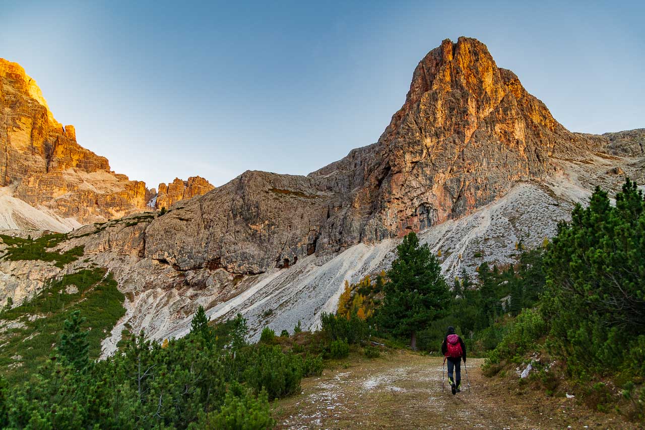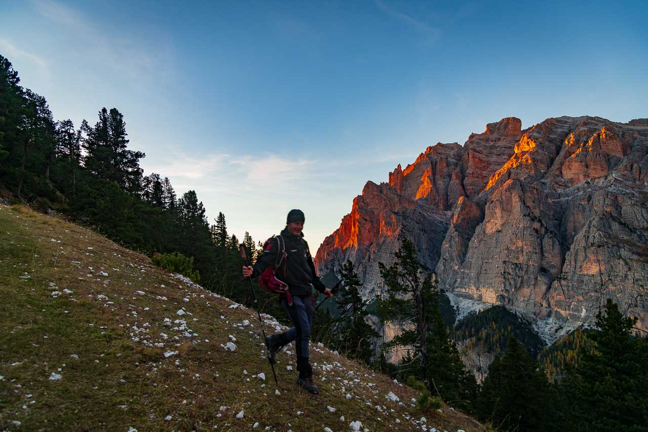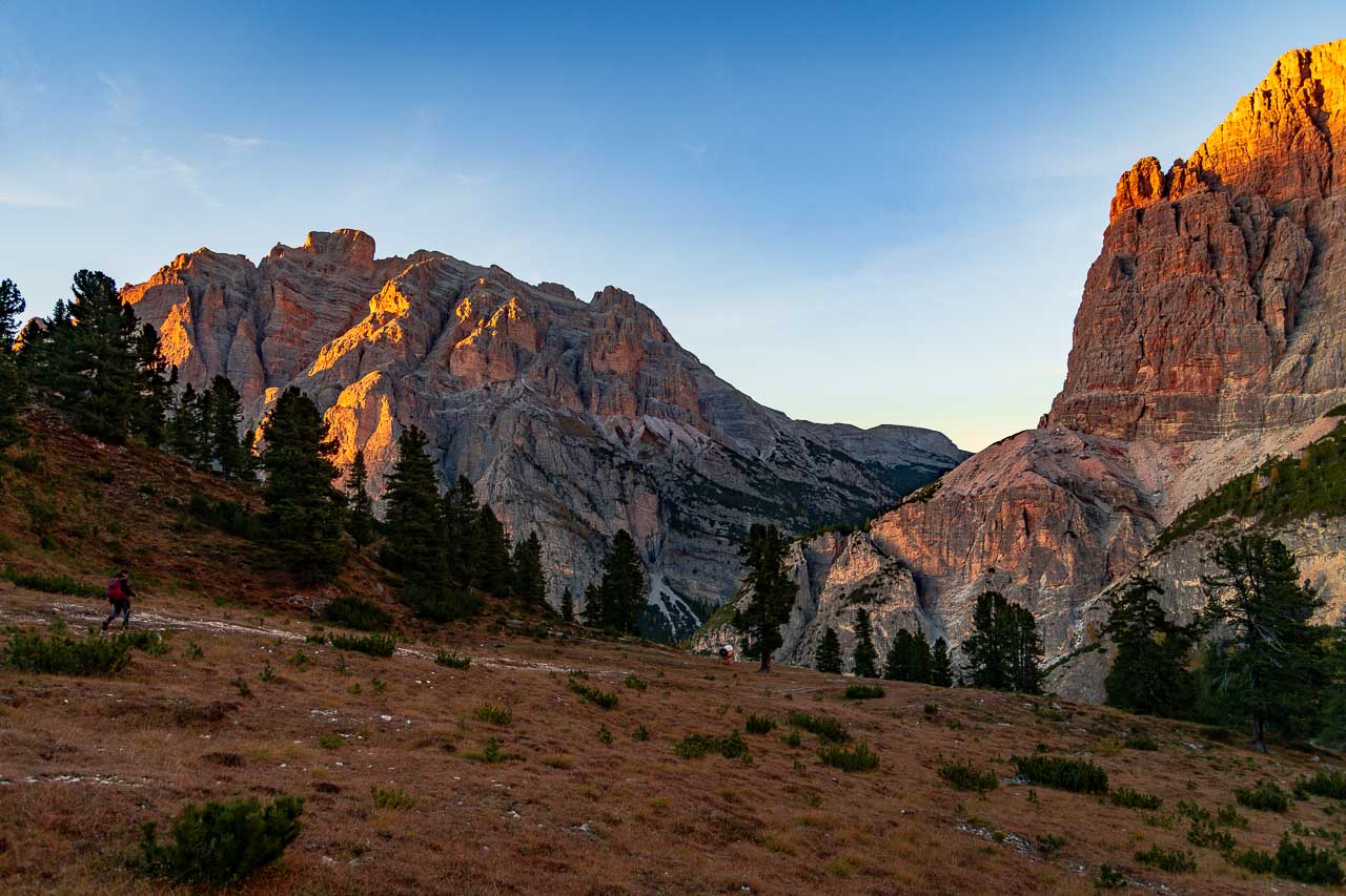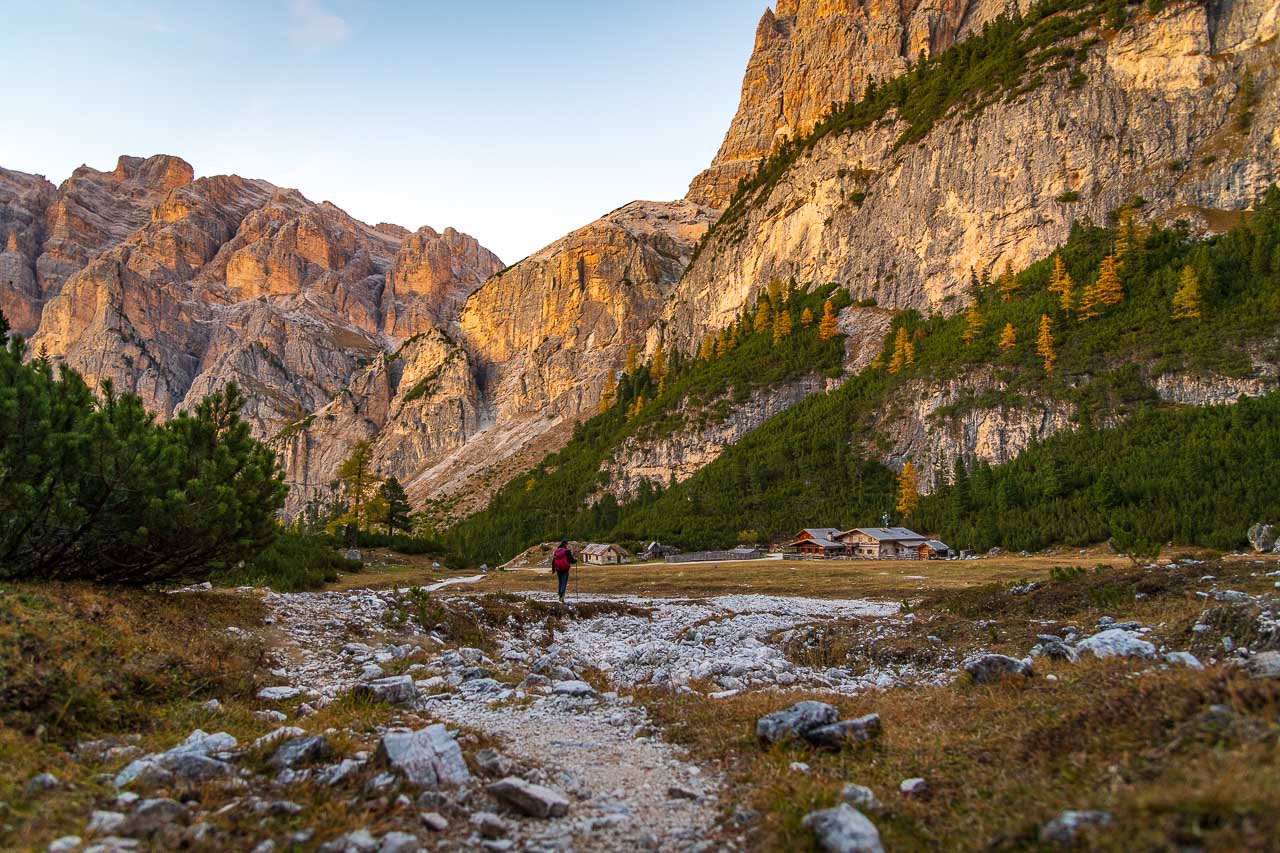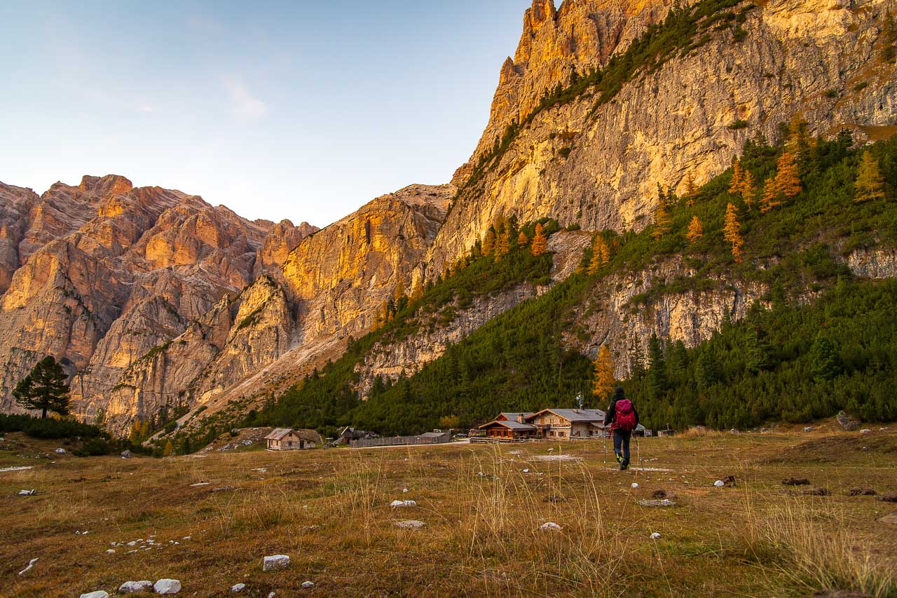 Bei der Scotoni-Hütte angekommen, steht das Dolomitenglühen bereits in voller Pracht. Fast schade, dass wir nun ins enge Tal zur Sarè-Brücke absteigen müssen. Doch irgendwann geht alles zu Ende – auch dieser wunderschöne Dolomitenwandertag zum Lagazuoi-See und zum Gipfel des Kleinen Lagazuoi.