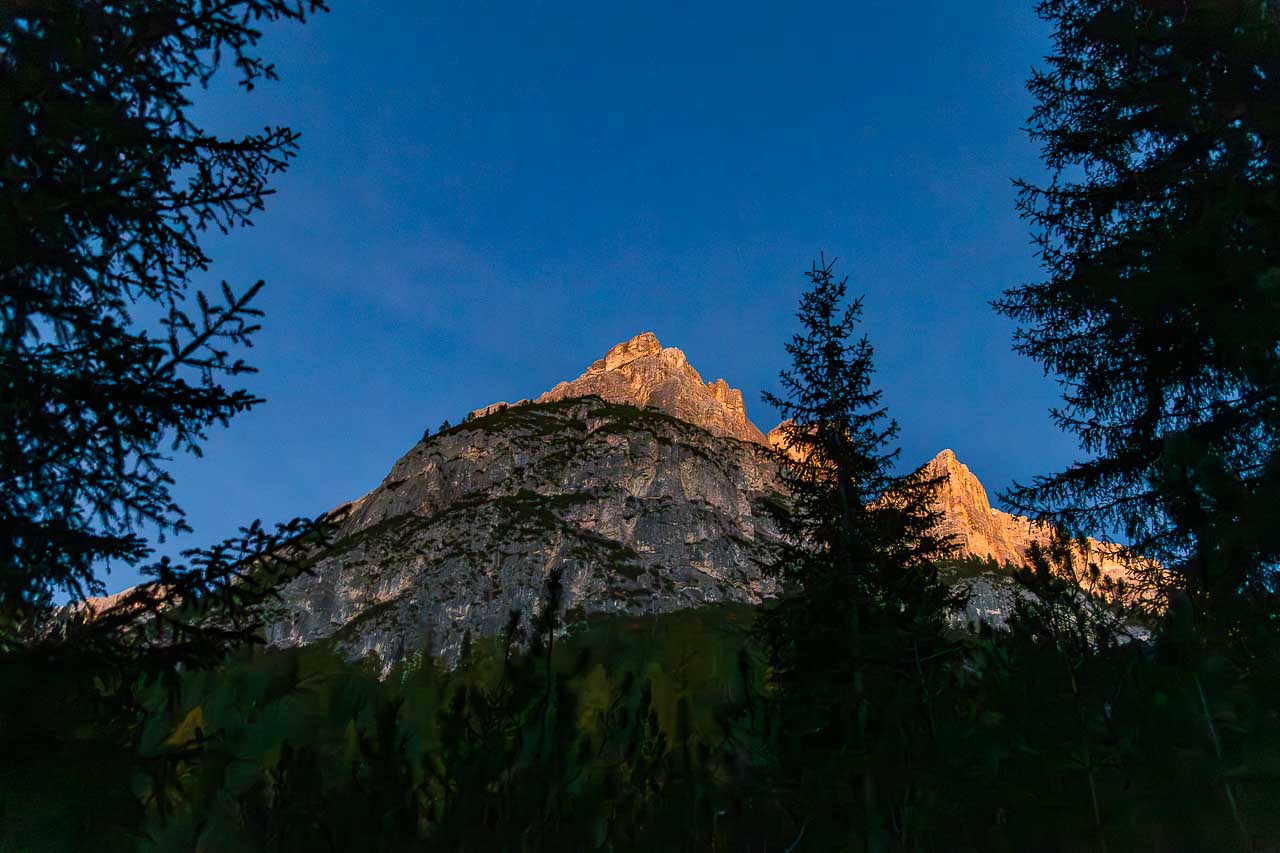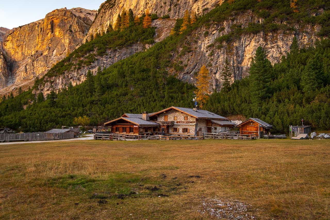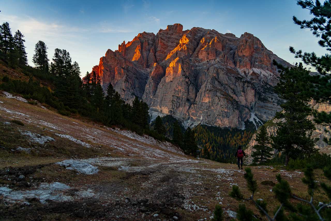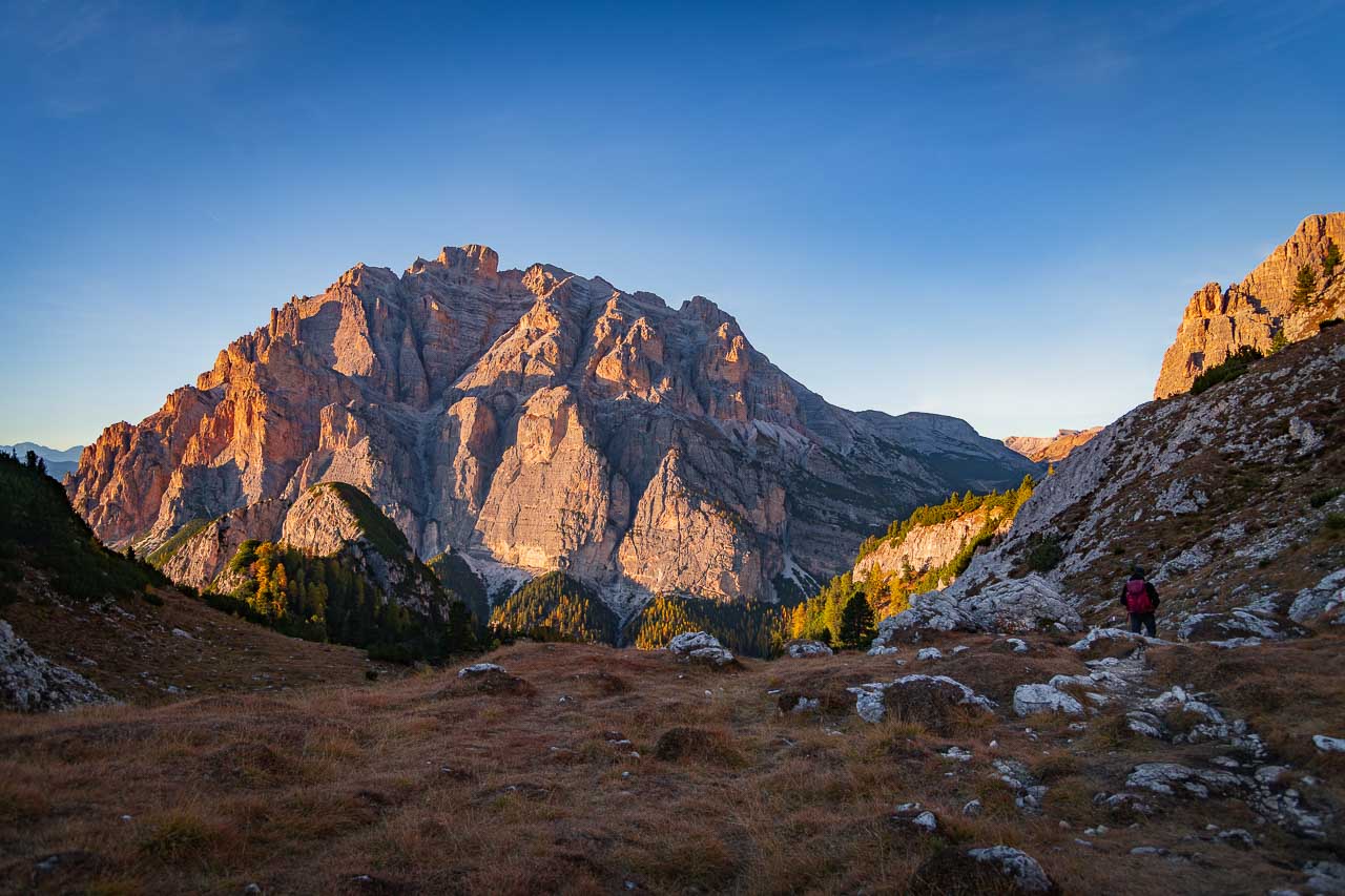 Bei der Scotoni-Hütte angekommen, steht das Dolomitenglühen bereits in voller Pracht. Fast schade, dass wir nun ins enge Tal zur Sarè-Brücke absteigen müssen. Doch irgendwann geht alles zu Ende – auch dieser wunderschöne Dolomitenwandertag zum Lagazuoi-See und zum Gipfel des Kleinen Lagazuoi.