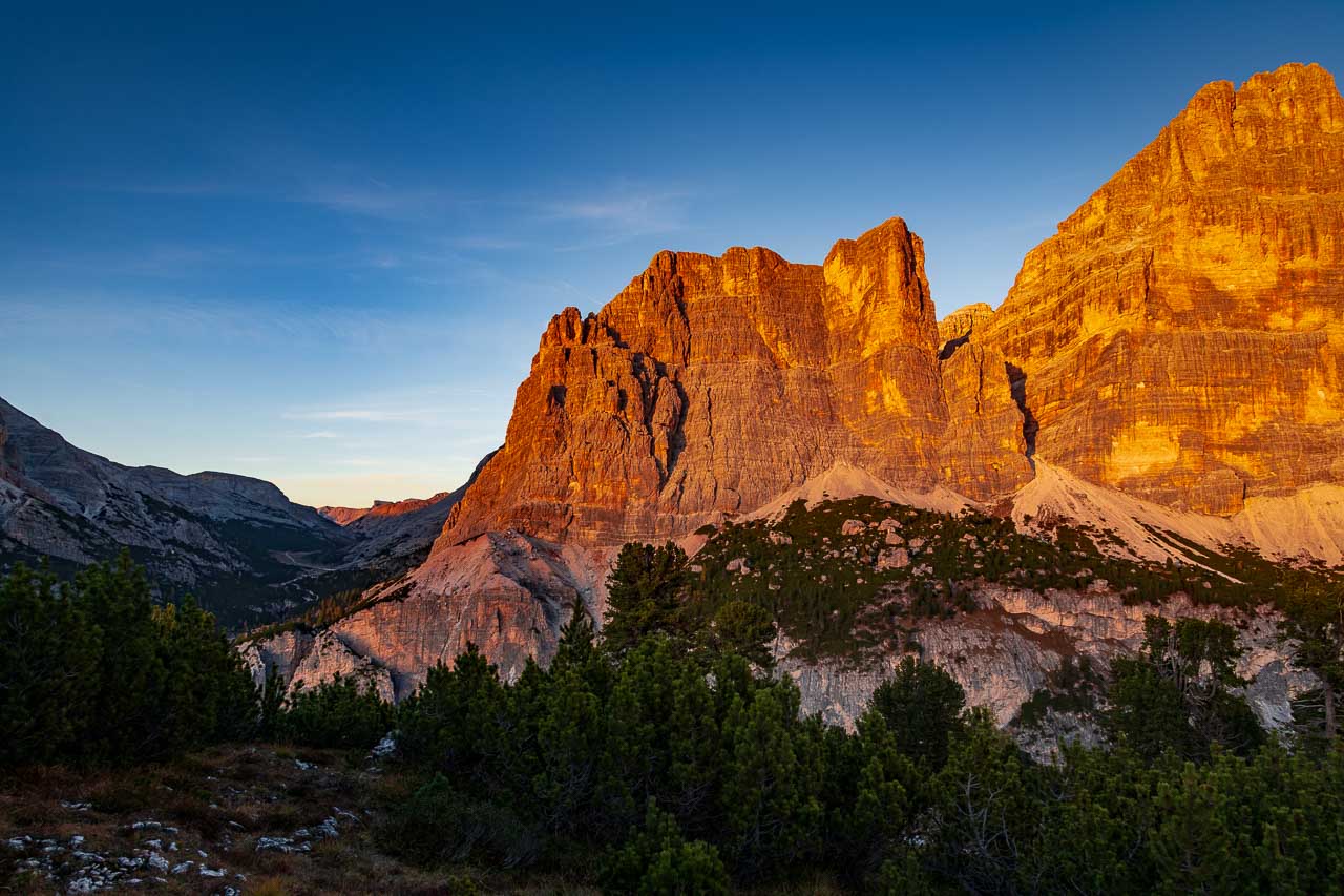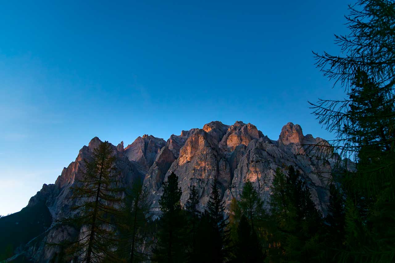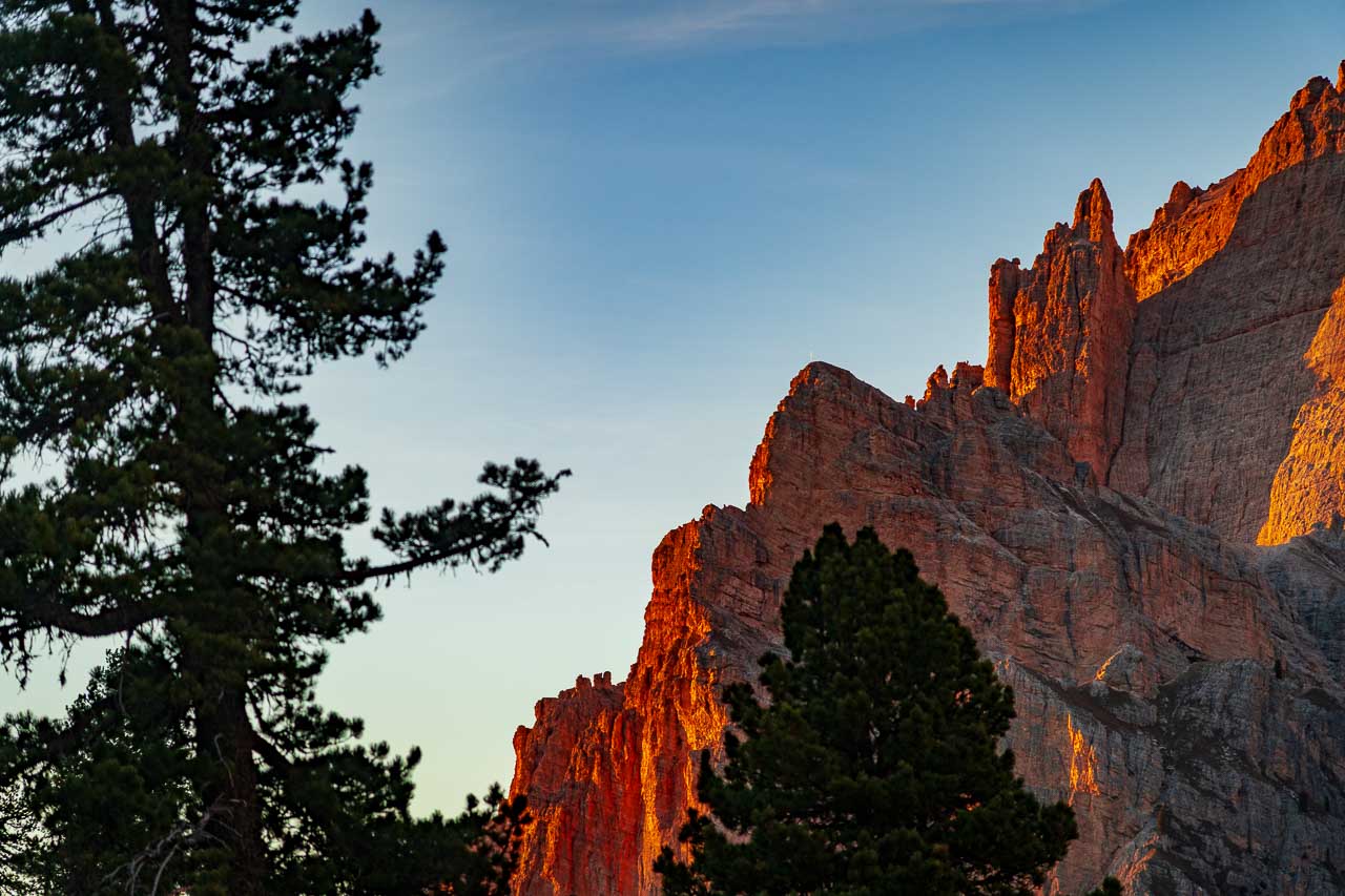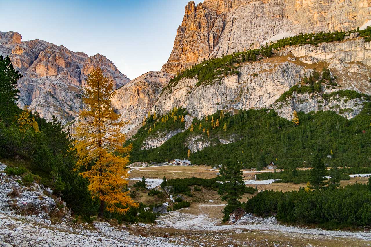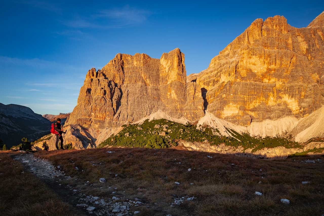 Bei der Scotoni-Hütte angekommen, steht das Dolomitenglühen bereits in voller Pracht. Fast schade, dass wir nun ins enge Tal zur Sarè-Brücke absteigen müssen. Doch irgendwann geht alles zu Ende – auch dieser wunderschöne Dolomitenwandertag zum Lagazuoi-See und zum Gipfel des Kleinen Lagazuoi.