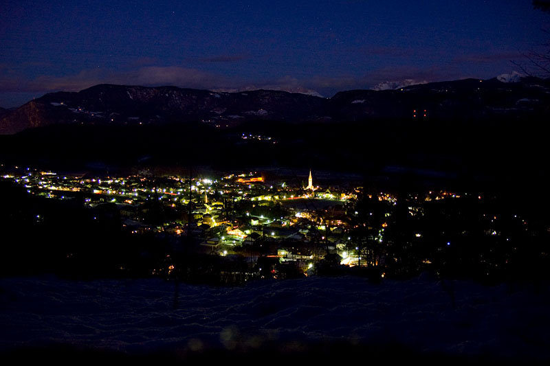 Totale Finsternis! Von vorne schimmert es uns entgegen. Kaltern liegt unter uns in einem Lichtermeer eingehüllt.