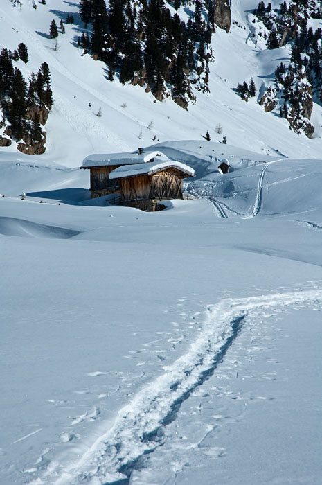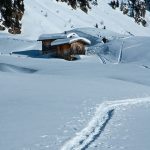 Stimmen dringen an unsere  Ohren. Da hat sich scheinbar eine Gruppe von Skitourengehern verirrt und versucht nun einen steilen, bewaldeten Hang zu uns herunter zu fahren. Wir wollen von denen lieber nicht eingeholt werden und stapfen deshalb etwas schneller voran. Der Wald, der Schnee, der uns bis über die Knie reicht und der schmale Pfad bieten uns den Vorteil, den wir brauchen, um die Gruppe sogar abzuhängen.