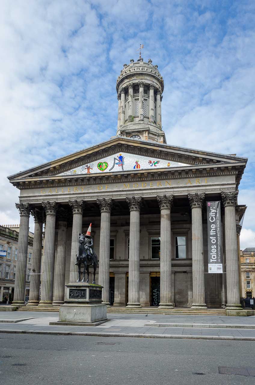 Vom der George Square spazieren wir durch die Queen-Street hinunter zu den Haupt-Shopping-Meilen. Die Gebäude sind hier viel mächtiger als in Edinburgh. Überhaupt vermitteln einem die enormen Dimensionen der Stadt einen guten Eindruck wie es im pulsierenden Glasgow des ausgehenden 18. und des industriellen 19. Jahrhunderts gewesen sein muss. Die durch Kohle- und Stahlindustrie, durch Baumwollhandel und Textilherstellung reich gewordenen Industriellen haben durch zahlreiche Prunkbauten, durch imposante Galerien, Bibliotheken und Industriegebäude ihre Spuren in Glasgow hinterlassen.