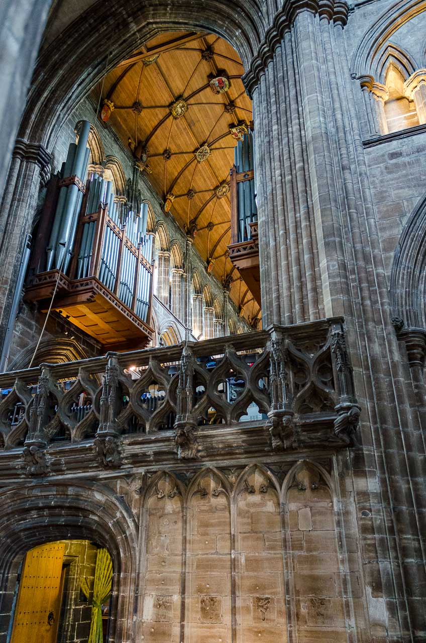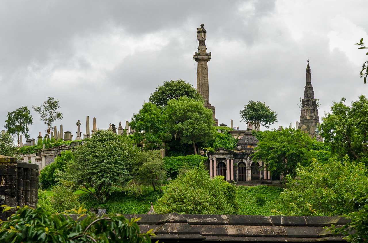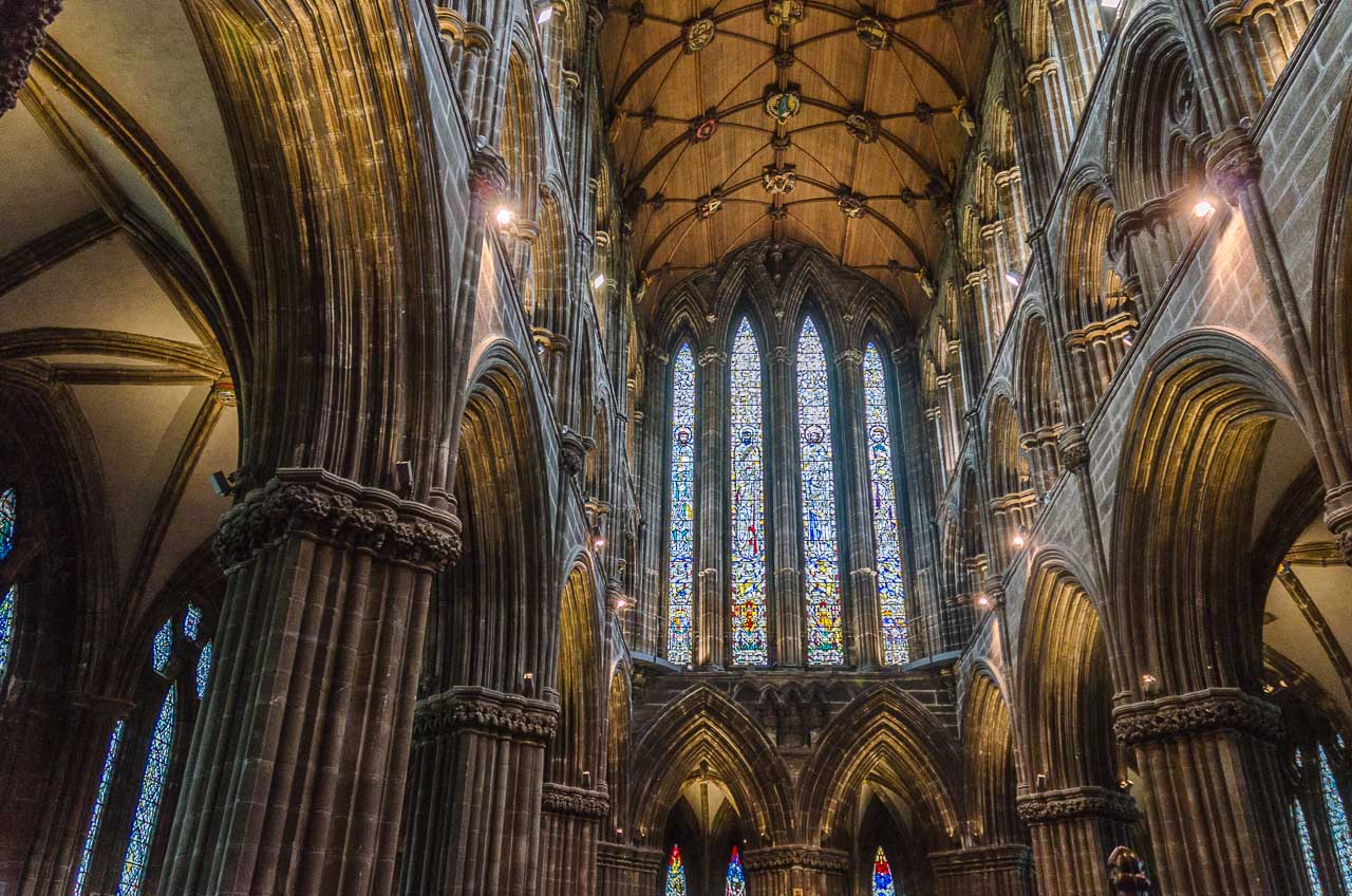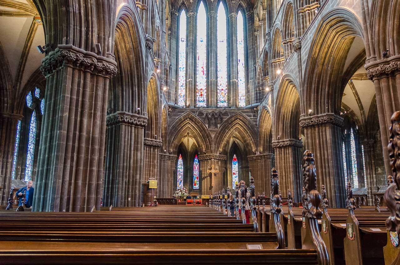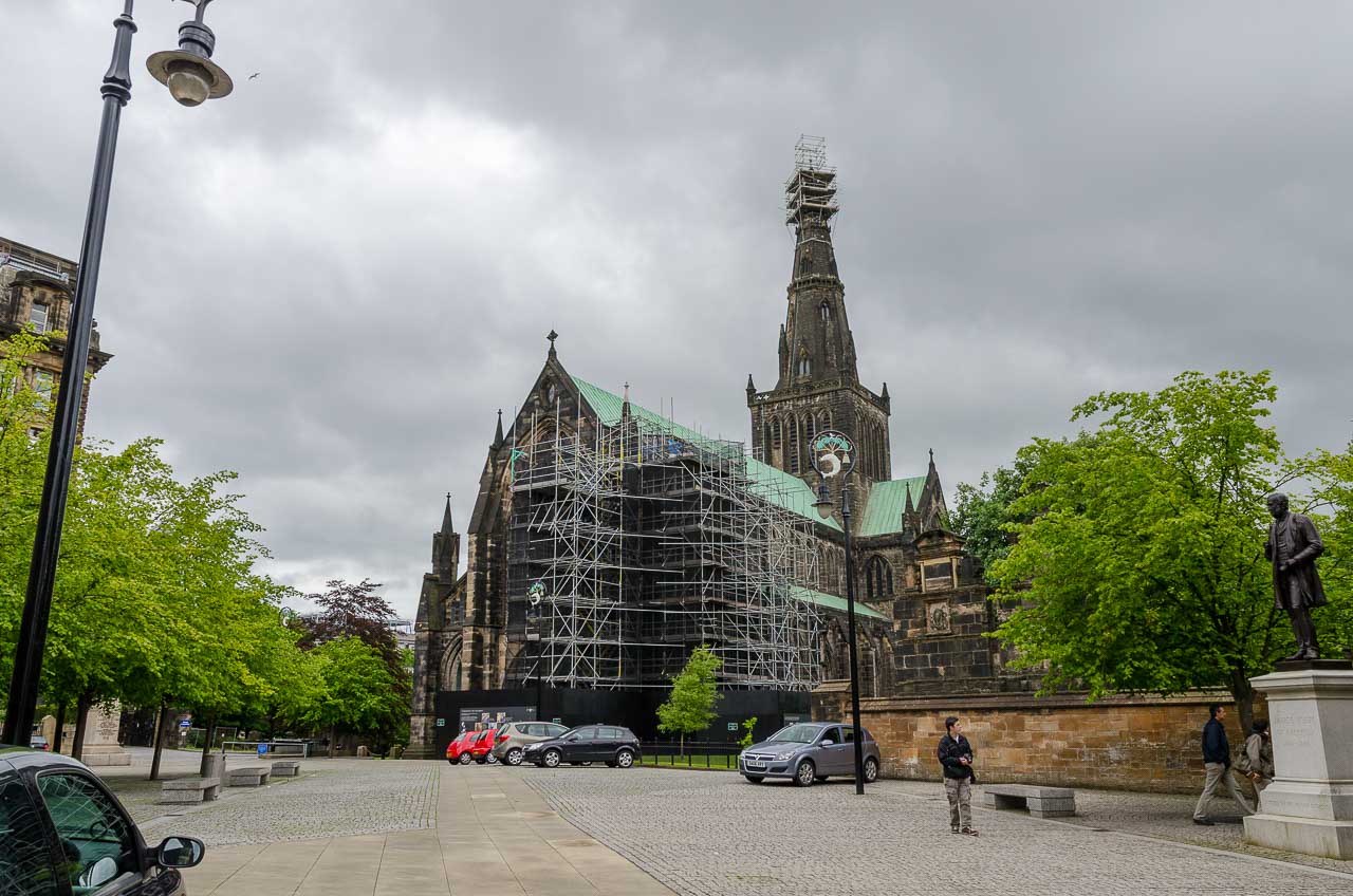 Circa eine halbe Stunde brauche ich zur Kathedrale von Glasgow. Wow, genau so stelle ich mir eine mittelalterliche Kathedrale vor. Mächtig, sehr hoch, dunkel und düster, erinnert sie mich an das Buch „Die Säulen der Erde“ von Ken Follet.