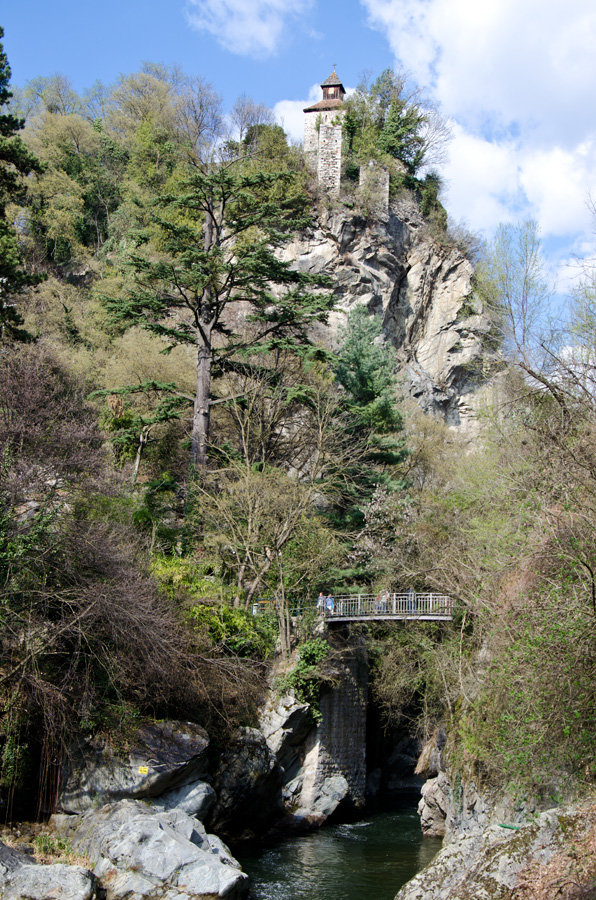 Rechts eine Federkielstickerei, links Schloss Rubein mit seinem Schlosspark, auf dem Sissiweg gibt es andauernd etwas zu bestaunen. Nach der Überquerung des Dorfplatzes von Obermais dauert es nicht lange bis wir – am Hotel Bavaria vorbei – zu den zahlreichen Promenaden an der Passer kommen. Über Serpentinen steigen wir – immer noch Kinderwagen tauglich – bis zum Passerufer ab, überqueren den Steinernen Steg, eine der historischen Passer-Brücken, und gelangen so auf die Gilfpromenade, der wir kurz gegen die Fließrichtung der Passer auf der orografisch linken Fluss-Seite folgen, um am Garten mit den Pflanzenskulpturen wieder zu orografisch rechten Seite in Richtung Süden wechseln zu können. Die Passerpromenaden präsentieren sich heute bereits in bunter Blumenpracht, nur die Skulpturen, eine riesige Schlange, ein Specht und Atlas mit seiner Weltkugel, sind noch nicht ganz vollständig mit frischem Moos bewachsen. Hoch über uns thront die Zenoburg, der wir jetzt den Rücken kehren.