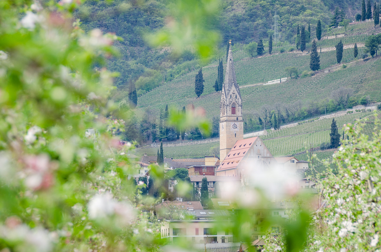 Die Apfelbäume blühen. Unser Sonntagsspazierweg steht somit fest. Ausgehend vom Traminer Sportplatz, wollen wir zuerst durch die Obstwiesen Richtung Kalterer See und anschließend über den Choleraweg entlang der landwirtschaftlichen Grenze Weinbau-Apfelbäume zum Südrand von Tramin hinunter wandern.