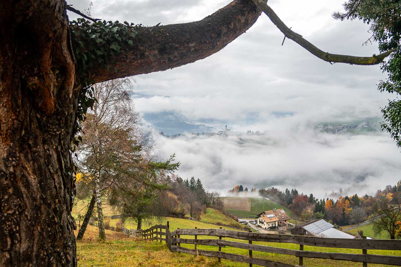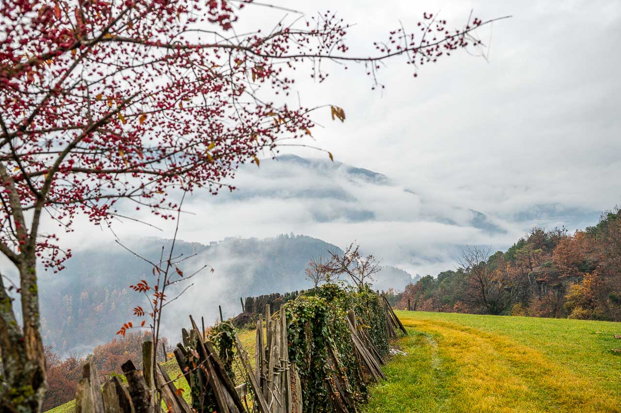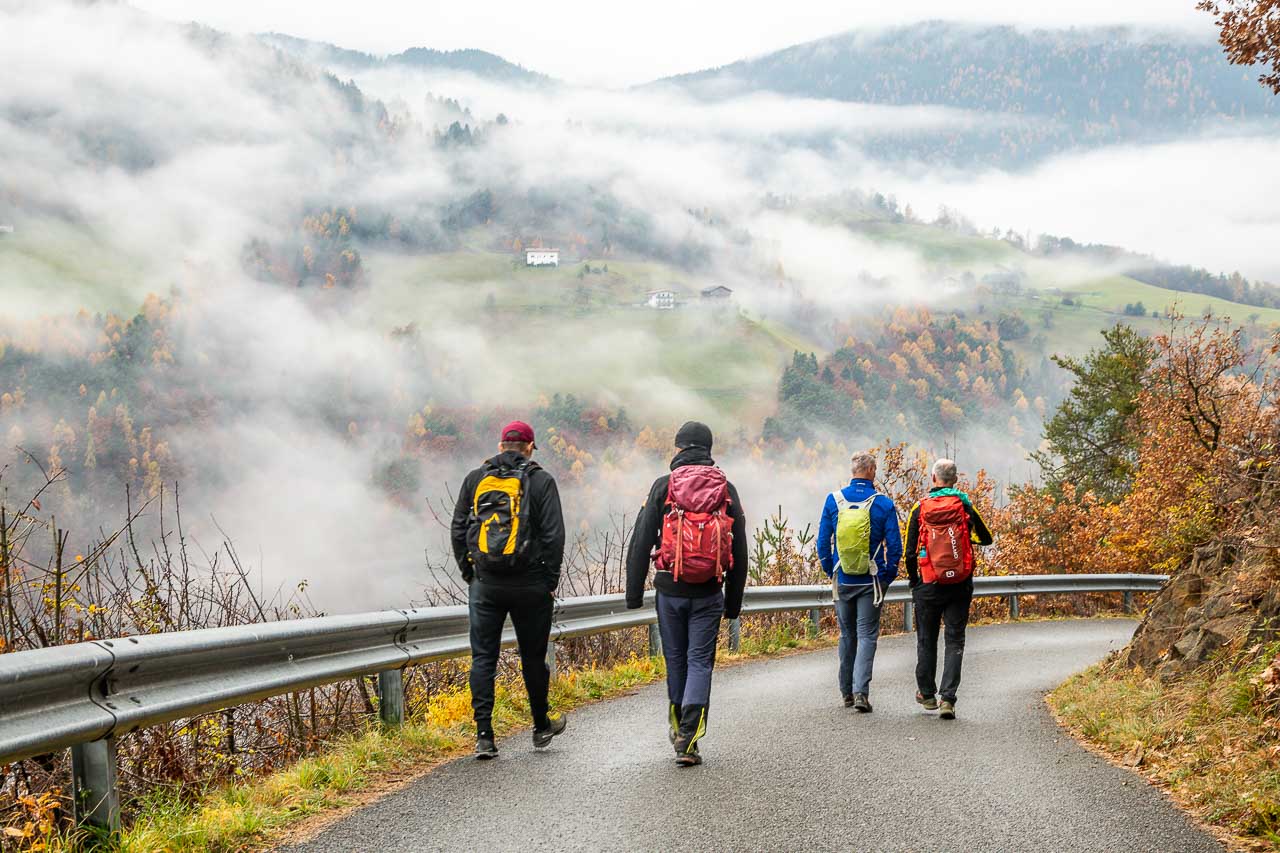 Der Völser Höfeweg – auch Oachner Höfeweg – soll es heute richten. Als eine der beliebteste Herbstwanderungen in Südtirol dürfte er uns fünf Männer trotz düsterer Wetterprognose zu einer halbwegs brauchbaren Wanderung verhelfen, bevor wir am späten Vormittag beim Fronthof in Völser Aicha zum Törggelen einkehren.