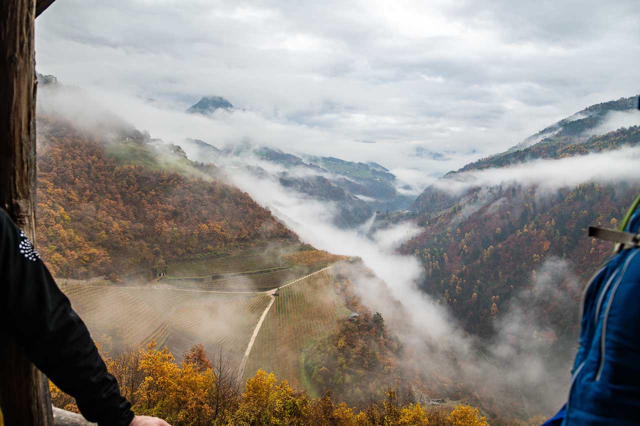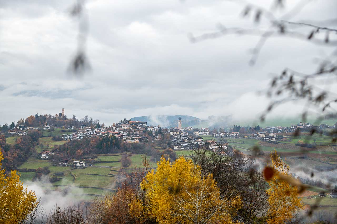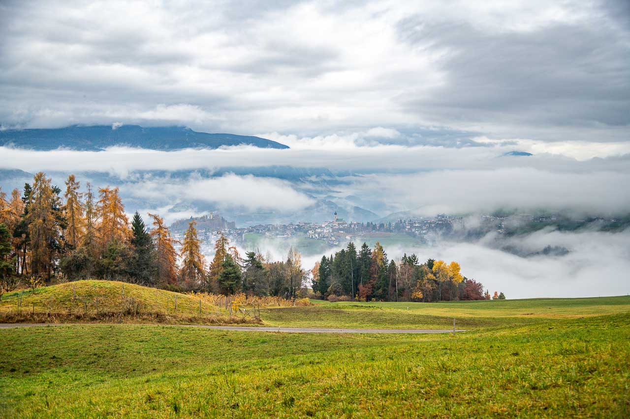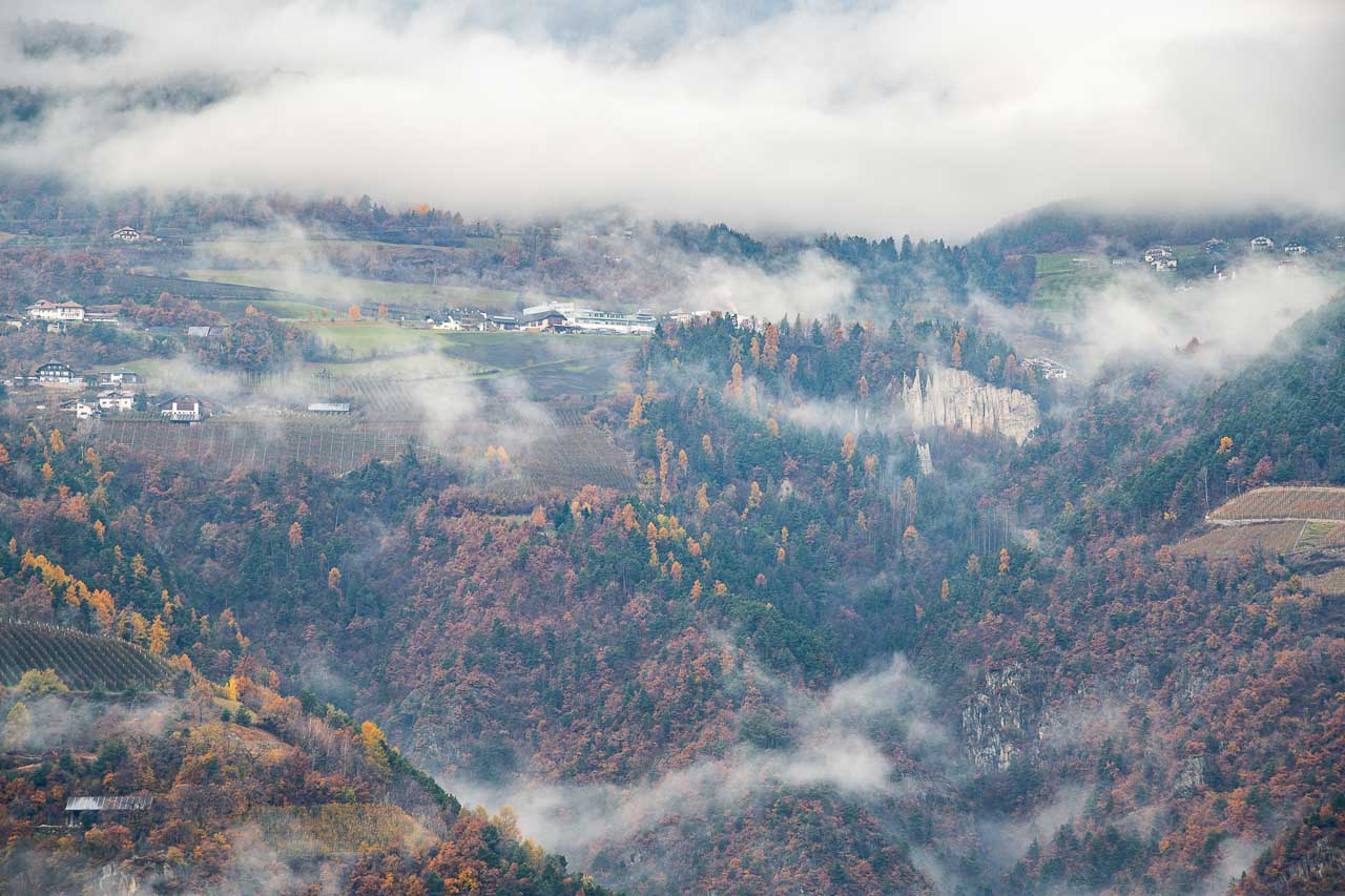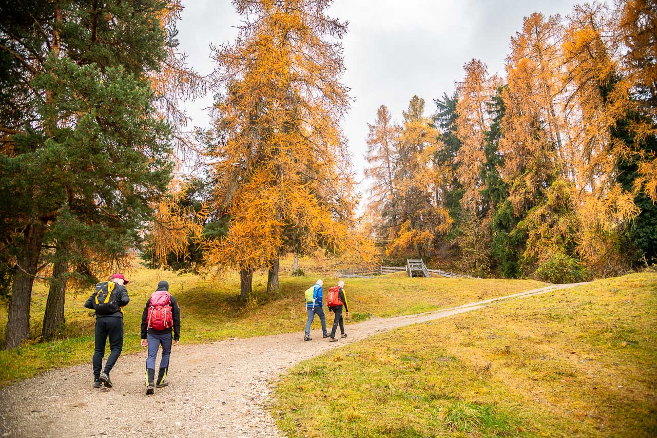 Ein gelb-oranger Lärchenwald und der nebelige Blick hinunter nach Völs am Schlern versüßen den ästhetischen Genuss. Das ist allerdings eher mein Ding – die anderen vier lechzen nach einem Gläschen.