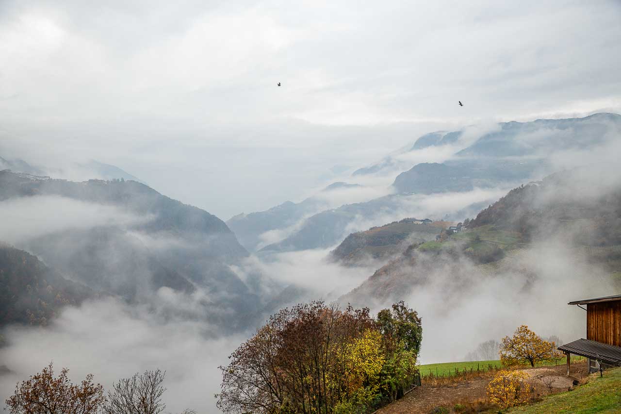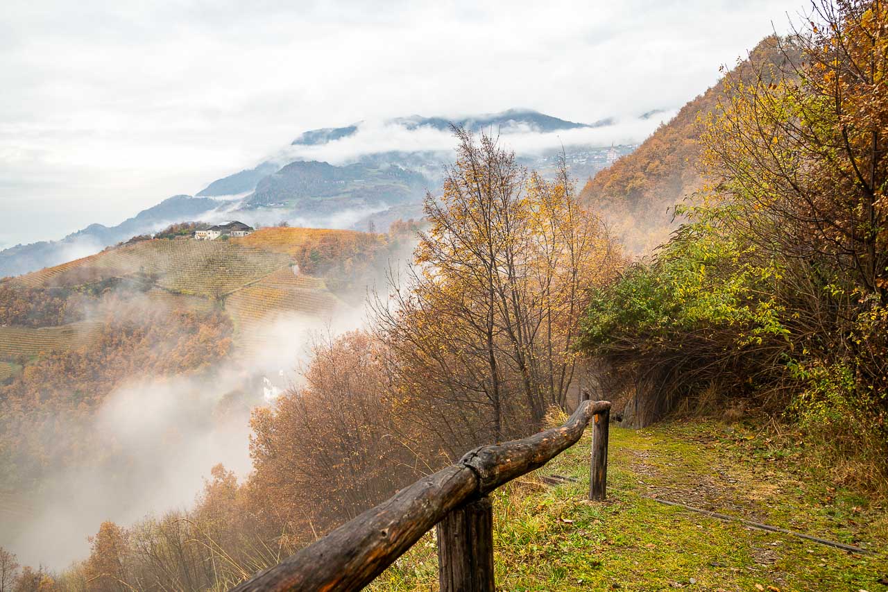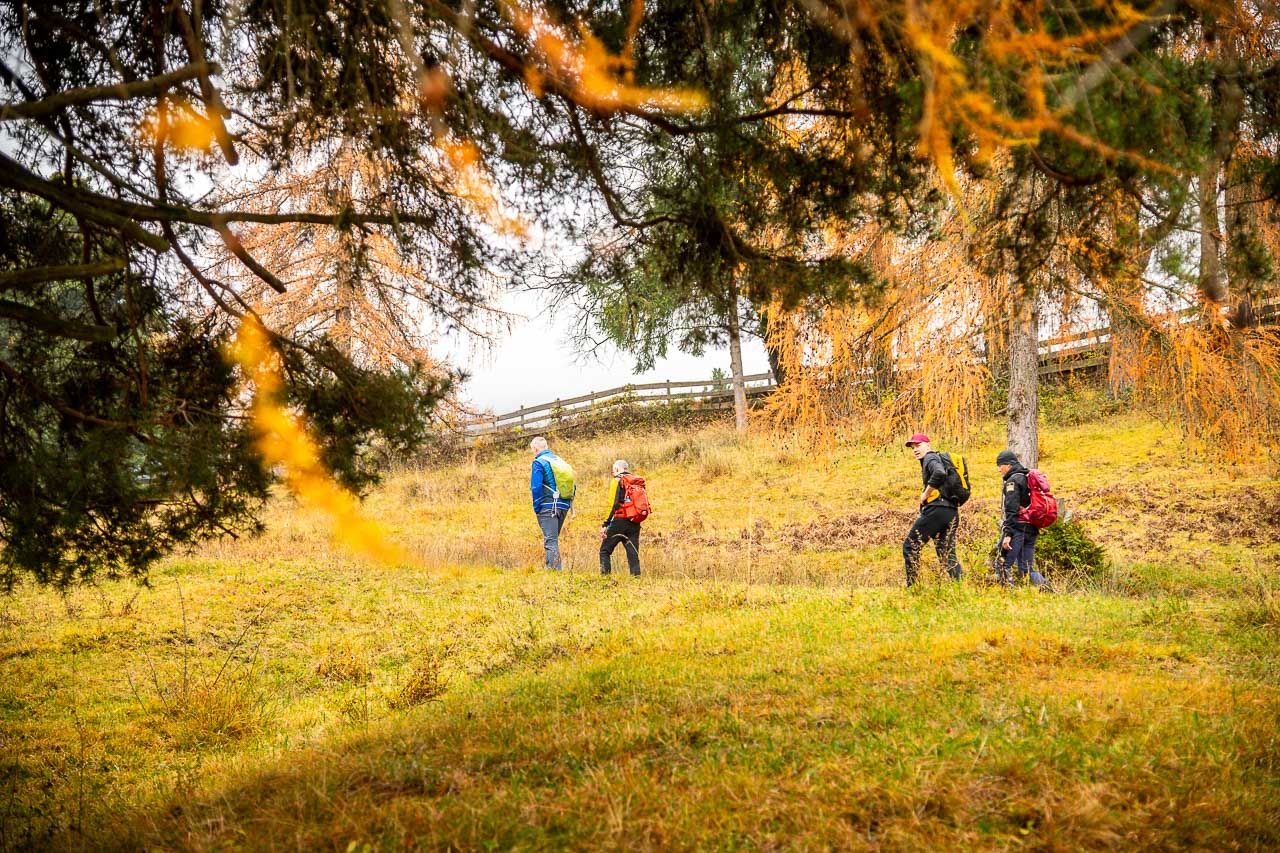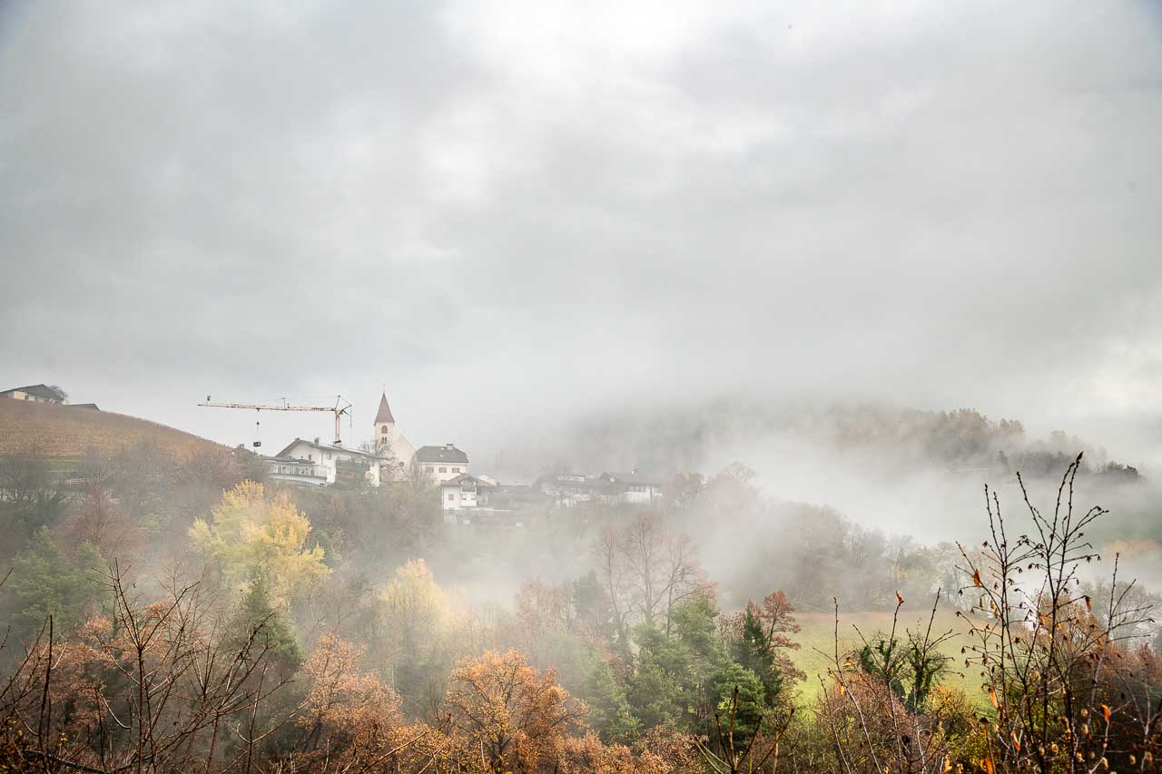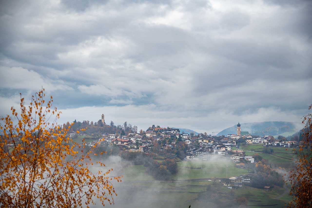 Ein gelb-oranger Lärchenwald und der nebelige Blick hinunter nach Völs am Schlern versüßen den ästhetischen Genuss. Das ist allerdings eher mein Ding – die anderen vier lechzen nach einem Gläschen.