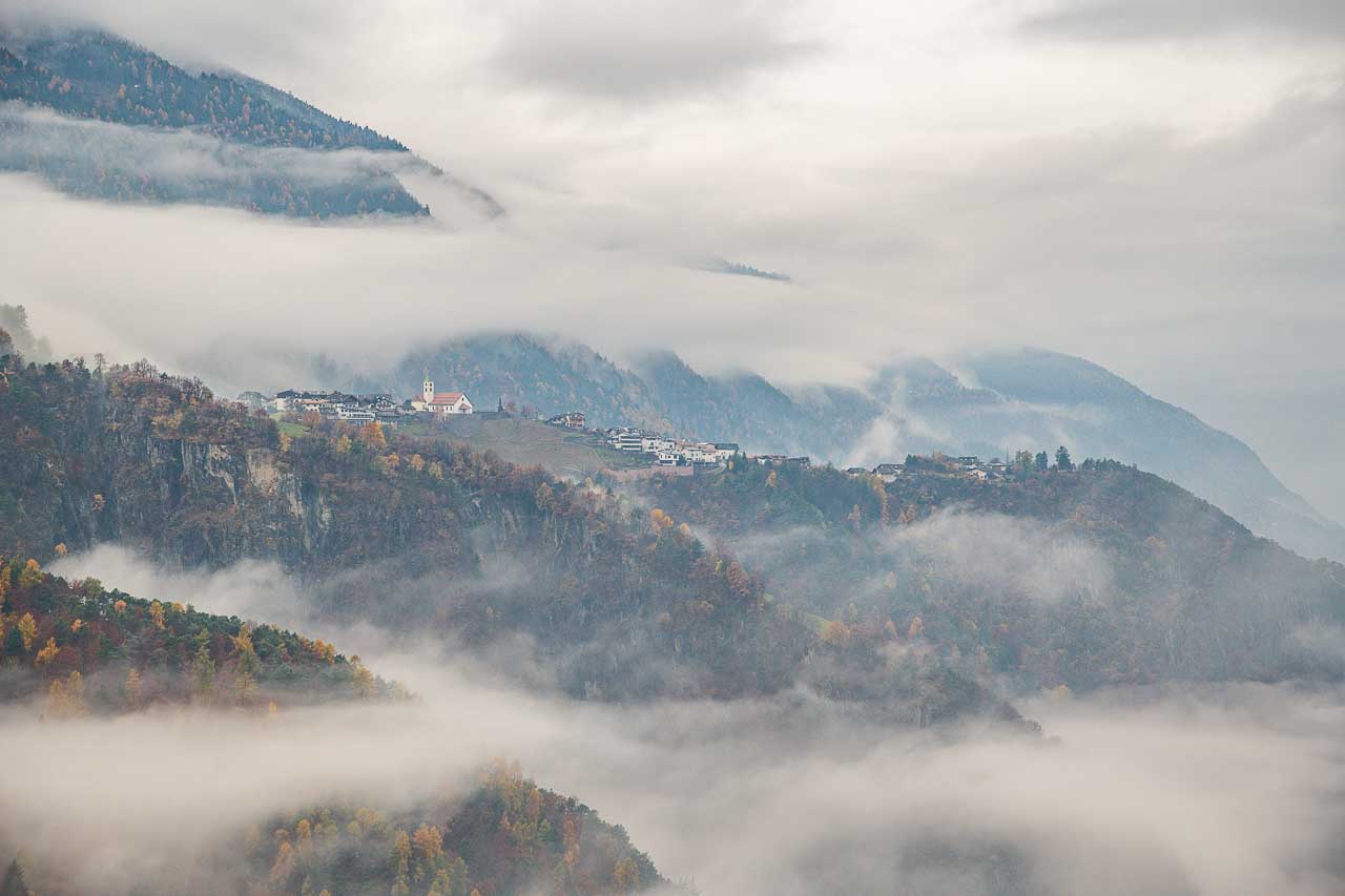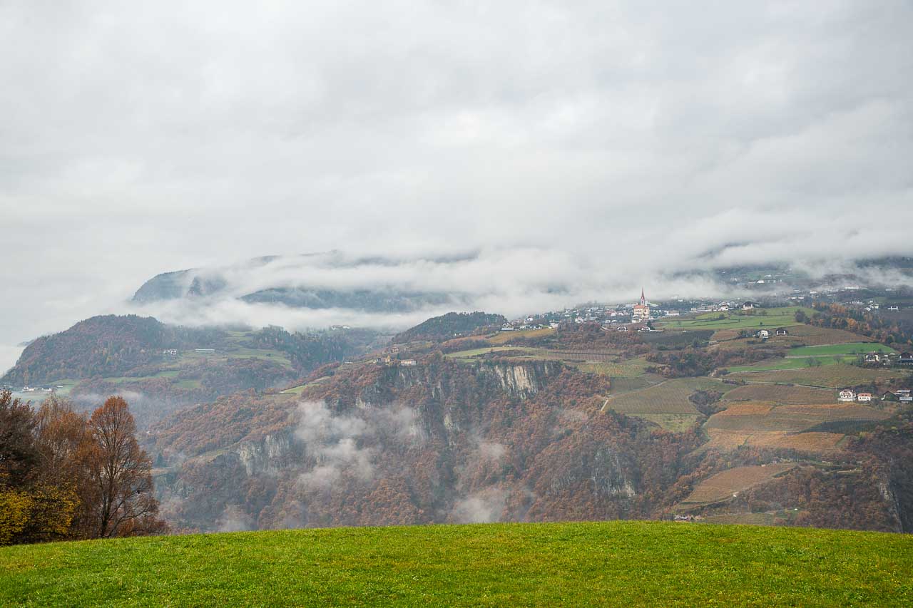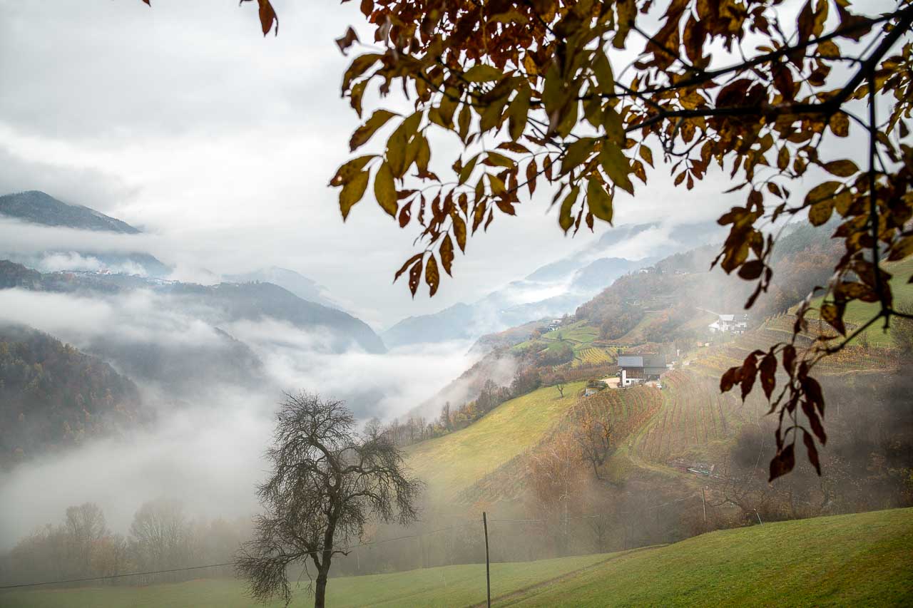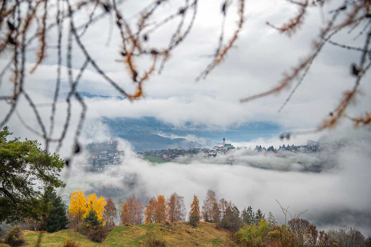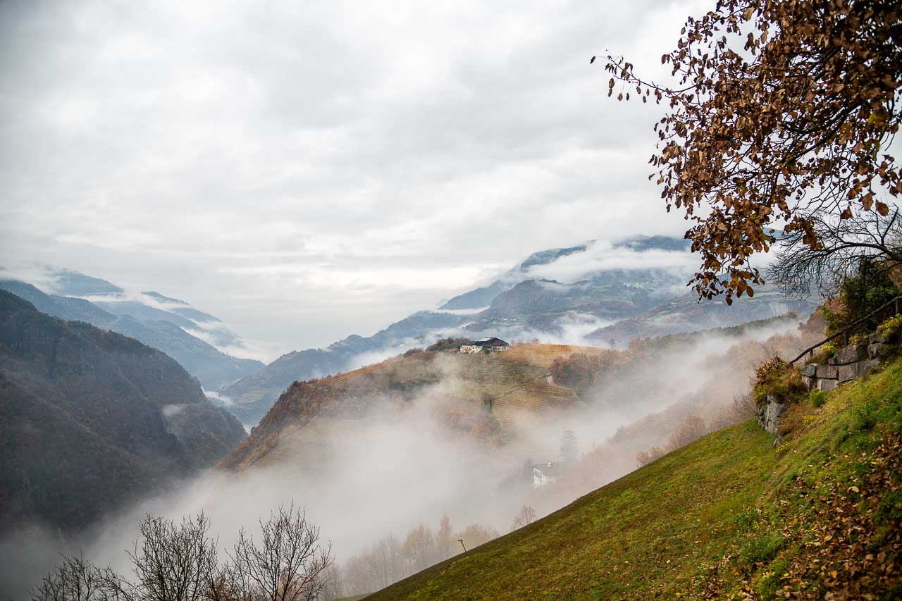 Ein gelb-oranger Lärchenwald und der nebelige Blick hinunter nach Völs am Schlern versüßen den ästhetischen Genuss. Das ist allerdings eher mein Ding – die anderen vier lechzen nach einem Gläschen.
