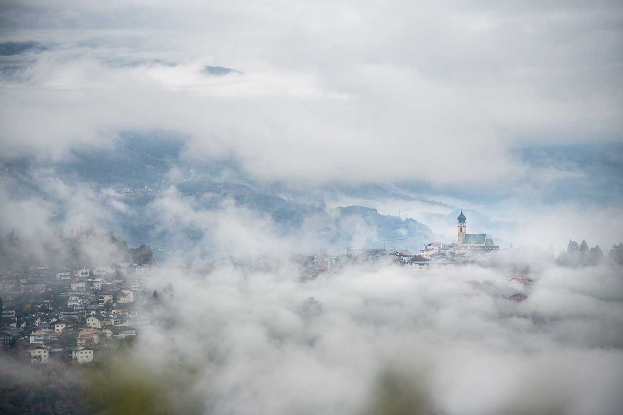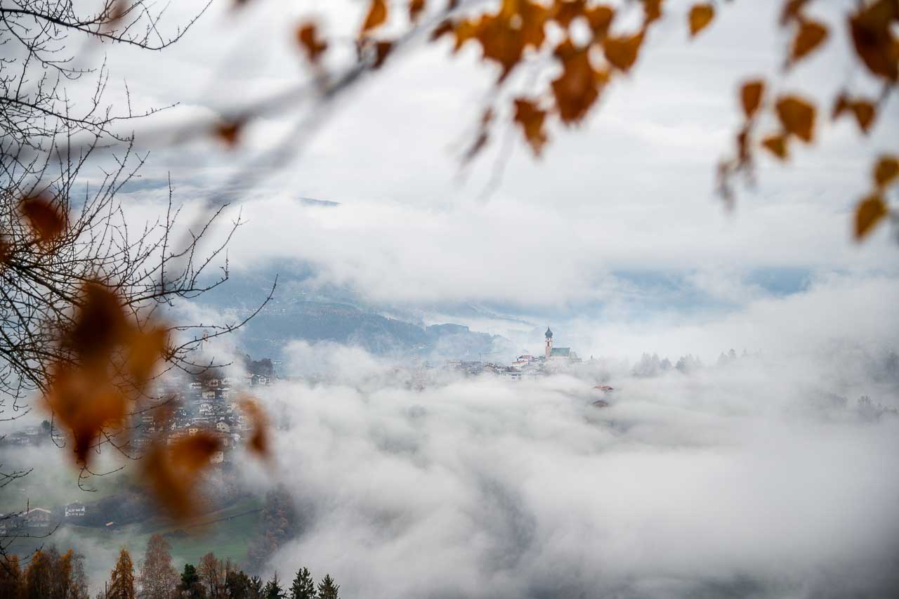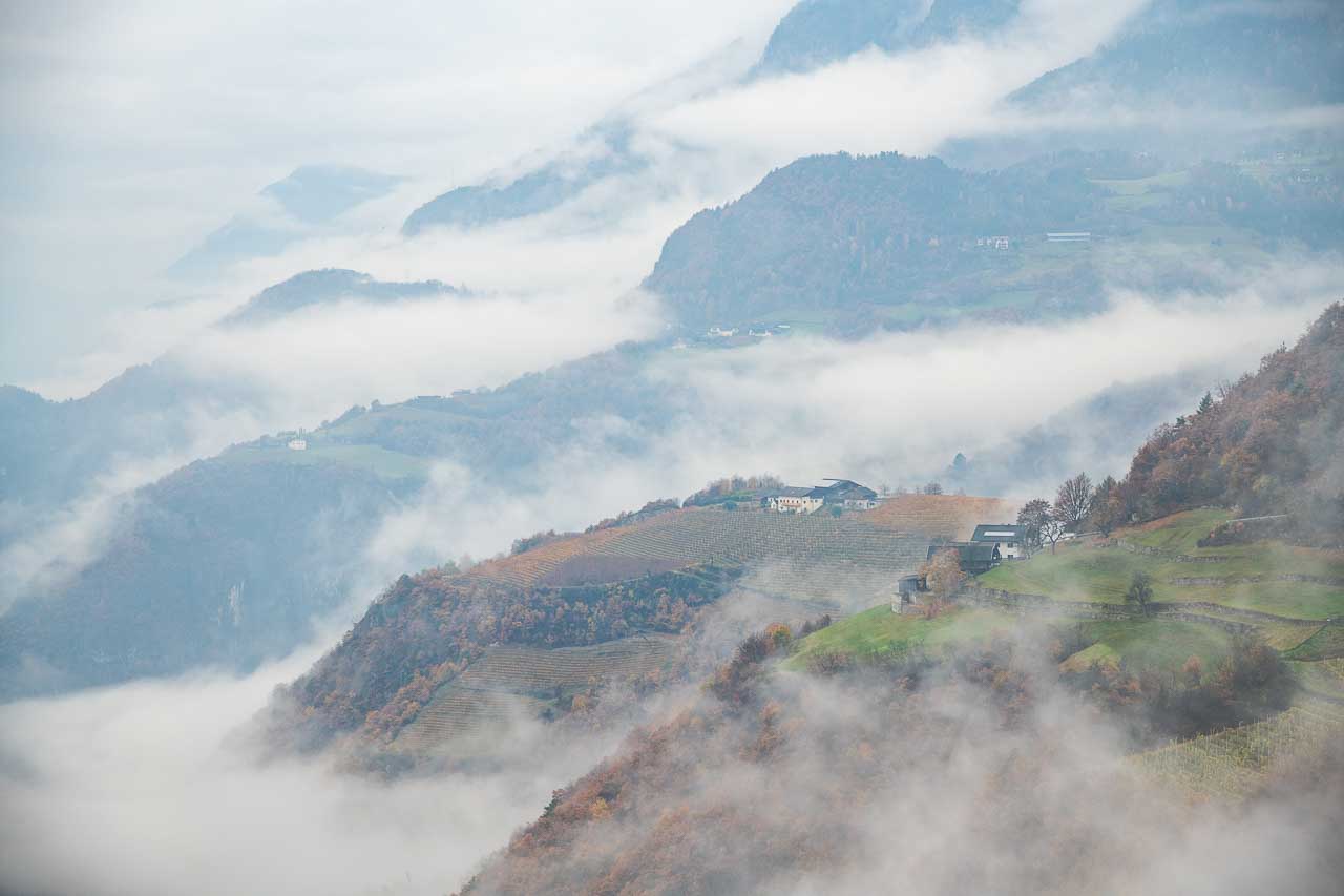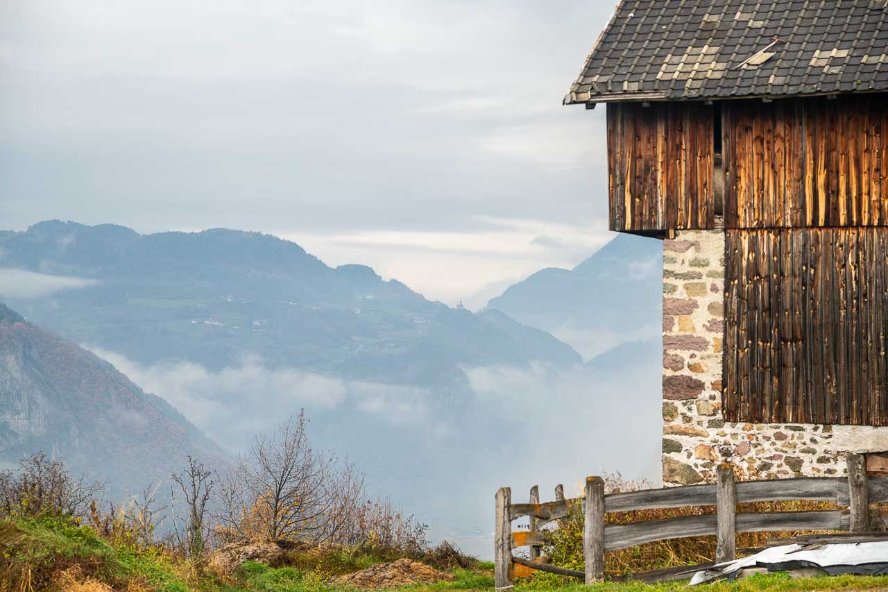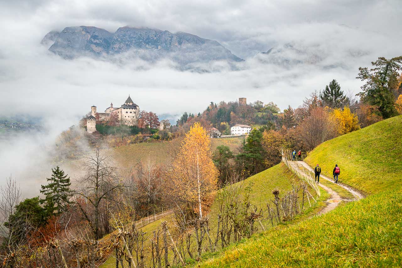 Ein gelb-oranger Lärchenwald und der nebelige Blick hinunter nach Völs am Schlern versüßen den ästhetischen Genuss. Das ist allerdings eher mein Ding – die anderen vier lechzen nach einem Gläschen.