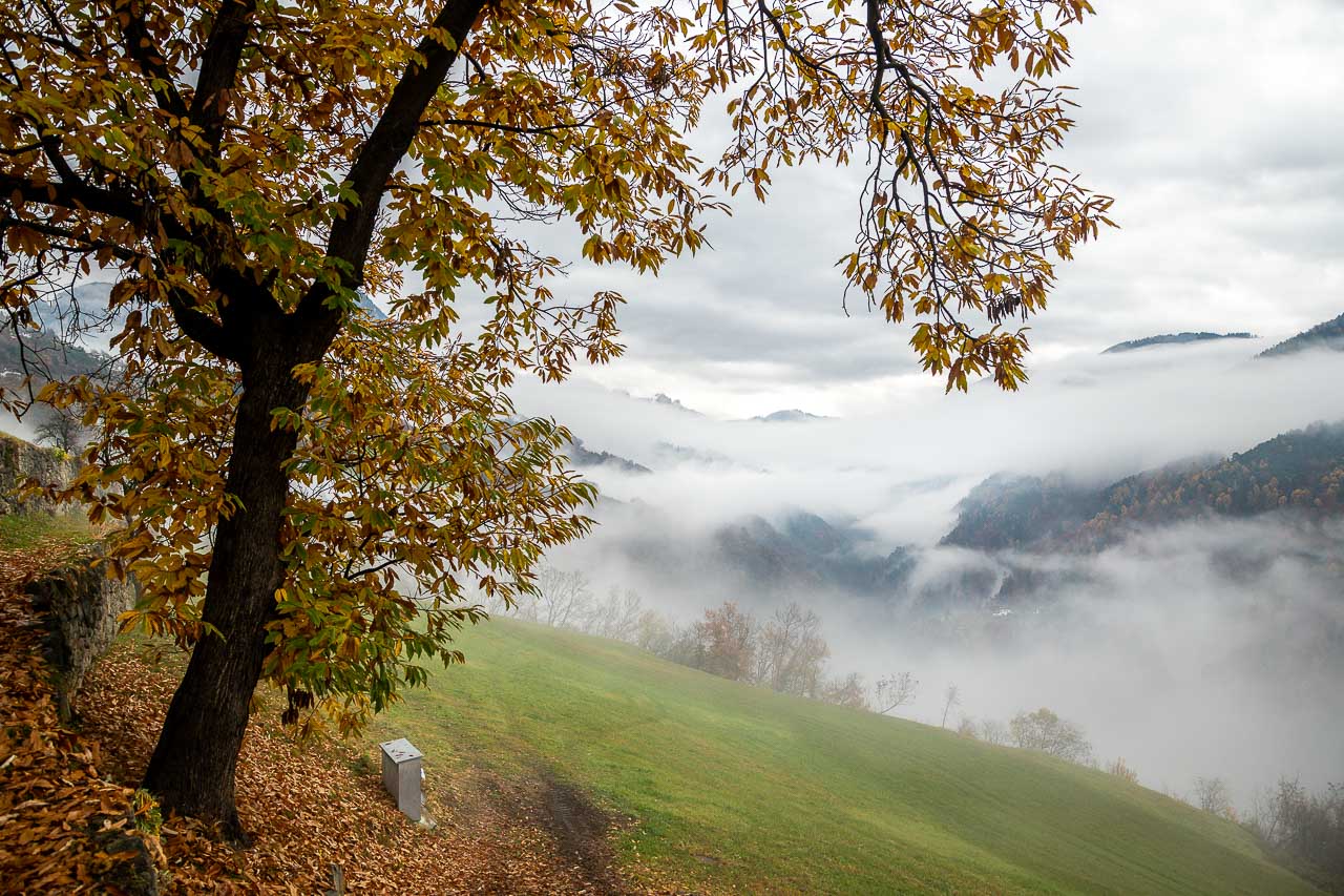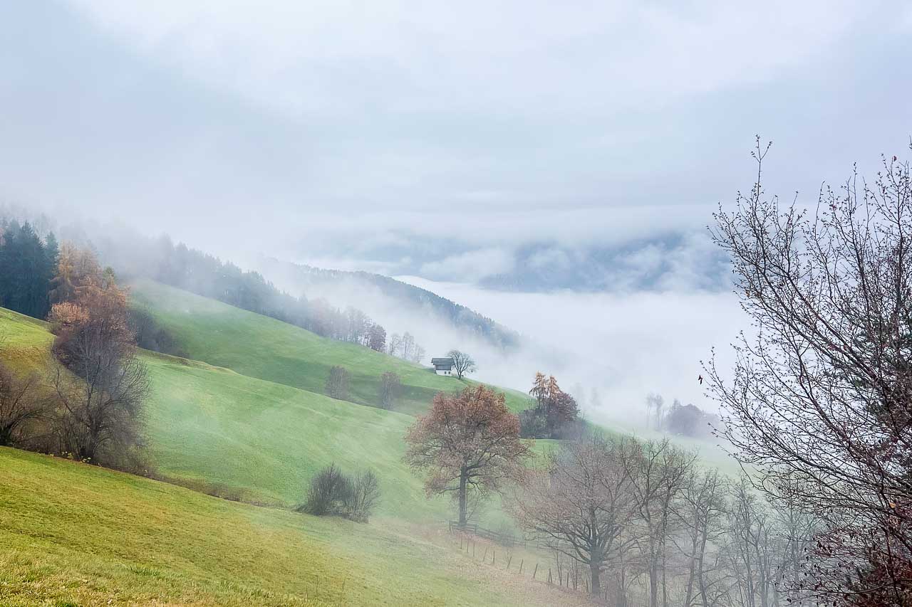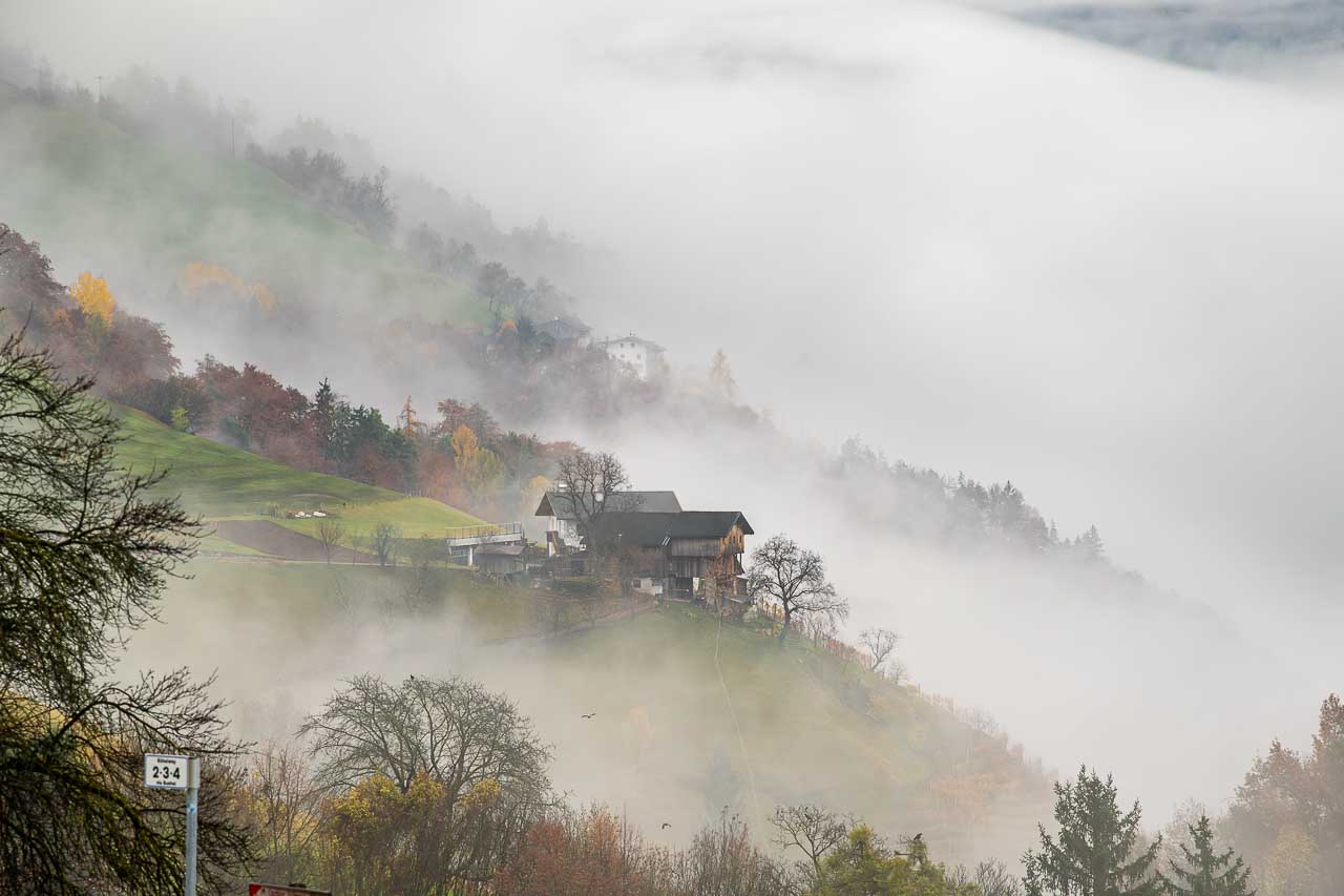 So dürfen wir trockenen Fußes starten. Nebelbilder haben für mich etwas ungemein Faszinierendes: Dort lugt ein Hof aus der weißen Wand, weiter hinten ragt der Kirchturm von Steinegg über die Schwaden, und hier setzen ein paar gelbe Blätter kleine Farbtupfer ins monotone Grau. Mir gefällt’s.