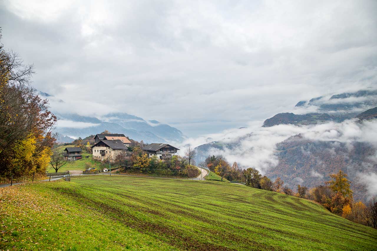 So bleibt uns nichts anderes übrig, als mit langen Gesichtern über den Gfellweg, vorbei am Bauernhof Mongadui, Richtung Tierser Straße hinunterzuwandern. Dabei übersehen wir leider die Abzweigung nach links auf den 5er-Weg, der uns über den Völser Höfeweg unterhalb der Tierser Straße direkt bis zum Fronthof – unserem Ziel etwas unterhalb von Oberaicha – gebracht hätte. Schade. Andererseits nieselt es inzwischen, also sind wir froh, eine kürzere Verbindung nach Oberaicha zu ergattern.
