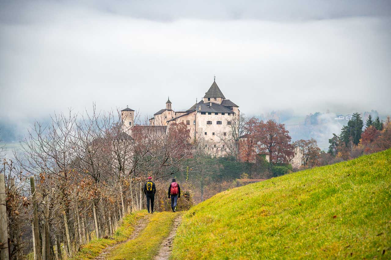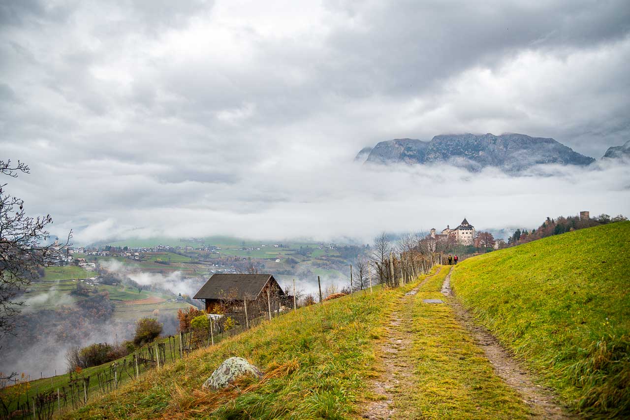 Wir treten aus dem Wald heraus. Der Blick auf Völs öffnet sich. Bald können wir auch Schloss Prösels in voller Pracht erblicken. Diese Aussicht begleitet uns, bis wir ins in Prösels ankommen.