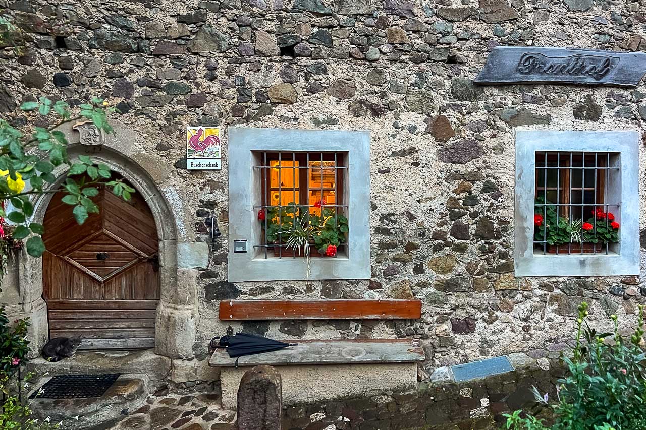 Rechts steht ein sogenannter Wirtskeller, davor eine Informationstafel. (Ich schreibe den Text der Infotafel leicht um, weil er etwas holprig formuliert ist.)