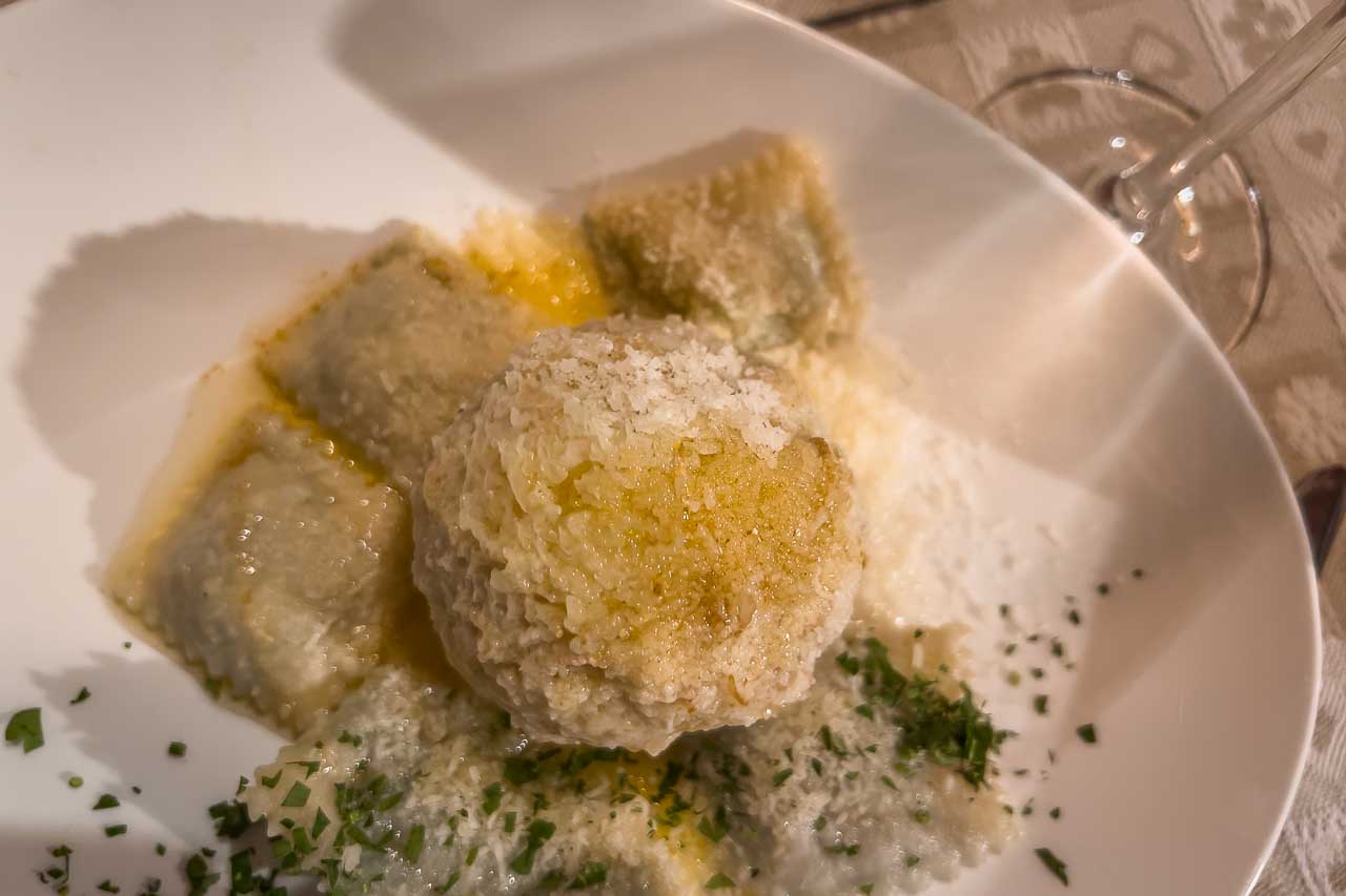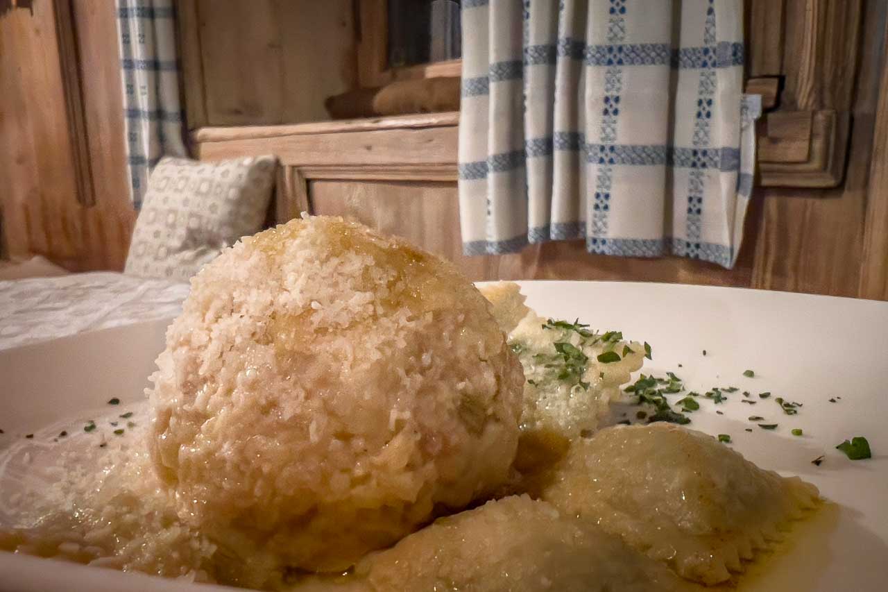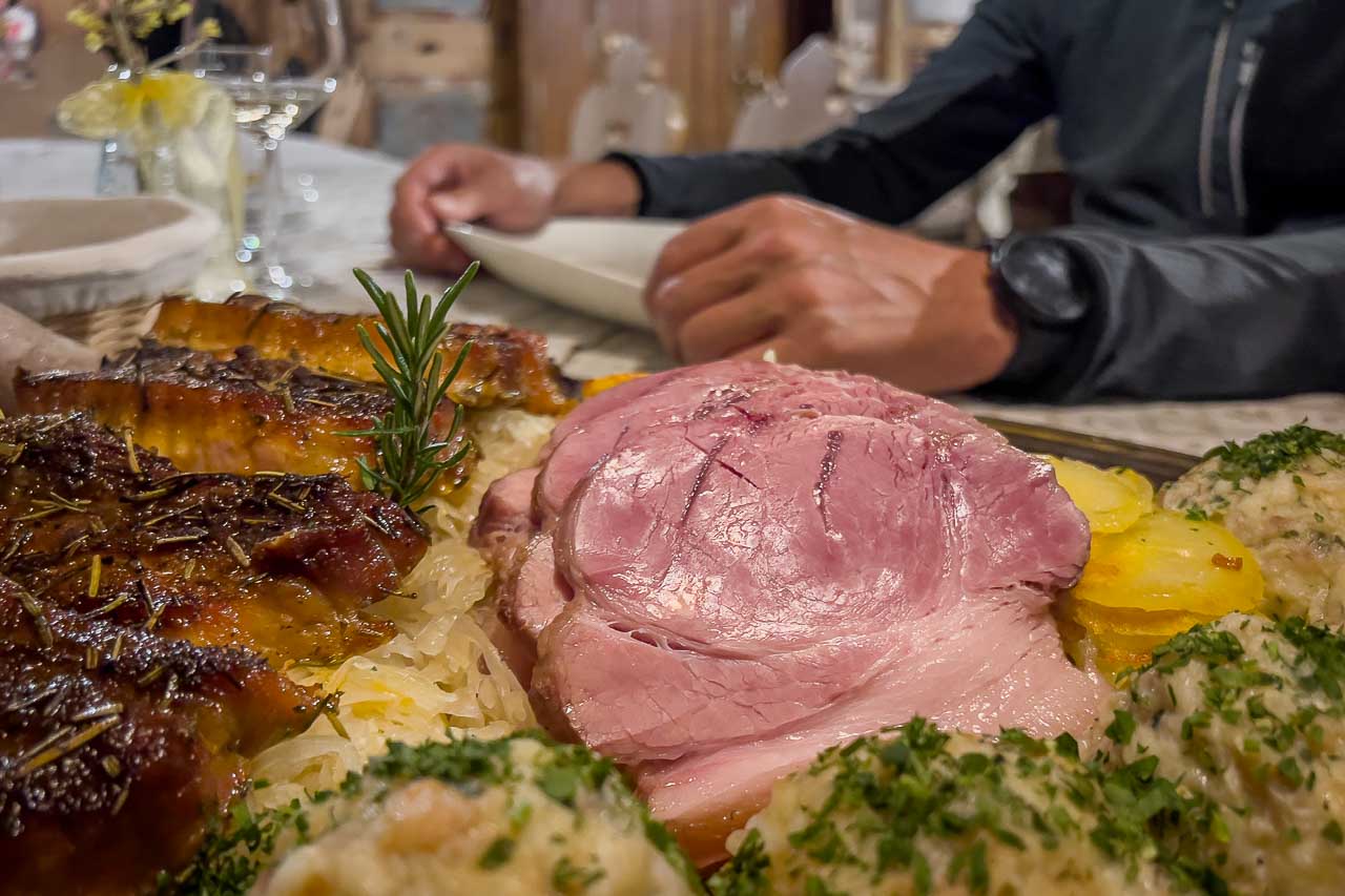 Was soll ich sagen: Als Antipasto eine Variation aus hausgemachtem Speck von den eigenen Schweinen, als Vorspeise Knödel und Schlutzer, dazu Surfleisch, Rippelen, Kraut und geröstete Kartoffeln – und für jene, die’s mögen, sogar eine Blutwurst. Zum Abschluss köstliche Krapfen und natürlich Kastanien. Kastanien, die sich leicht schälen lassen und geschmacklich überzeugen.