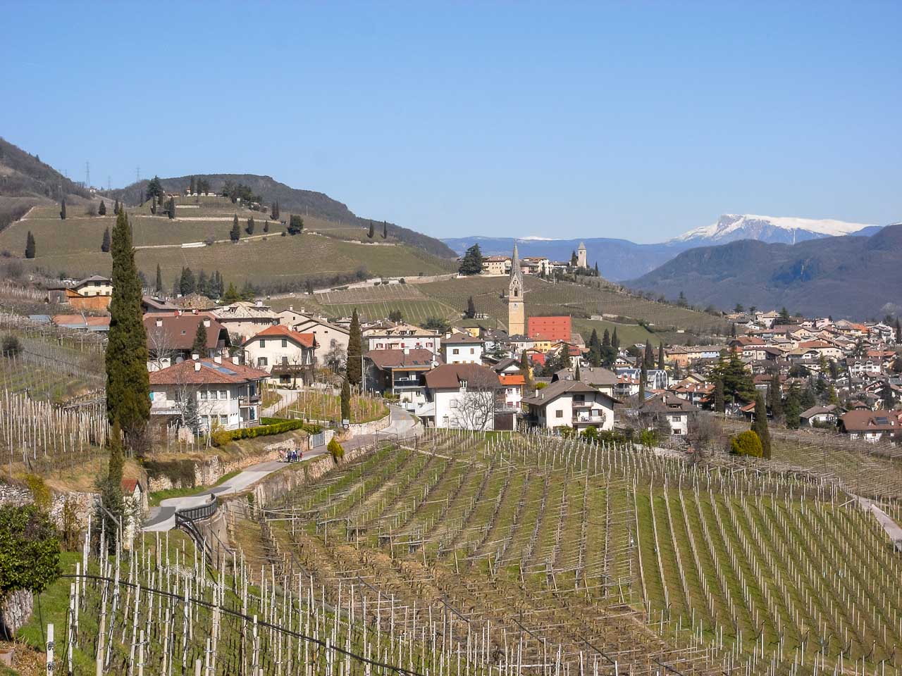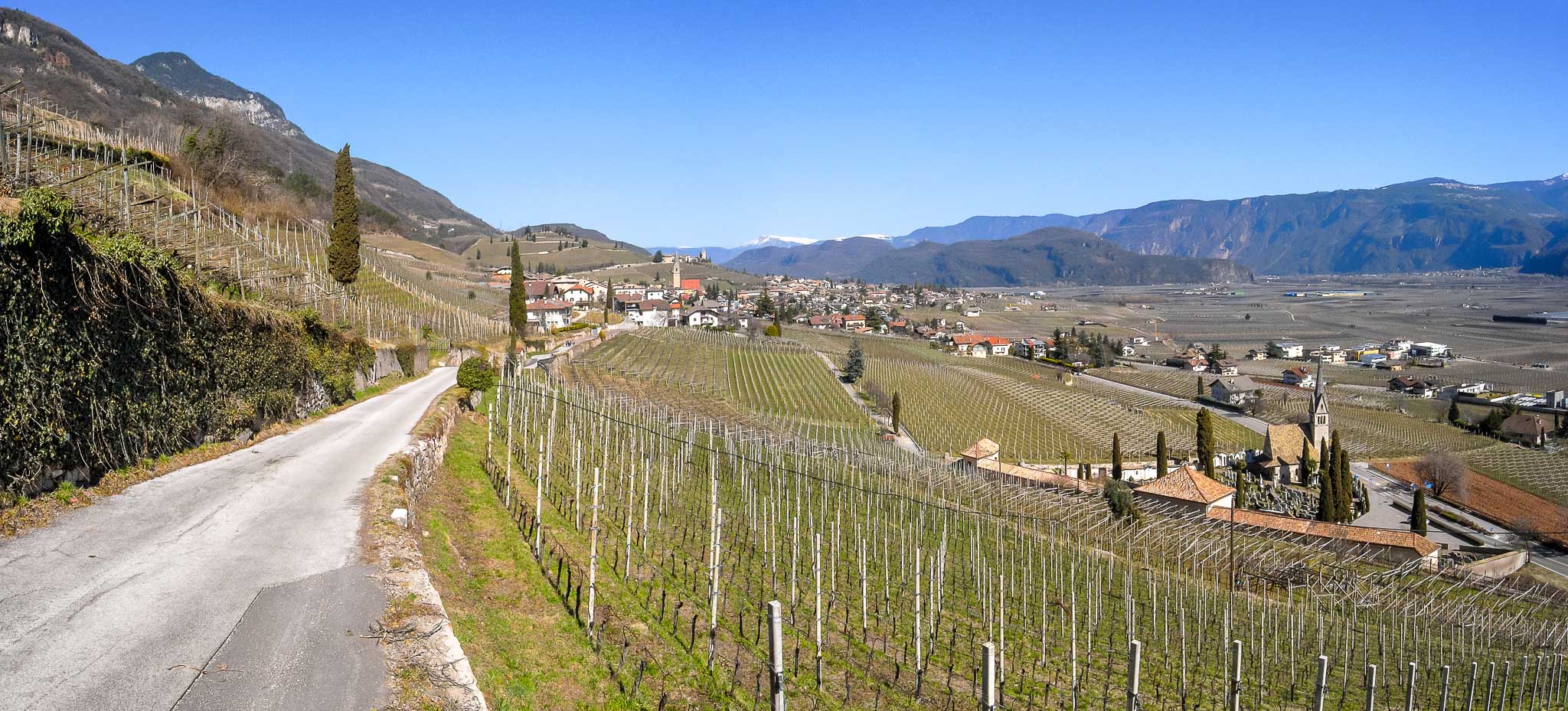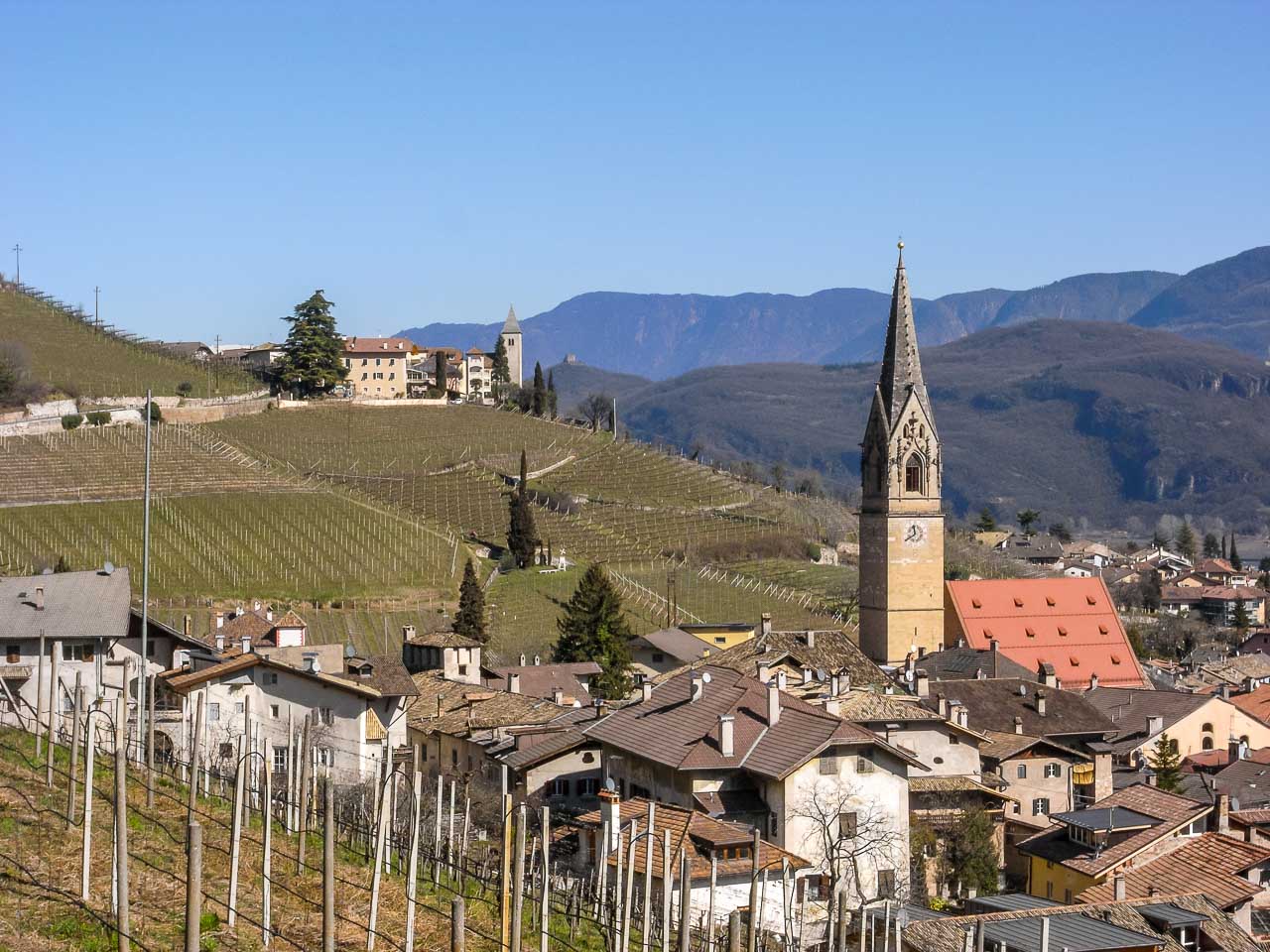 Wir möchten über Rungg nach Kurtatsch, haben aber keine Lust, immer den gleichen Weg zu gehen. Darum biegen wir kurz entschlossen rechts ab und spazieren über den mit Kopfstein gepflasterten Weg bis in die Weinberge hinauf. Hier haben wir einen tollen Ausblick auf den Weinberg Kastelaz, das Kastelaz-Kirchlein und die Traminer Pfarrkirche mit dem höchsten gemauerten Kirchturm Tirols. Darauf sind wir Traminer natürlich besonders stolz. Das musste ich mal loswerden. 😉