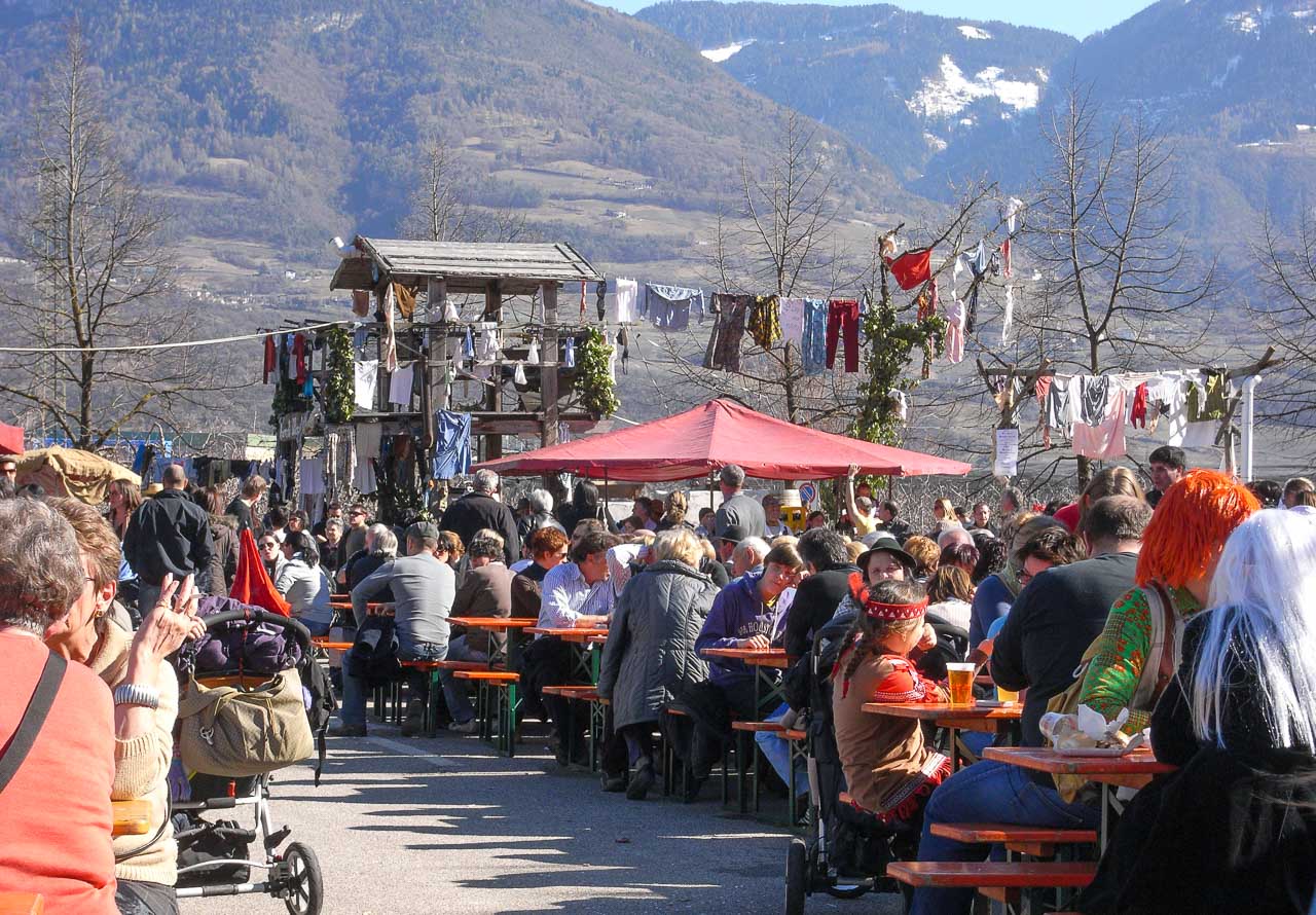 Bis jetzt ein gemütlicher Sonntagsspaziergang, den wir, nein, ich, mit einer Mahlzeit abschließen will. An der Kreuzung Tramin/Auer wird rechts abgebogen und bis zur neuen Handwerkerzone Tramin hinuntergegangen. Von hier wandern wir flach den Choleraweg entlang bis zum Sportplatz Tramin, wo schon der Faschingstrubel auf uns wartet.