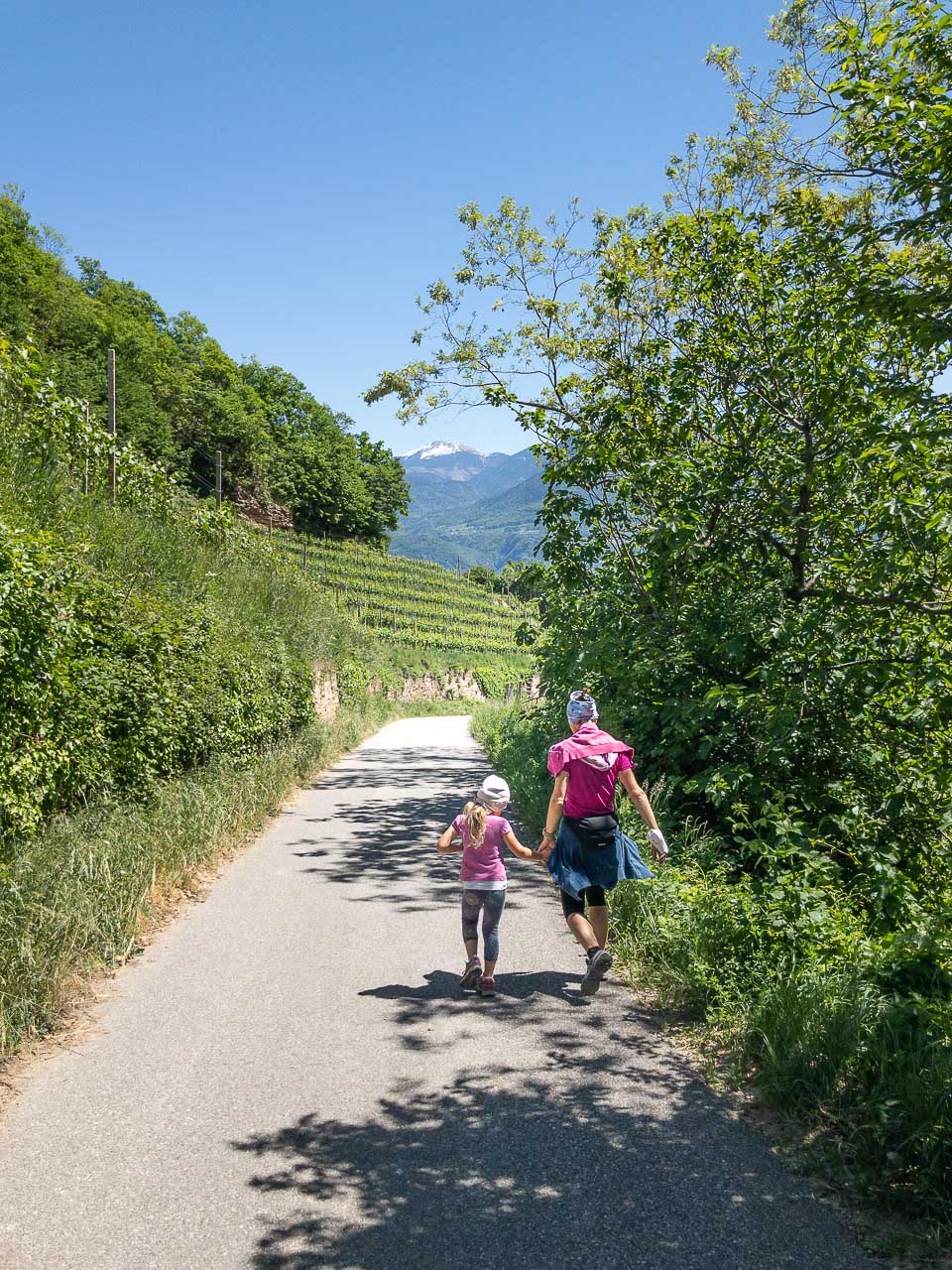 Täglicher Wandersport, jeden Tag, zur Mittagszeit. Zuerst den steilen 6er Steig hinauf zur Zoggler-Wiese und dann gemütlich über den Traminer Geoweg durch das Höllental zurück zum Mandlhof. Mittlerweile kennen wir jeden Stein, jede Wurzel auswendig. Nur selten ändern wir diese erprobte, seit Corona bei uns eingebürgerte, Wanderrunde. Wenn die Lust auf Steigung fehlt, was recht nicht oft passiert, dann geht es „nur“ den flachen Kastelazweg hinaus nach Kurtatsch und zurück und wenn aufgrund des Wochenende eine zeitliche Verlängerung möglich ist, dann wandern wir von der „Zogglerstange“ nicht direkt den 10 Weg hinunter nach Tramin, sondern verlängern die Runde über den Wanderweg 4B nach Altenburg, um dann über Söll zurück zum Mandlhof zu gelangen.