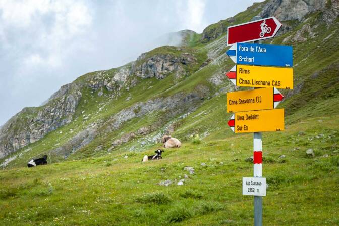 Hier rätseln wir ein wenig, ob wir bis Sur En weitergehen oder uns hier niederlassen sollen? Man rät uns, nicht bis zum Weiler Sur En hinunterzugehen, denn das wären circa 600 Höhenmeter und 6,5 km. Außerdem handelt es sich wohl um einen Fahrweg, der zwar für Mountainbiker sehr interessant sei, auf Wanderer aber eher etwas langweilig wirken könnte.