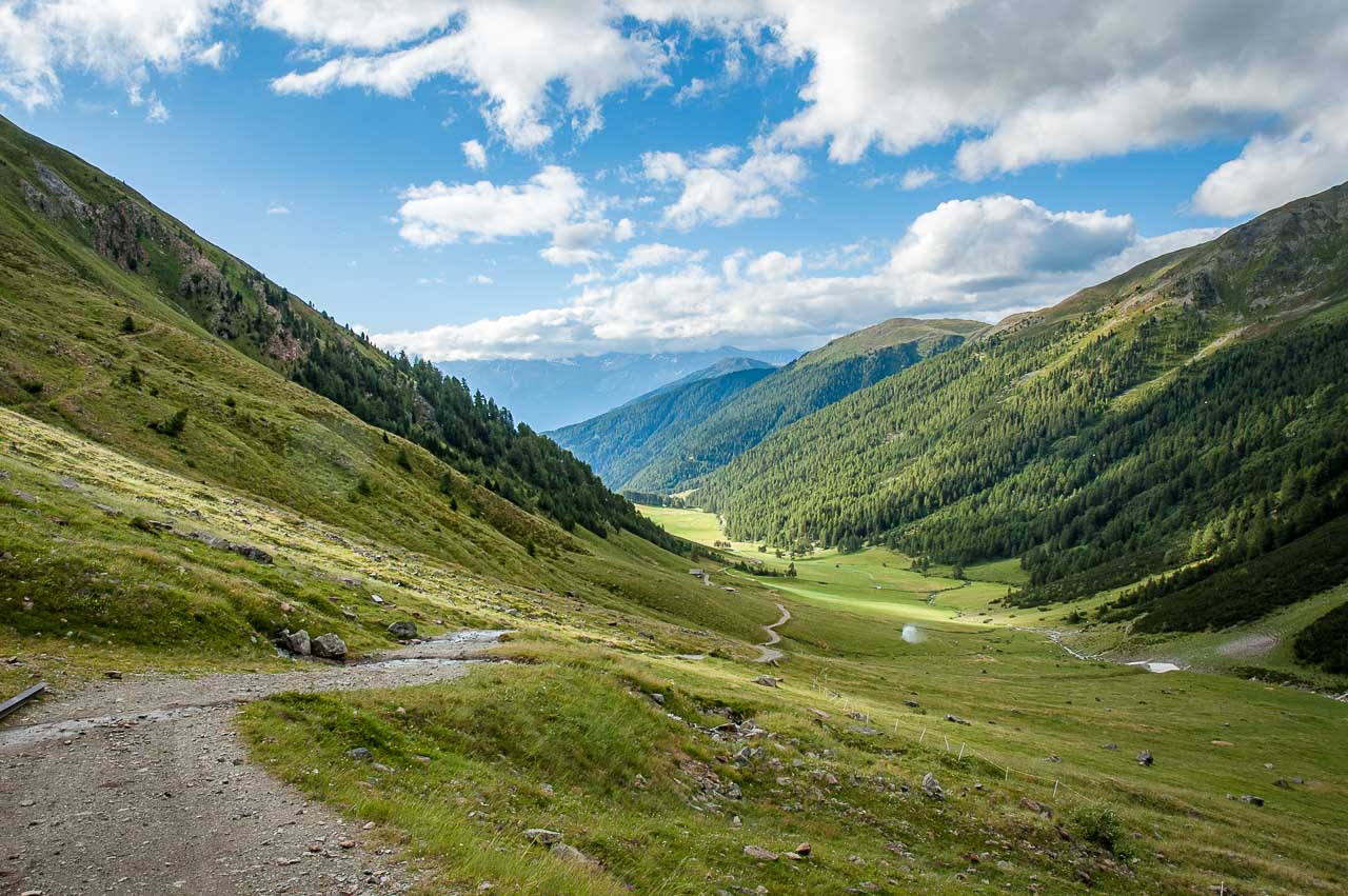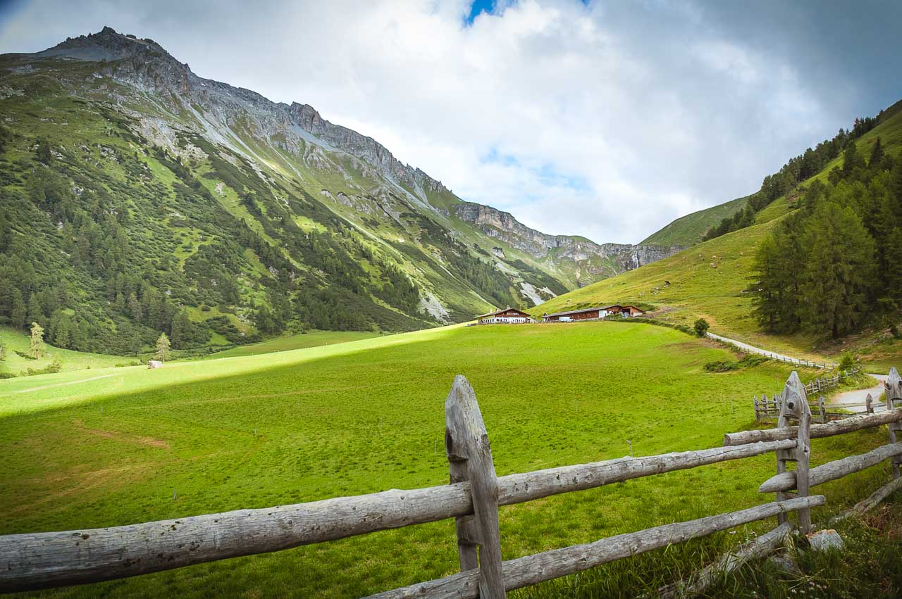 Genau so ist es. Bei der Schlinig Alm angekommen verspüren wir angenehme 22°, machen kurz Halt auf einen Kaffee und wandern anschließend über die einspurige leicht befahrene Straße zurück nach Schlinig.