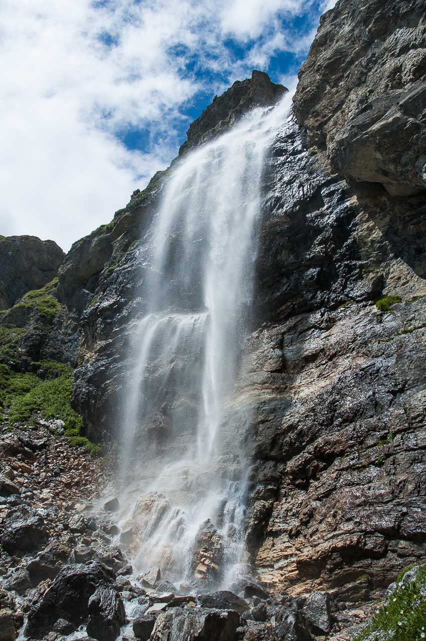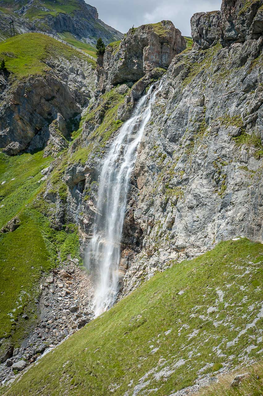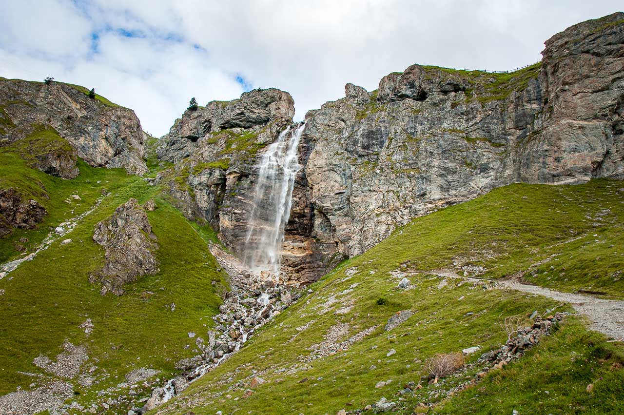 Ab der Schliniger Alm ist unser Wanderweg zwar immer noch befahrbar breit, aber glücklicherweise hat der Asphalt einem Schotteruntergrund Platz gemacht. Der Weg wird zunehmend steiler und schlängelt sich zum Schluss, rechts eines Wasserfalles, mit einem ordentlichen Gefälle empor. Zu unserer Rechten, der Föllakopf, welcher mit 2.883 m die 3.000 Höhenmeter nur knapp verfehlt.