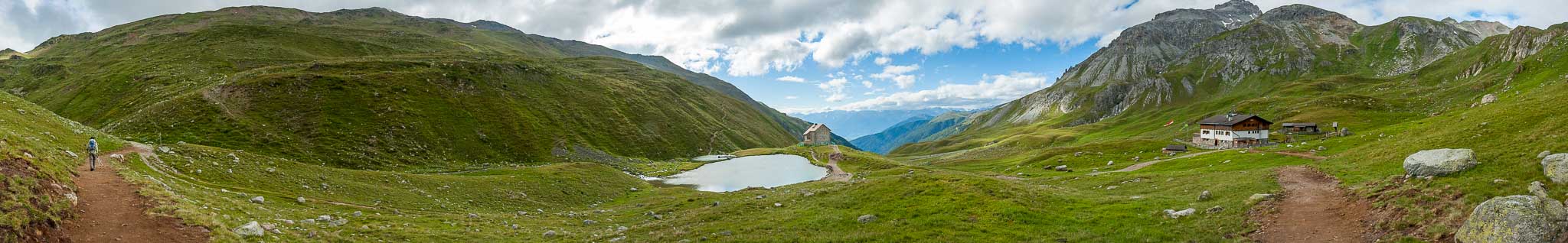 Oben angekommen trauen wir unseren Augen kaum. Da vorne ist ja schon die Pforzheimer Hütte und der Pforzheimer See und dort links drüben die Sesvenna Hütte. Kann das sein?