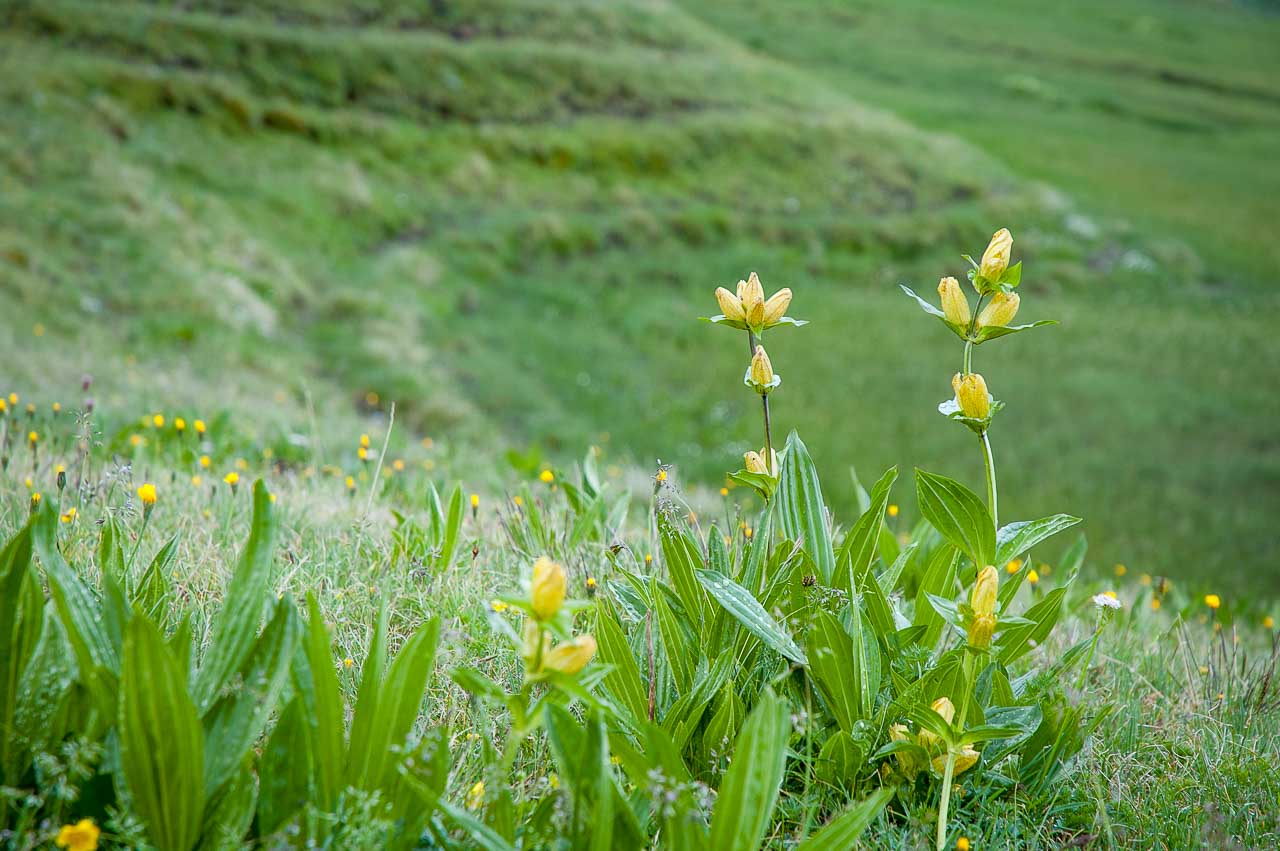 Der Schlinigpass ist als solcher fast nicht erkennbar. Kein typischer Pass auf einer Anhöhe, wir wandern mehr oder weniger flach durch das Biotop Niedermoor Unia. Auch die Schweizer Grenze nehmen wir fast nicht wahr. Nur einen „normalen“ Weidezaun und eine halbrunde kniehohe Mauer finden wir vor. Ist schon komisch…
