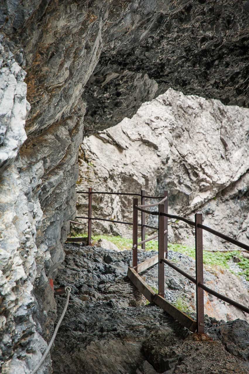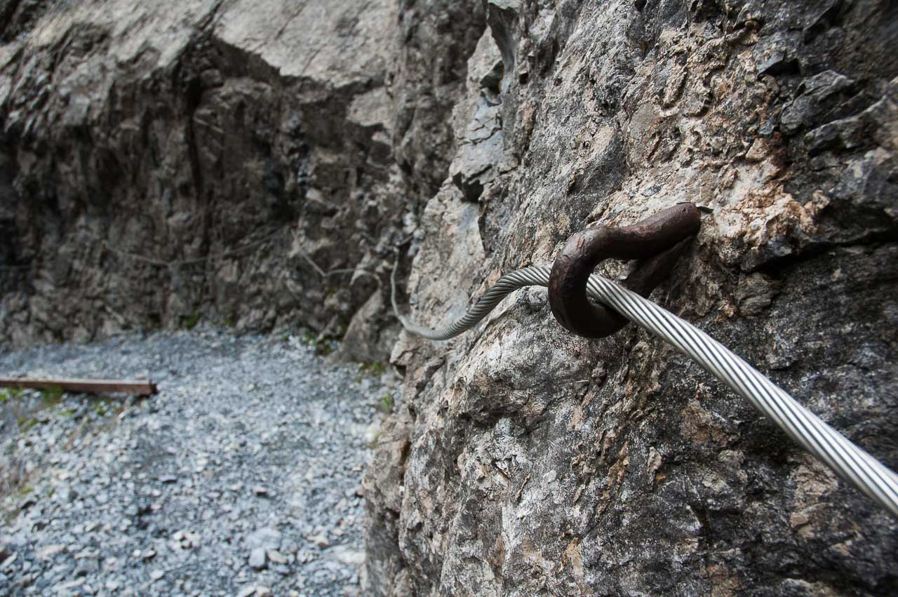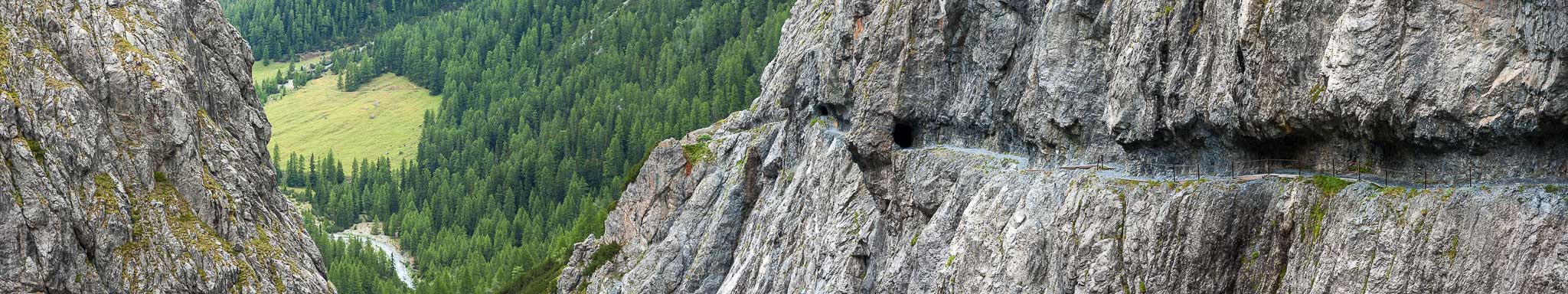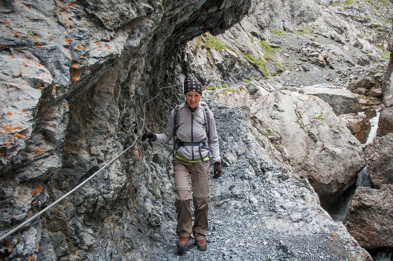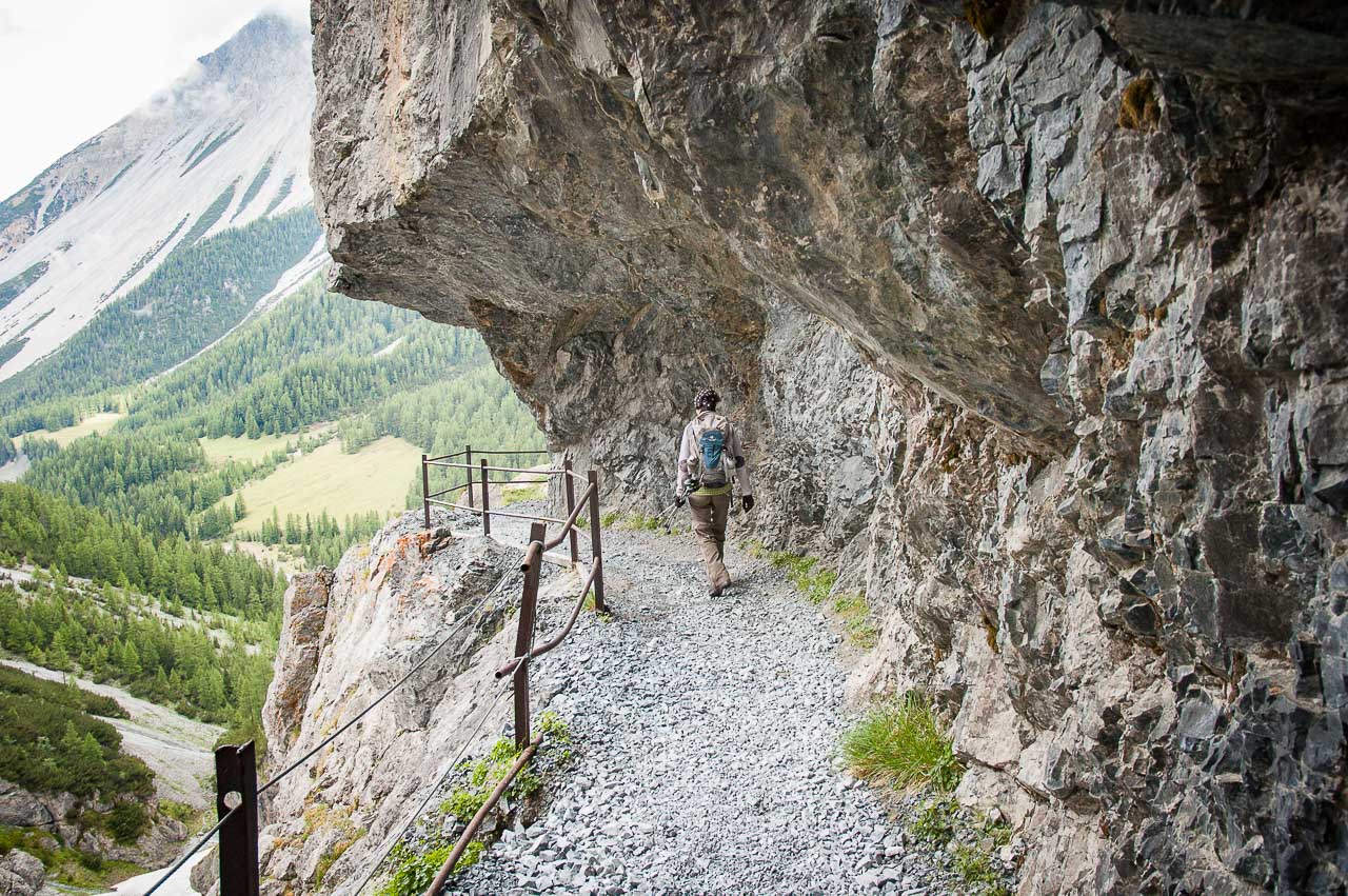 Der Steig ist zur Linken (Schlucht) mit einem Geländer und zur Rechten (Felswand des Piz da Gliasen) mit einem Drahtseil gesichert, sodass sogar die beste Ehefrau von allen keinen Anflug von Nervosität zeigt. Sie hat ein anderes Problem: Sie hat zu kalt!