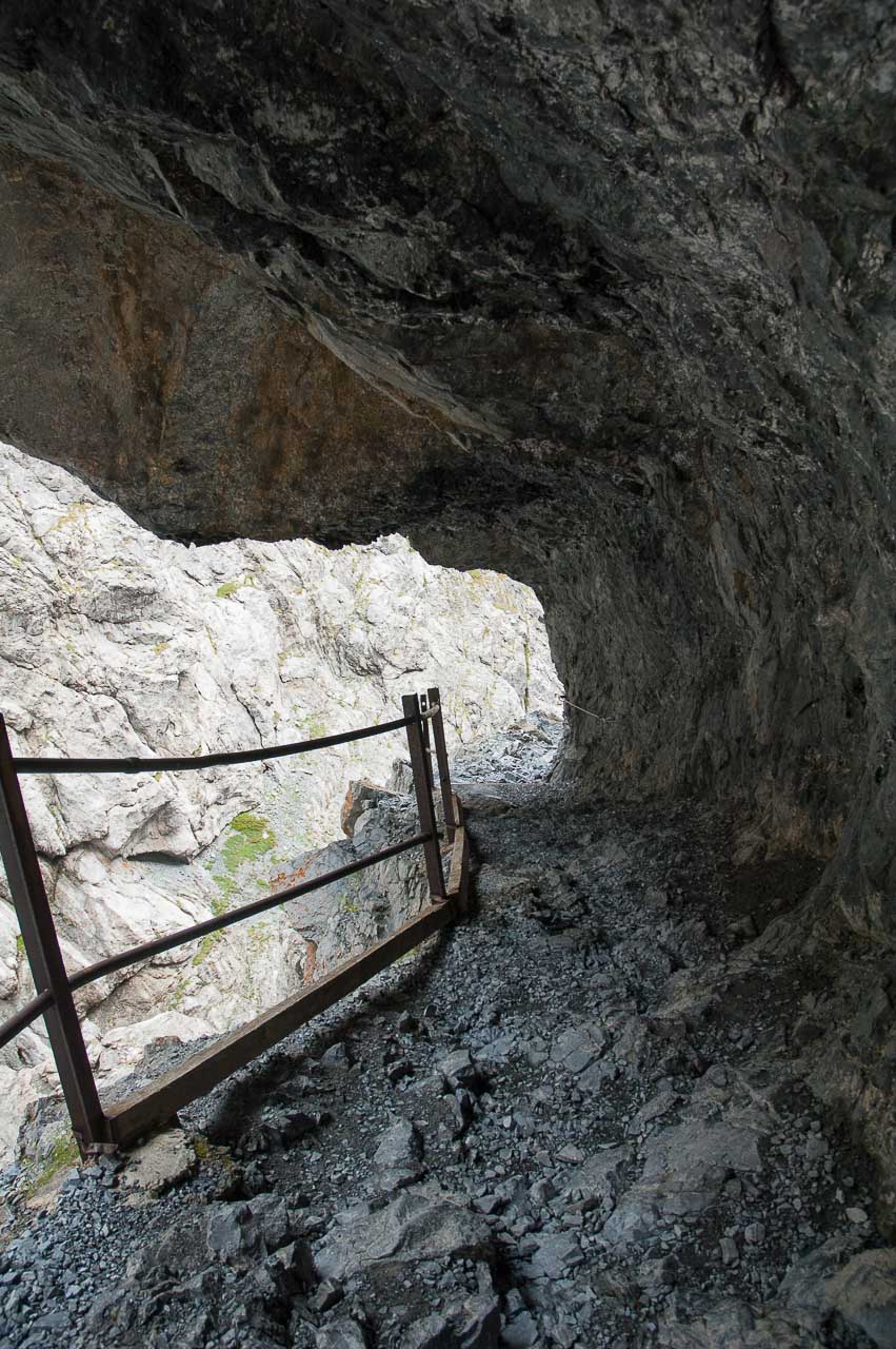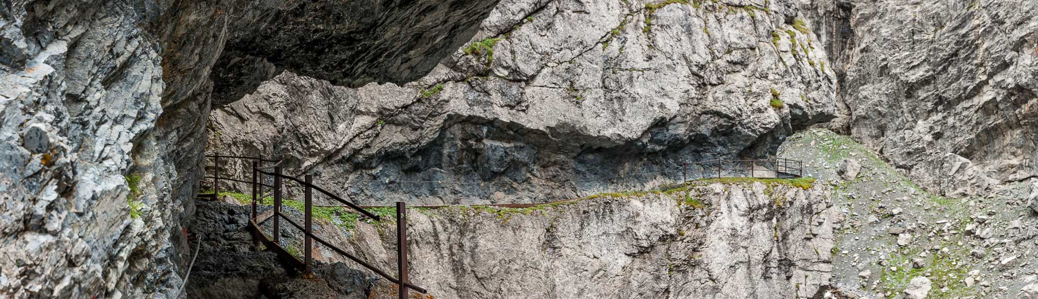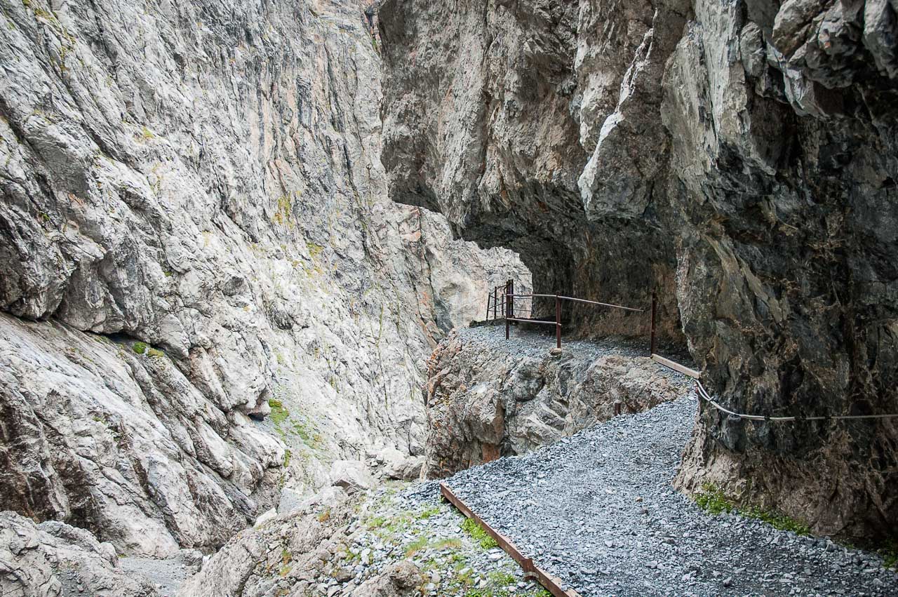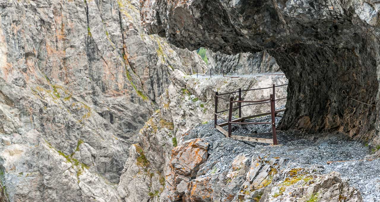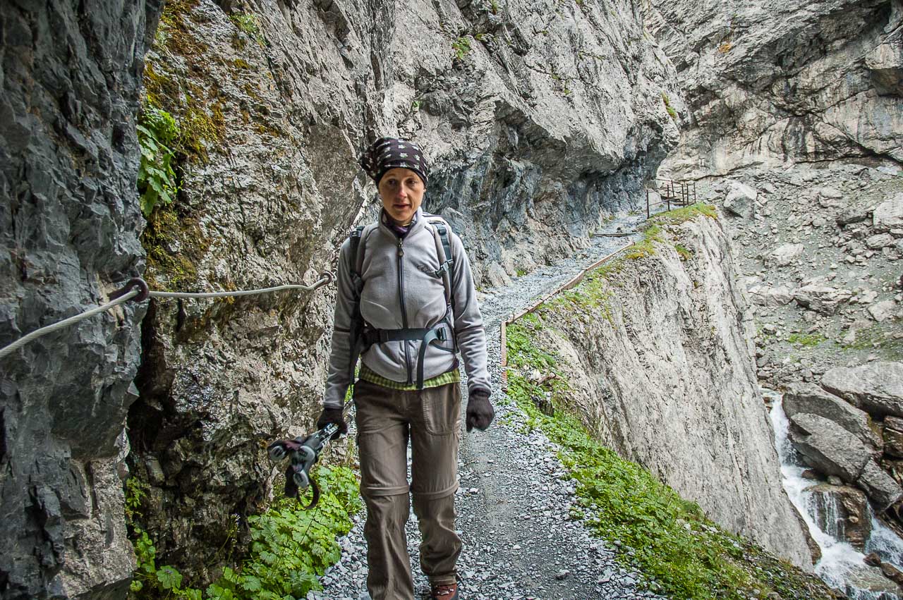 Der Steig ist zur Linken (Schlucht) mit einem Geländer und zur Rechten (Felswand des Piz da Gliasen) mit einem Drahtseil gesichert, sodass sogar die beste Ehefrau von allen keinen Anflug von Nervosität zeigt. Sie hat ein anderes Problem: Sie hat zu kalt!